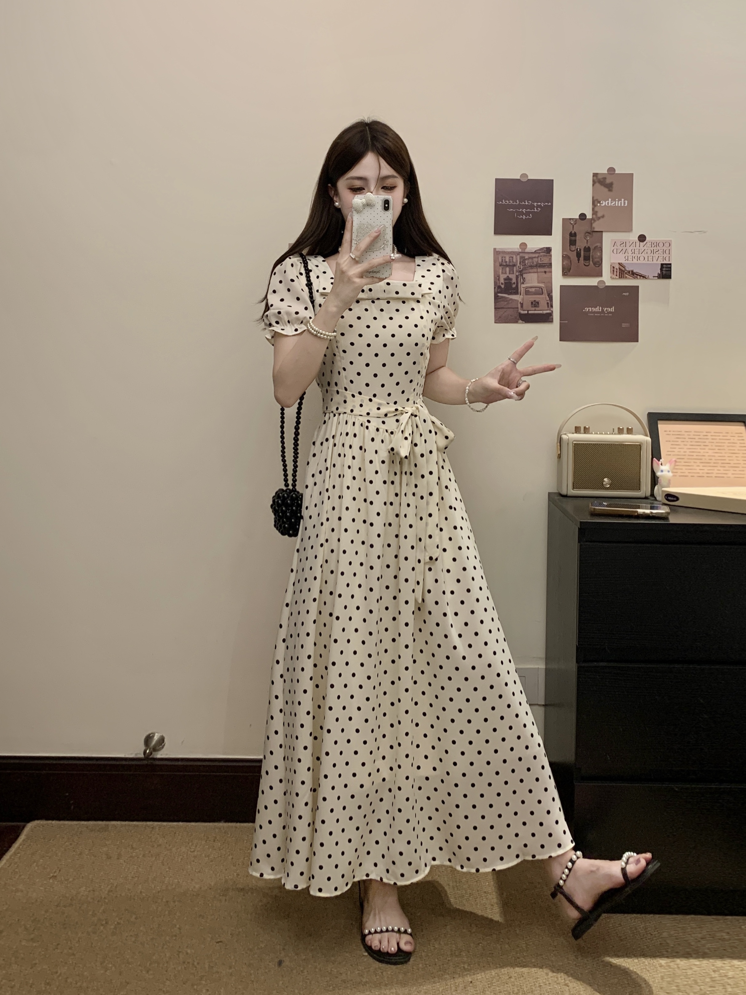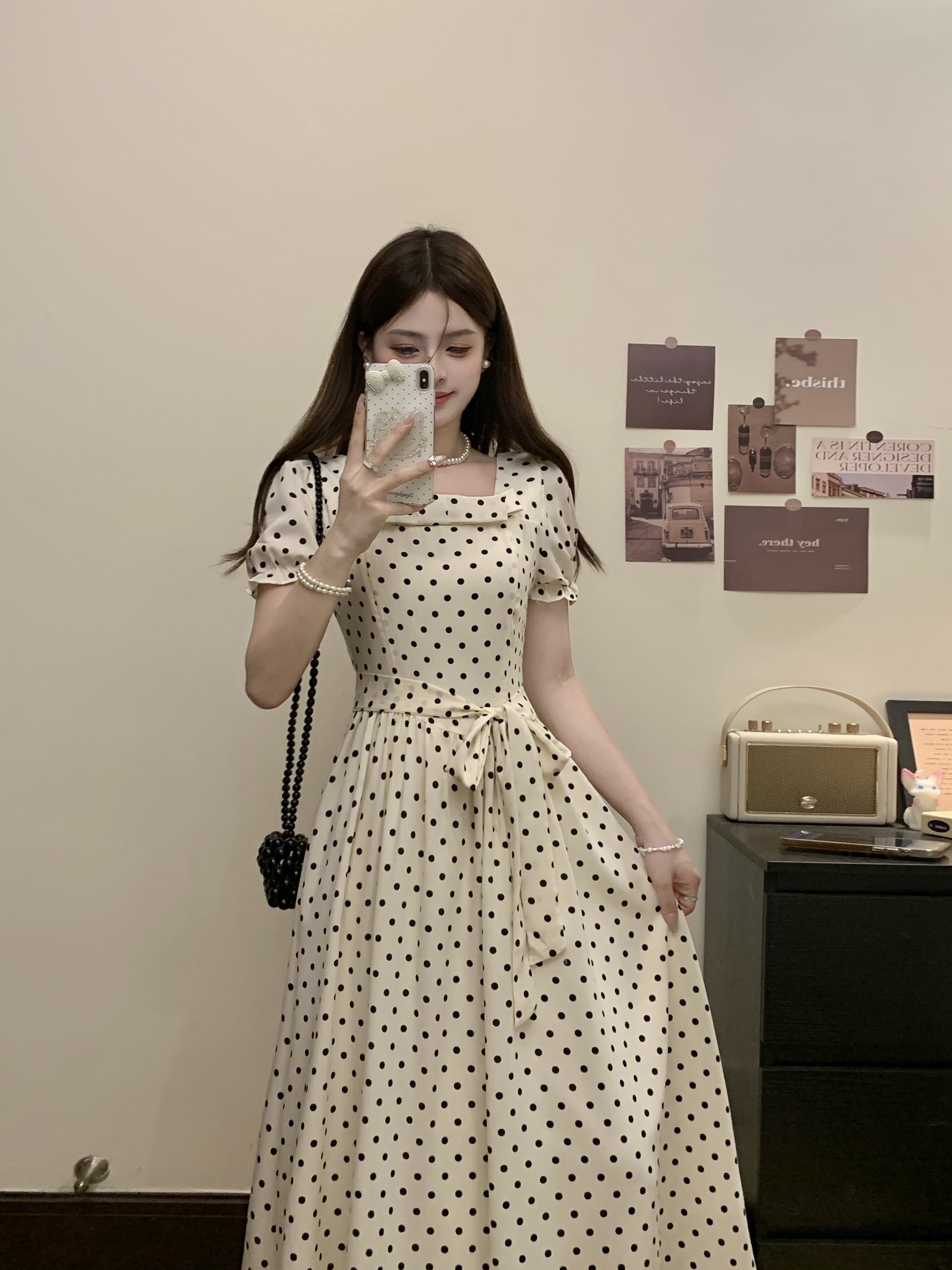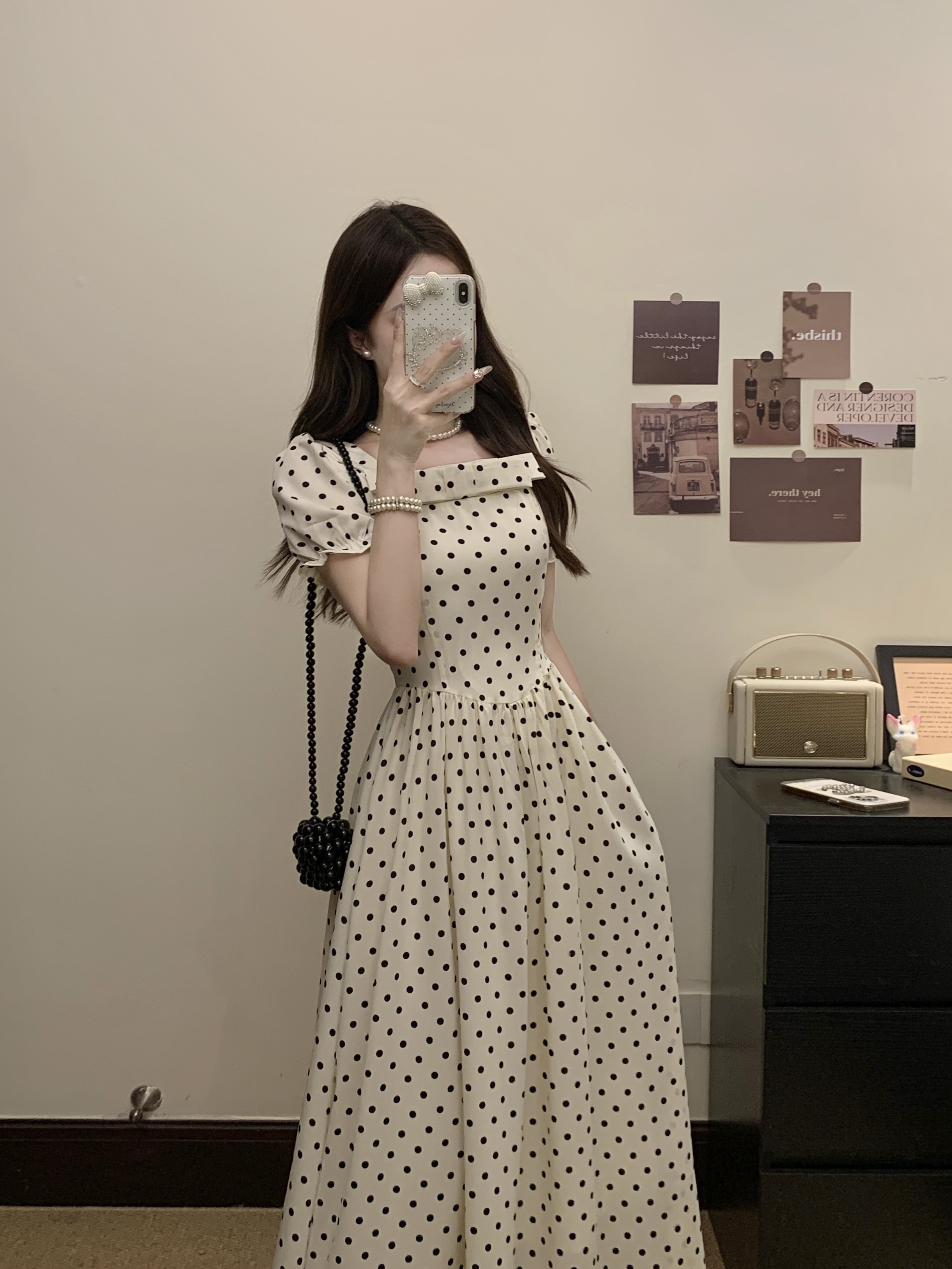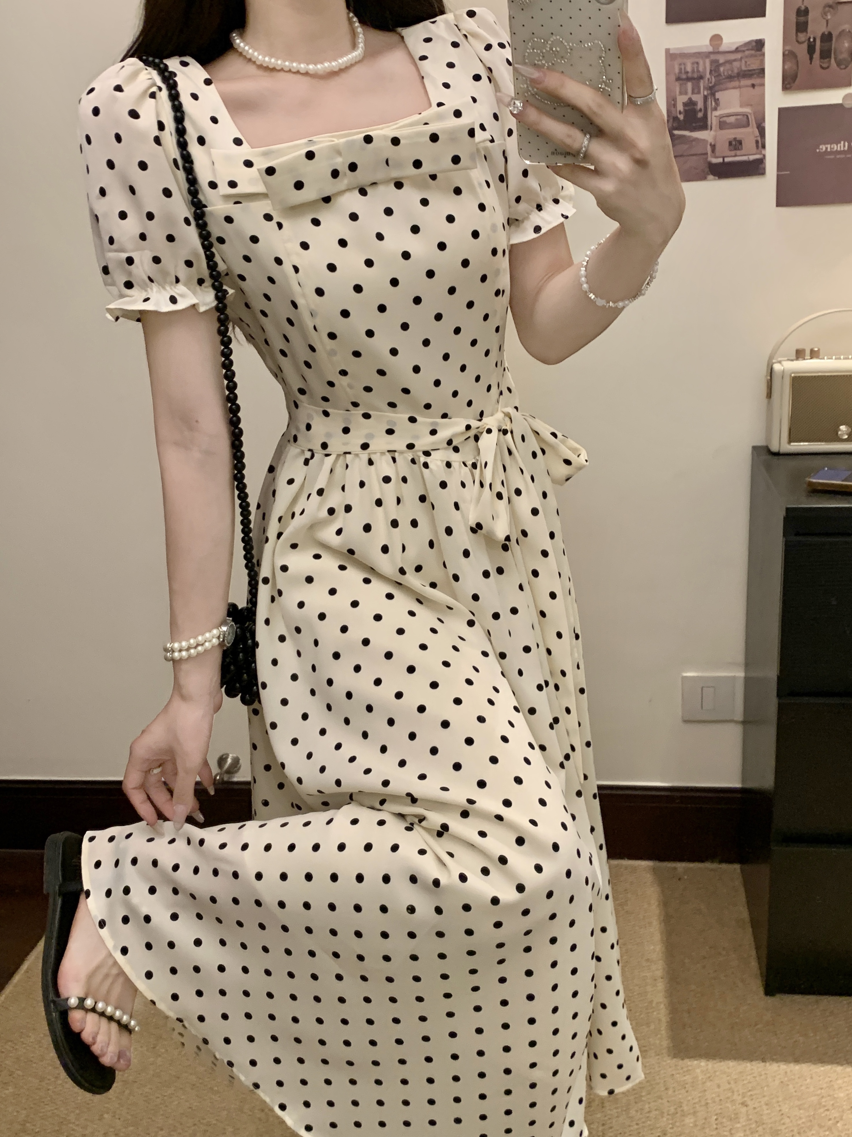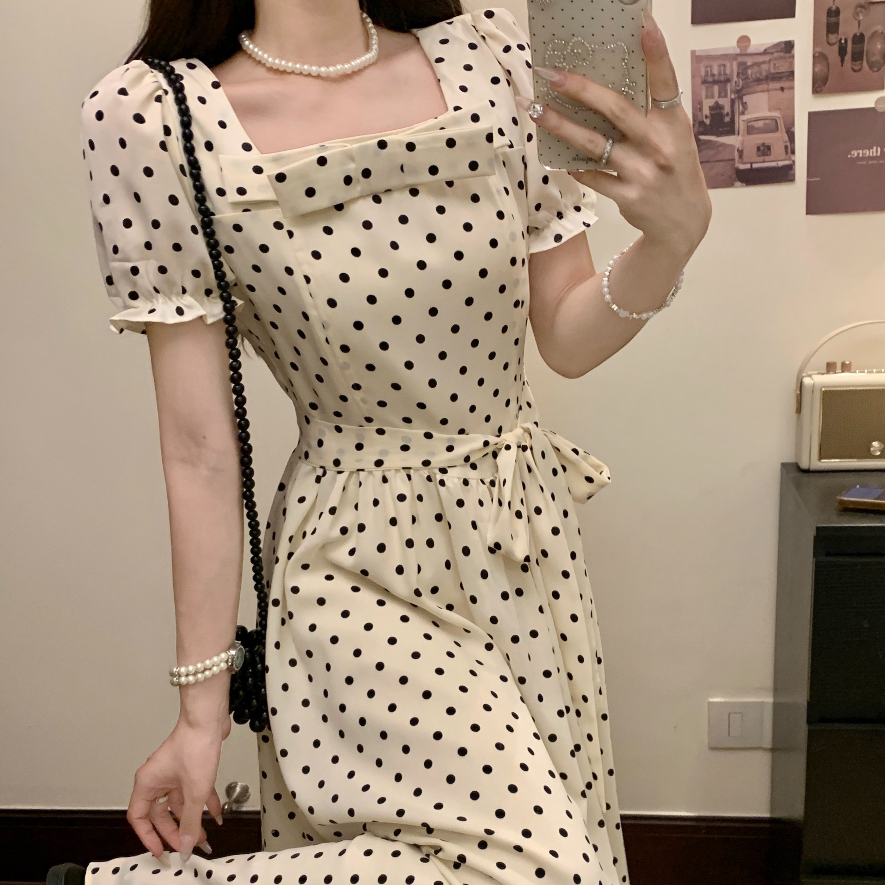 프랑스식 레트로 도트 무늬 거품 소매 여성 드레스 2026 새로운 부드러운 품격 서리가 내린 부서 고유 한 Chic 치마