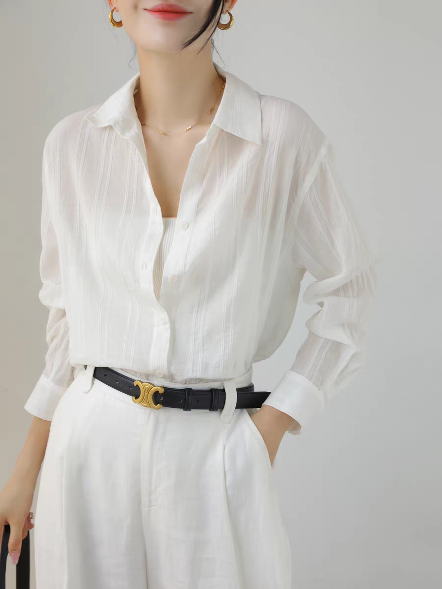 화이트 순면 자카드 질감 얇은 스타일 셔츠 여성 여름 루즈핏 가을 어깨 긴팔 맨위 다용도 캐주얼 셔츠