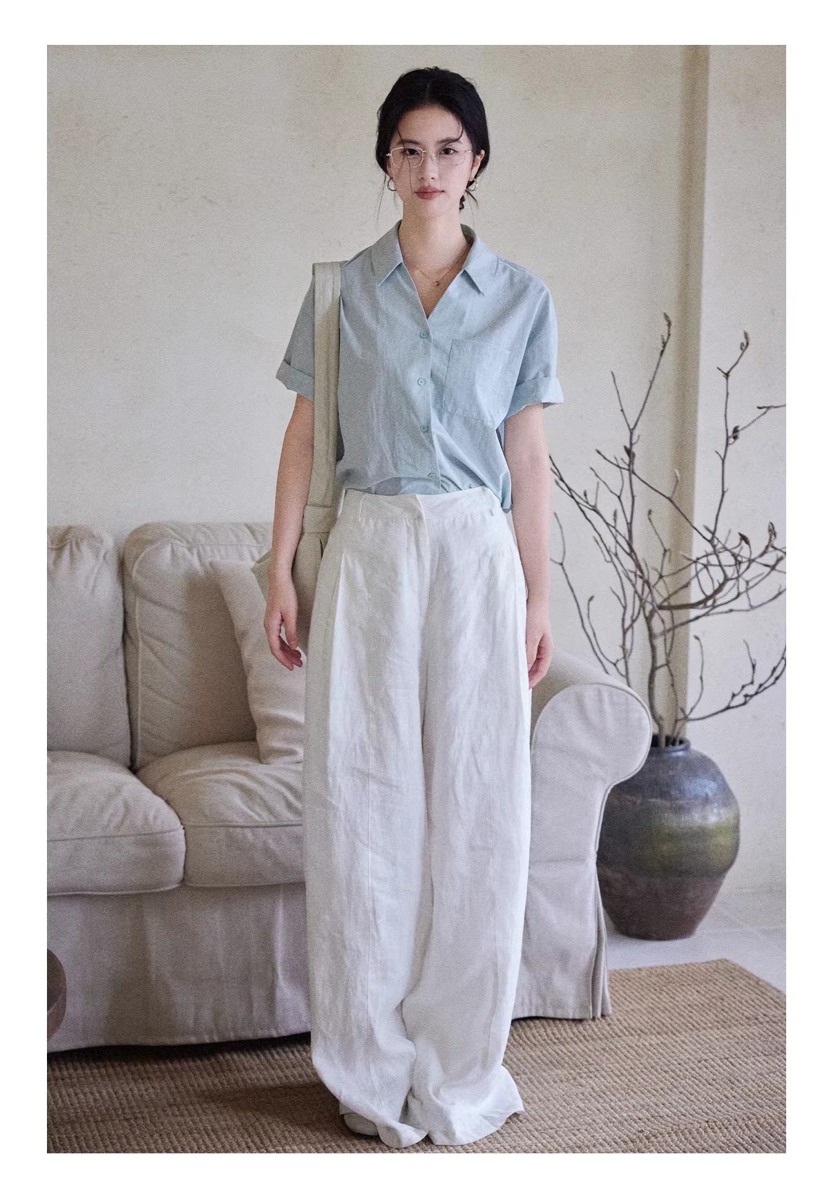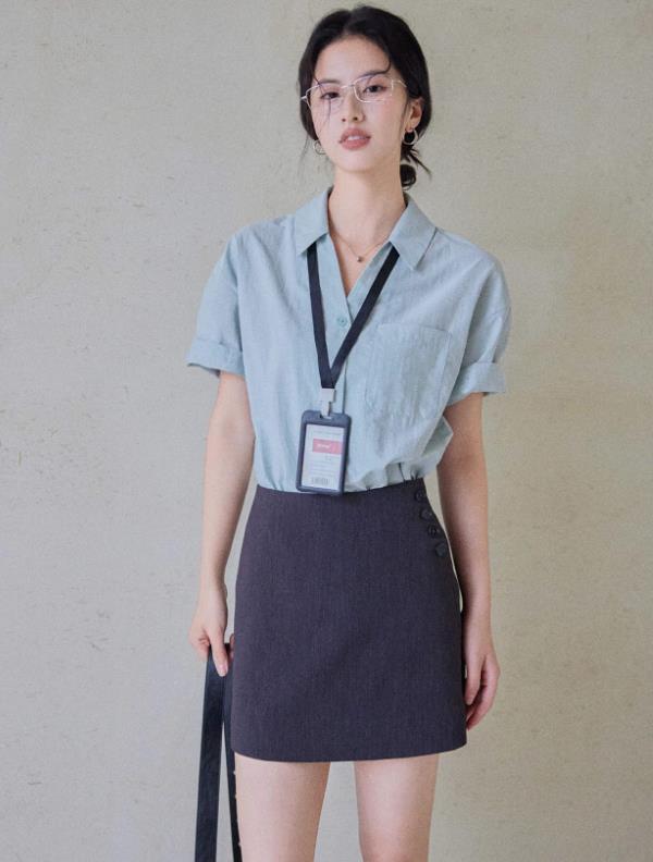 실사 파란색 루즈핏 체크무늬 반팔 여성 셔츠 여름 미니멀리즘 품격 한국 스타일 다용도 셔츠