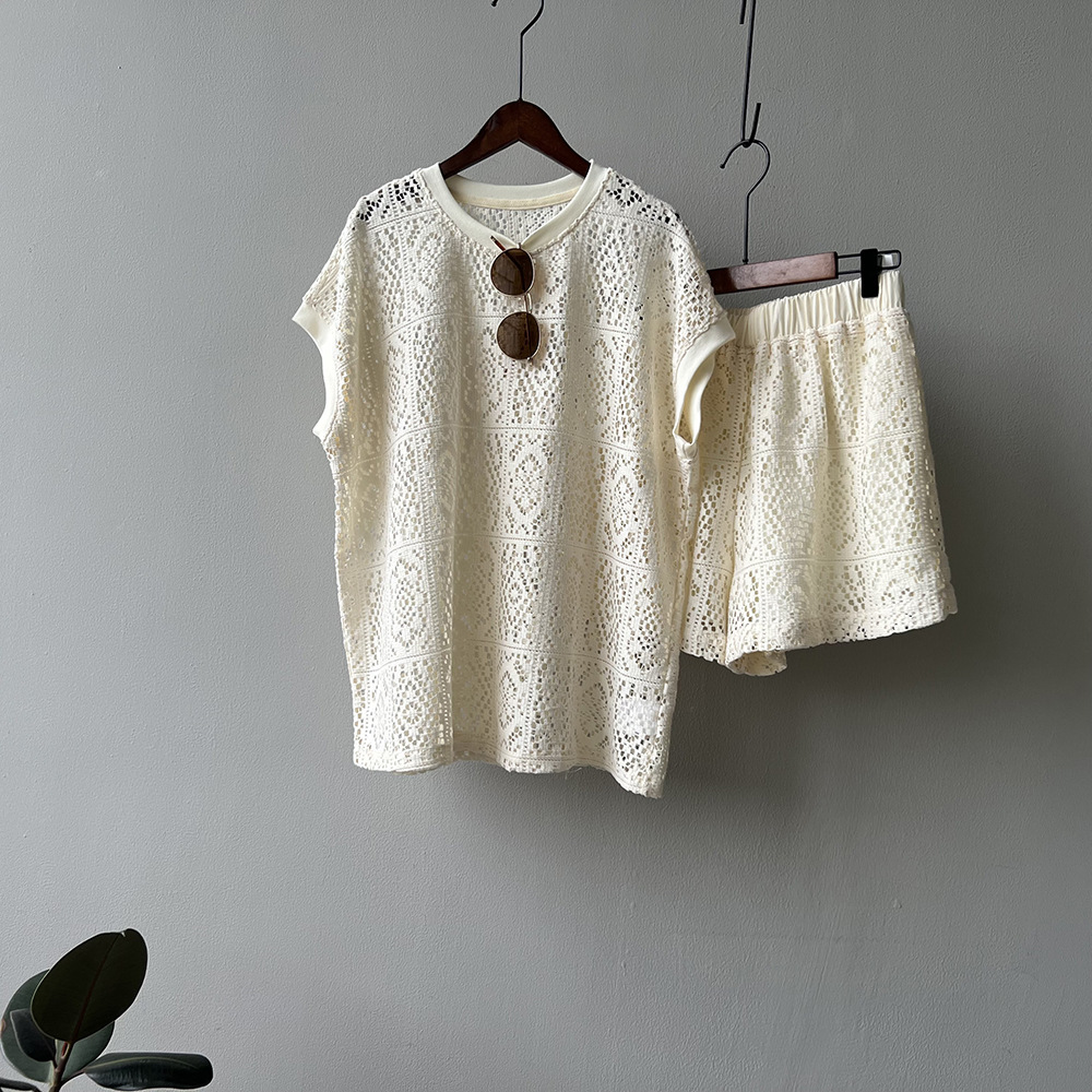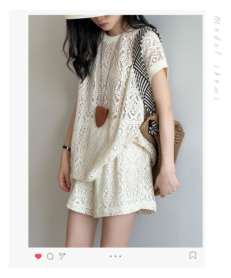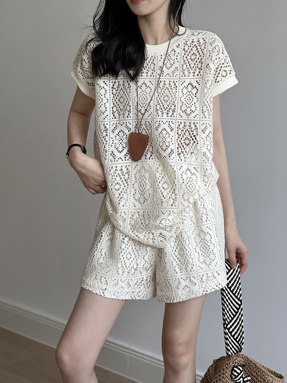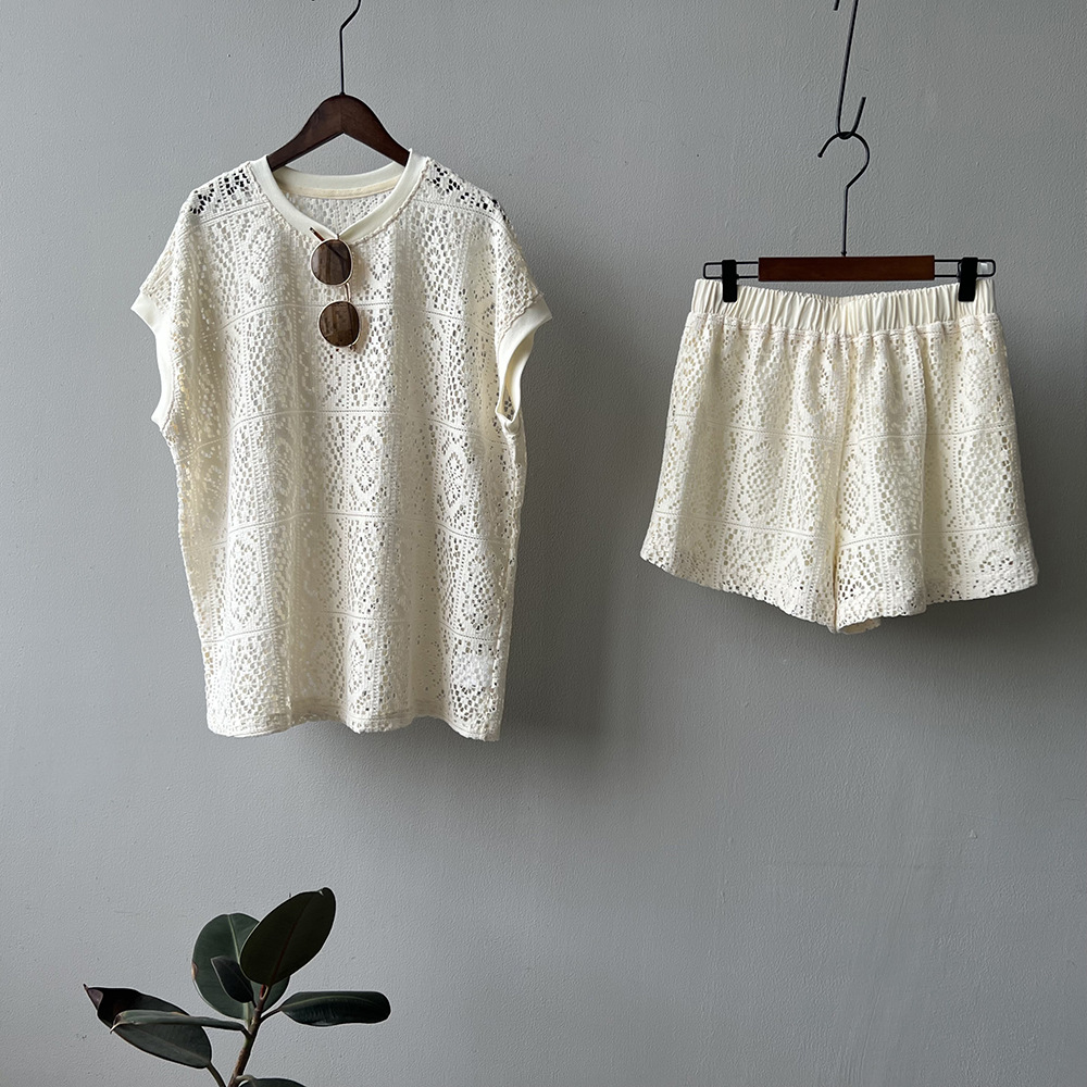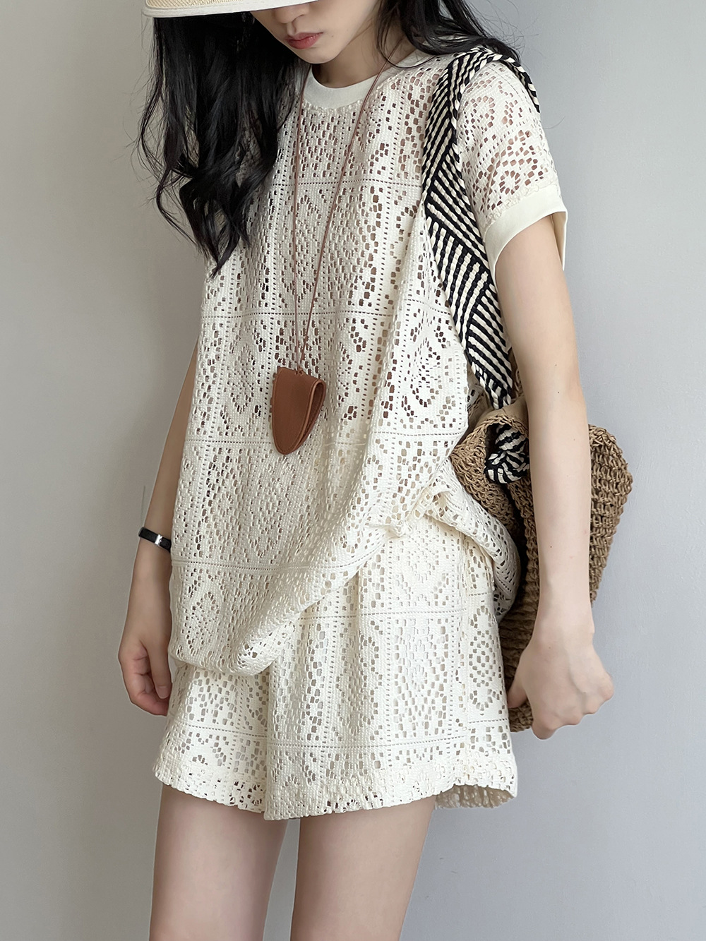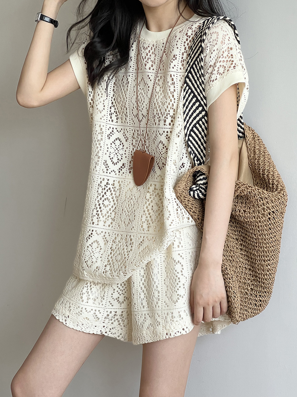 캐주얼 루즈핏 홀로우 아웃 세트 여성 여름 디자인 센스 라운드 넥 티셔츠 하이웨이스트 반바지
