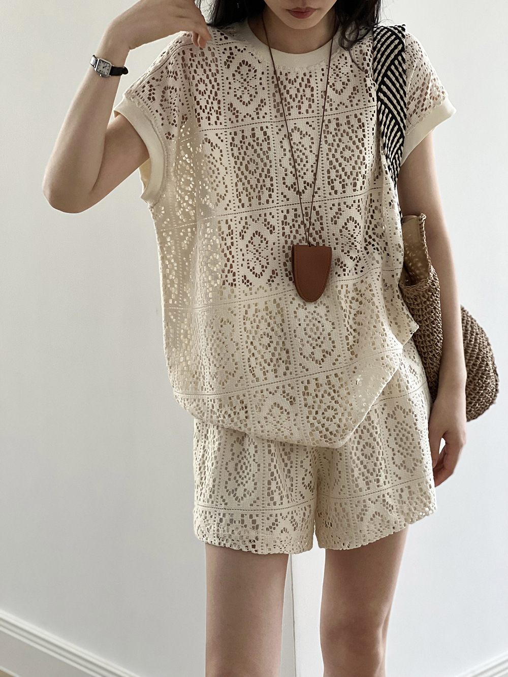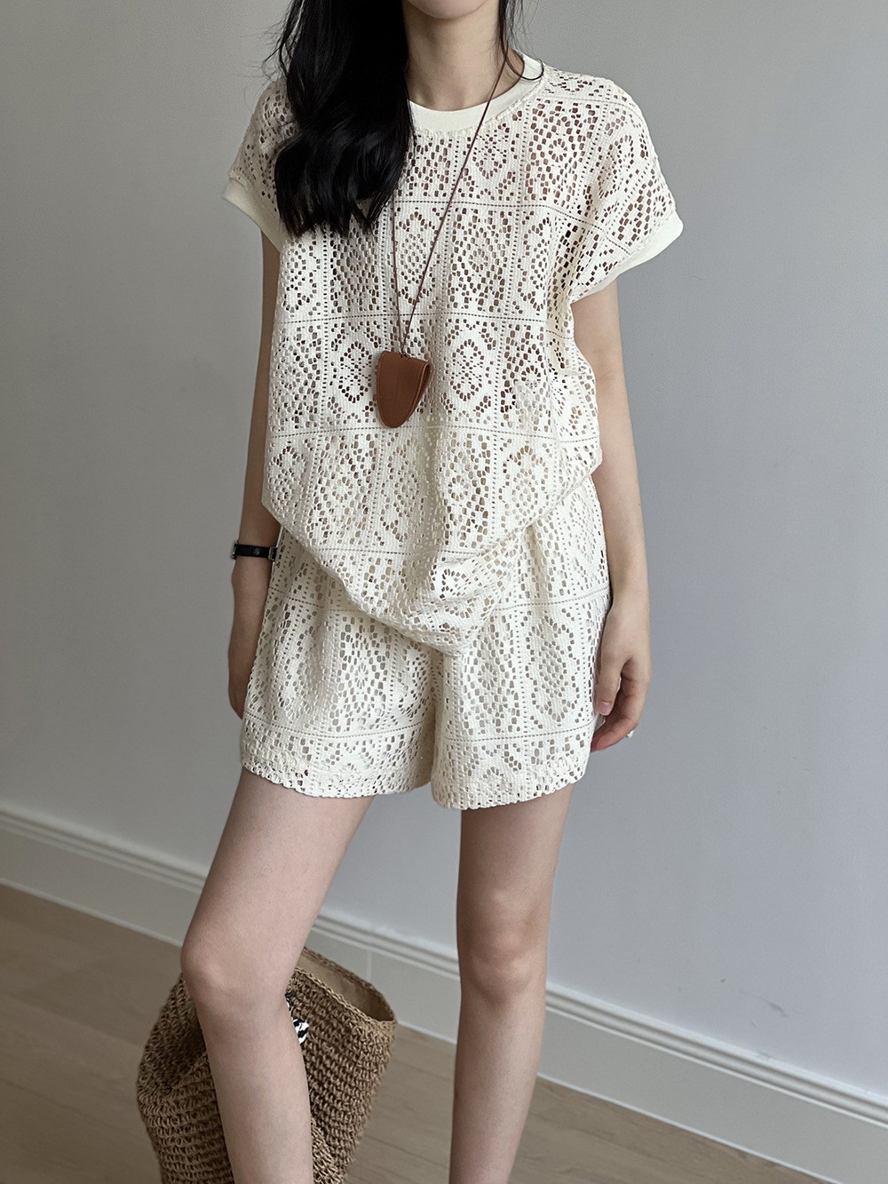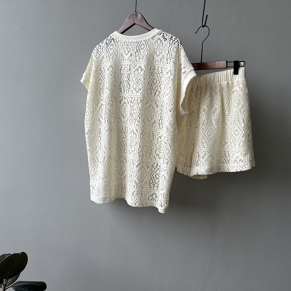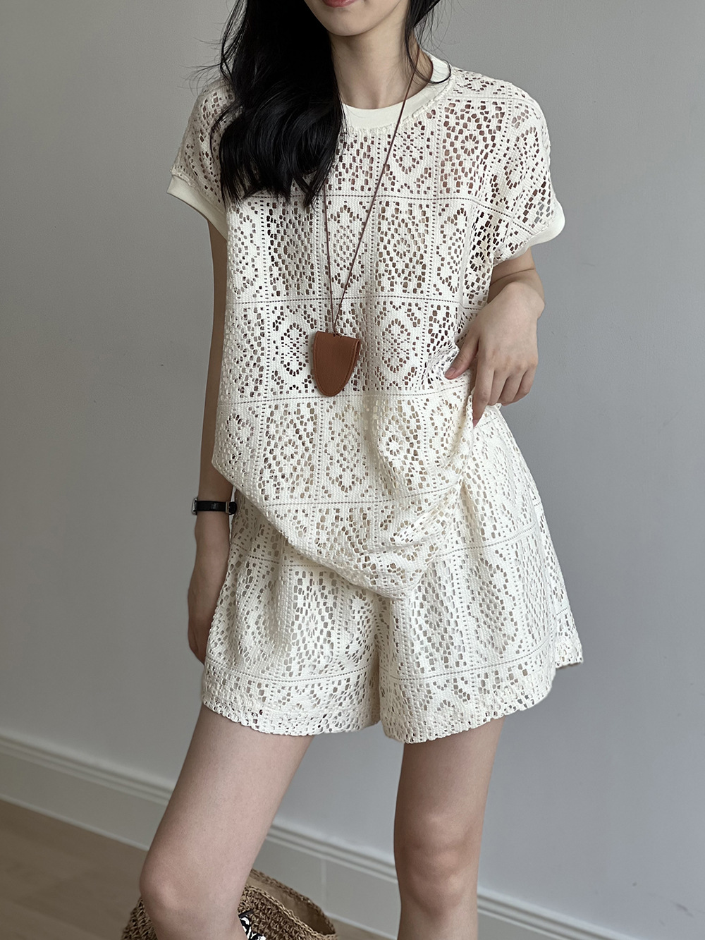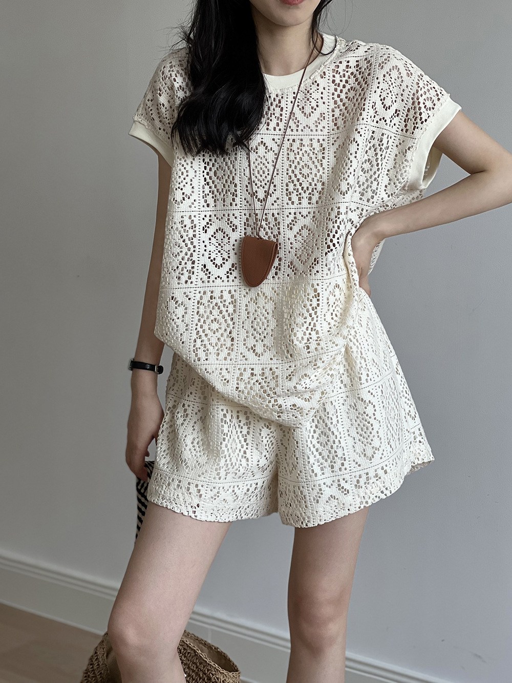 캐주얼 루즈핏 홀로우 아웃 세트 여성 여름 디자인 센스 라운드 넥 티셔츠 하이웨이스트 반바지