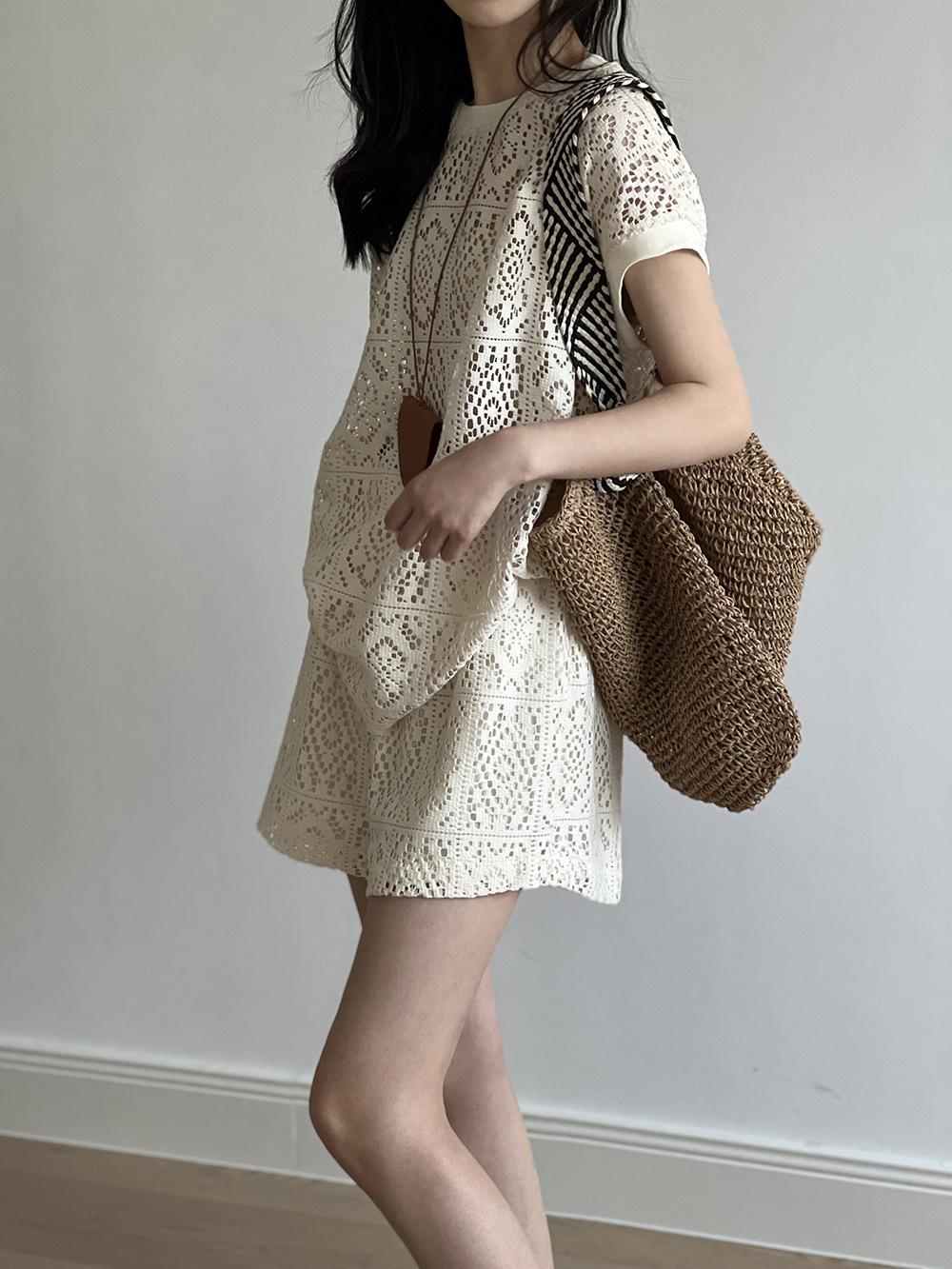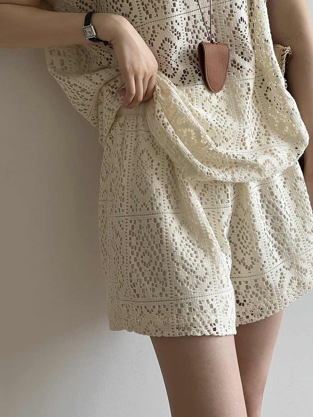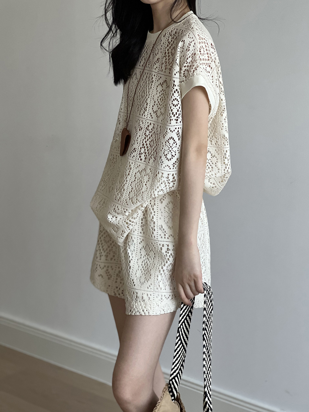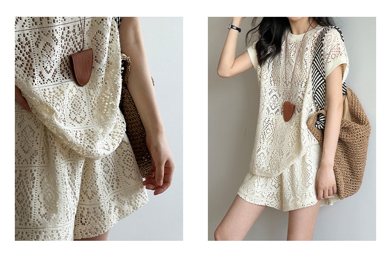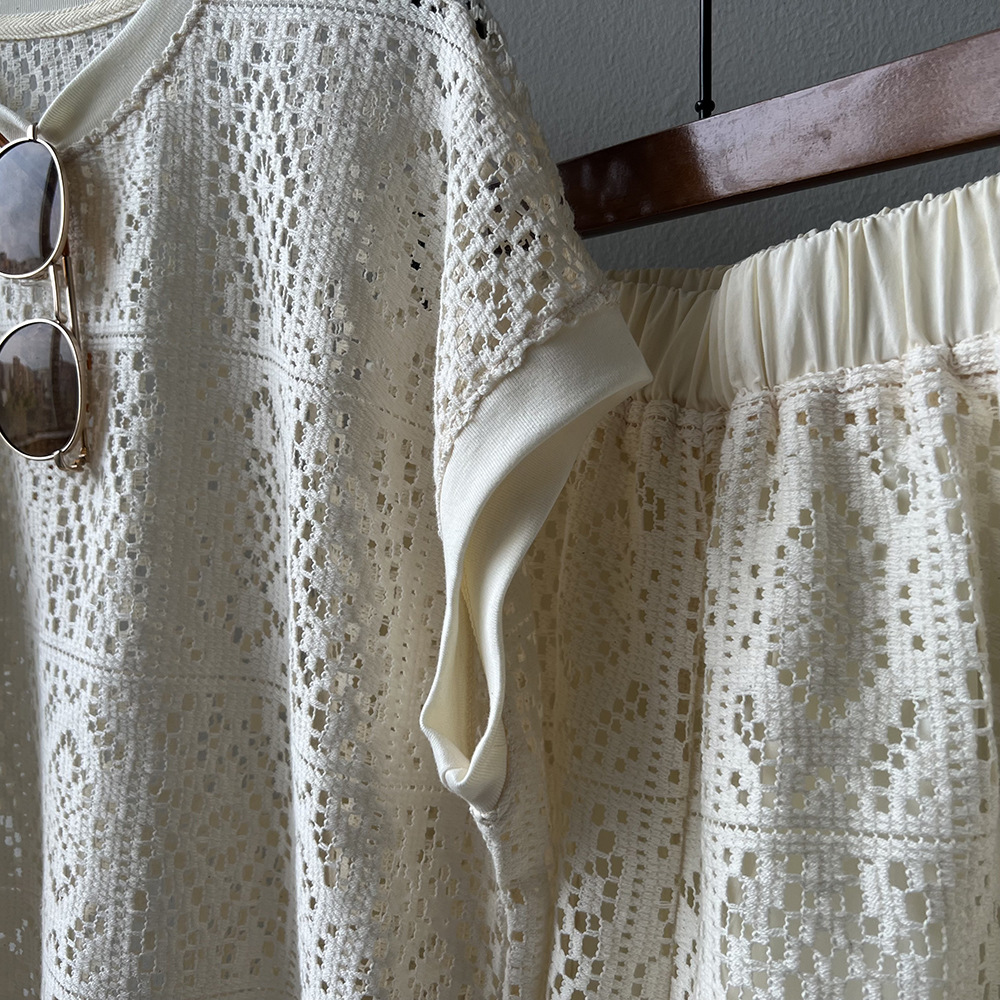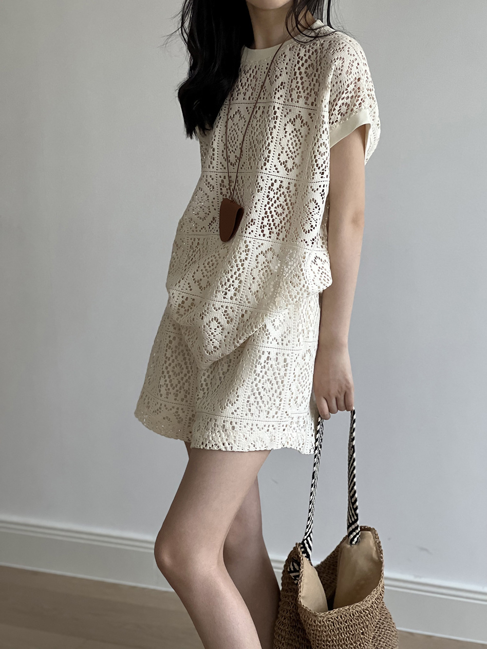 캐주얼 루즈핏 홀로우 아웃 세트 여성 여름 디자인 센스 라운드 넥 티셔츠 하이웨이스트 반바지