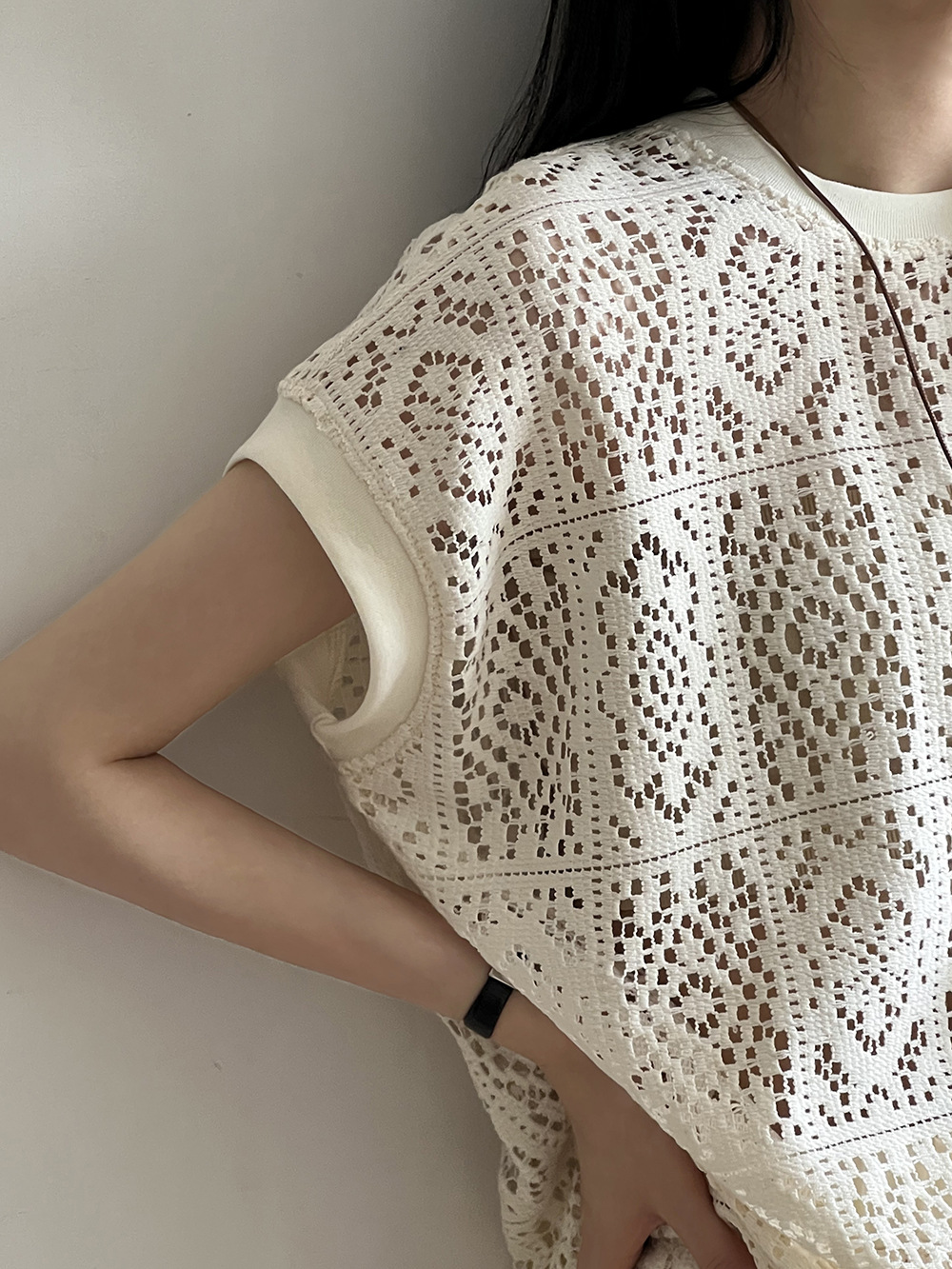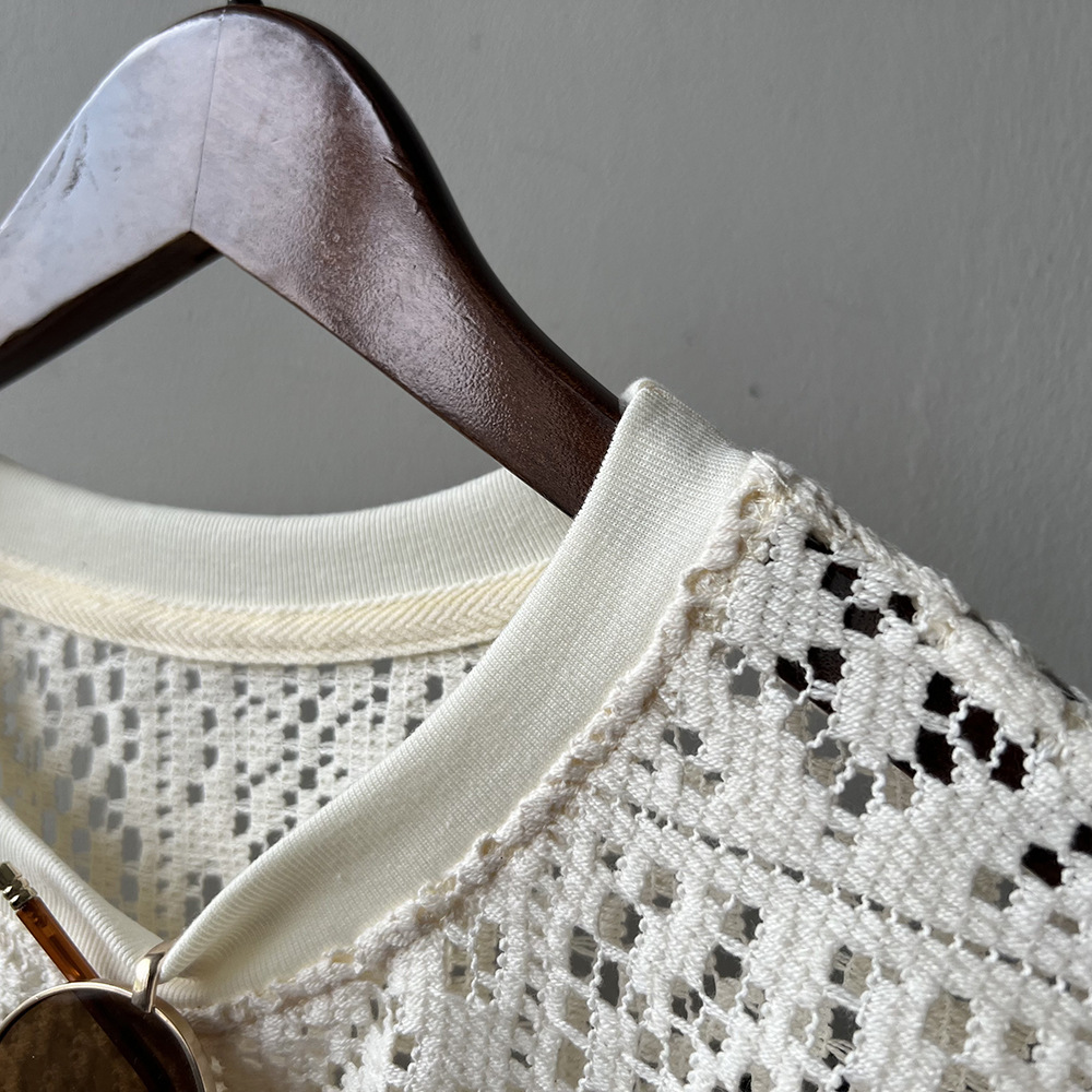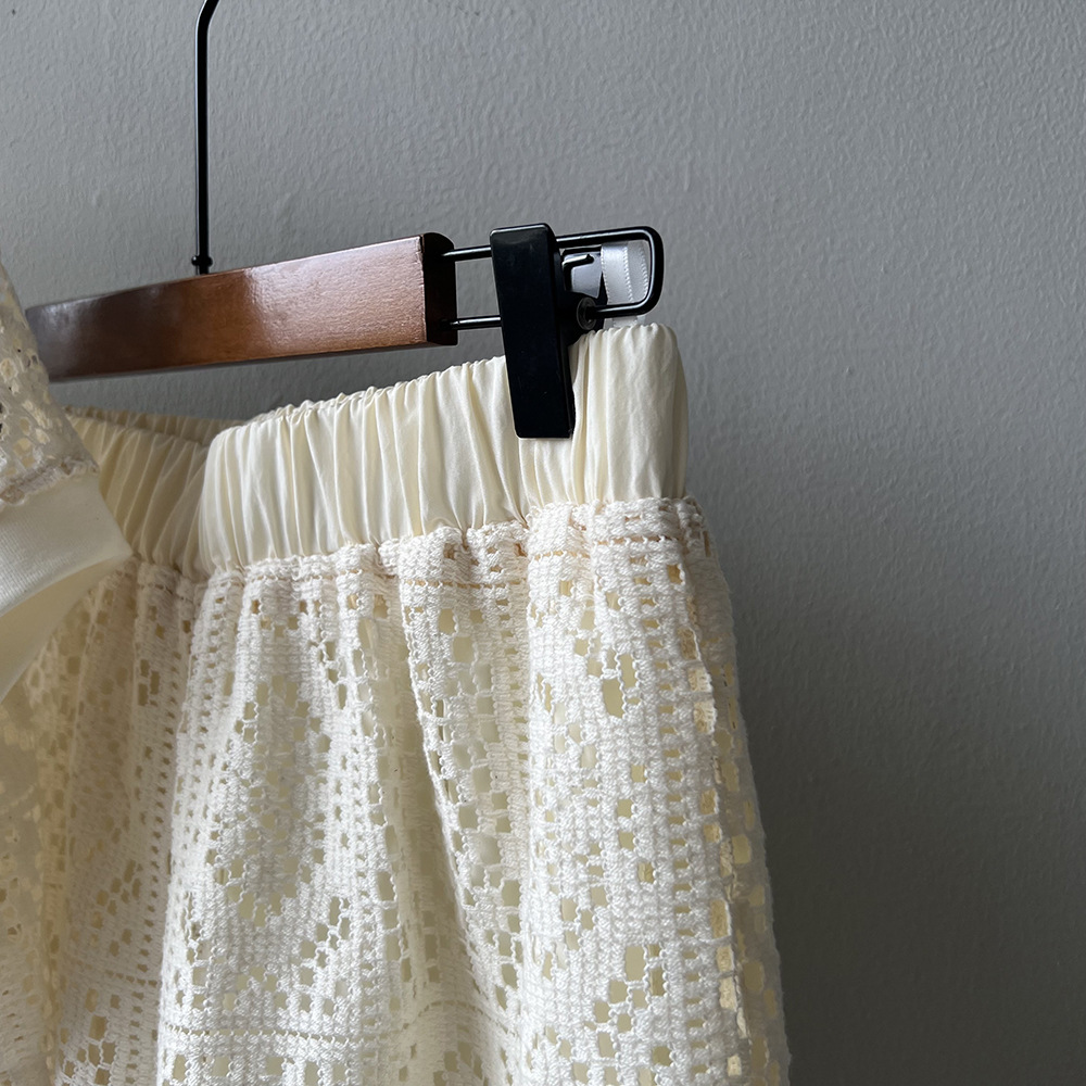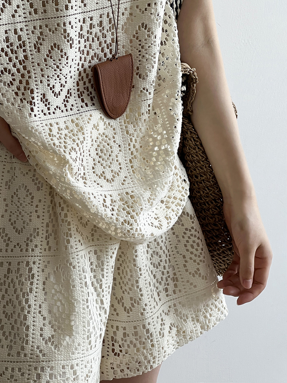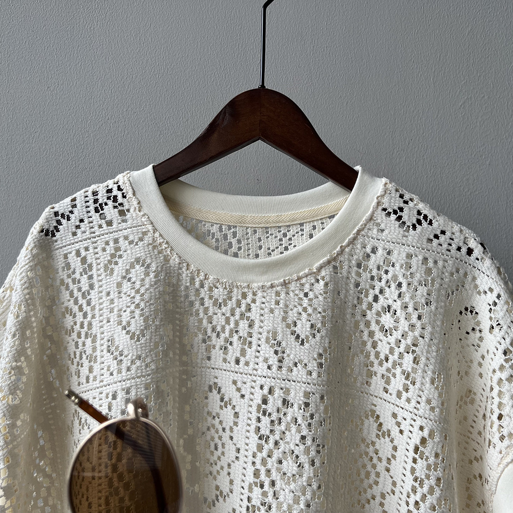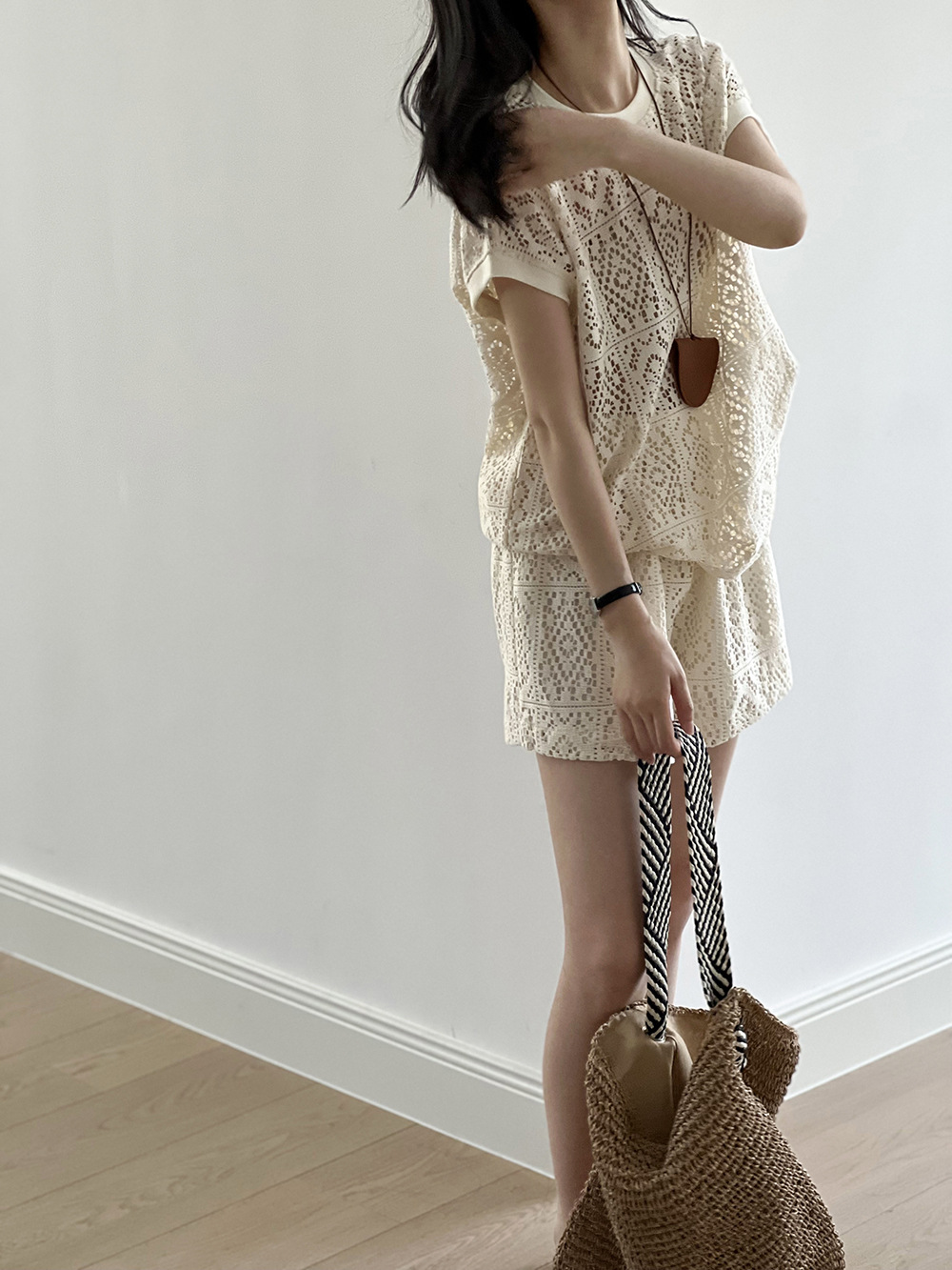캐주얼 루즈핏 홀로우 아웃 세트 여성 여름 디자인 센스 라운드 넥 티셔츠 하이웨이스트 반바지