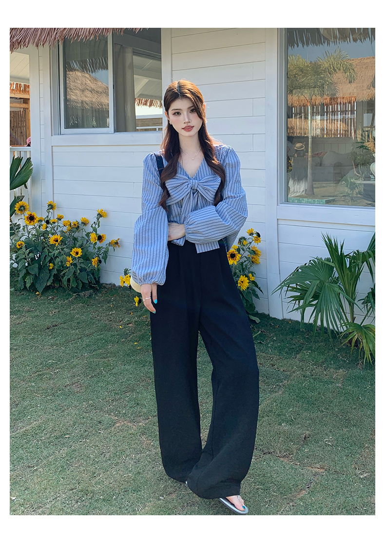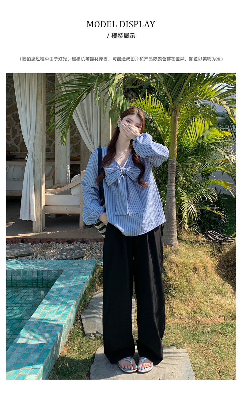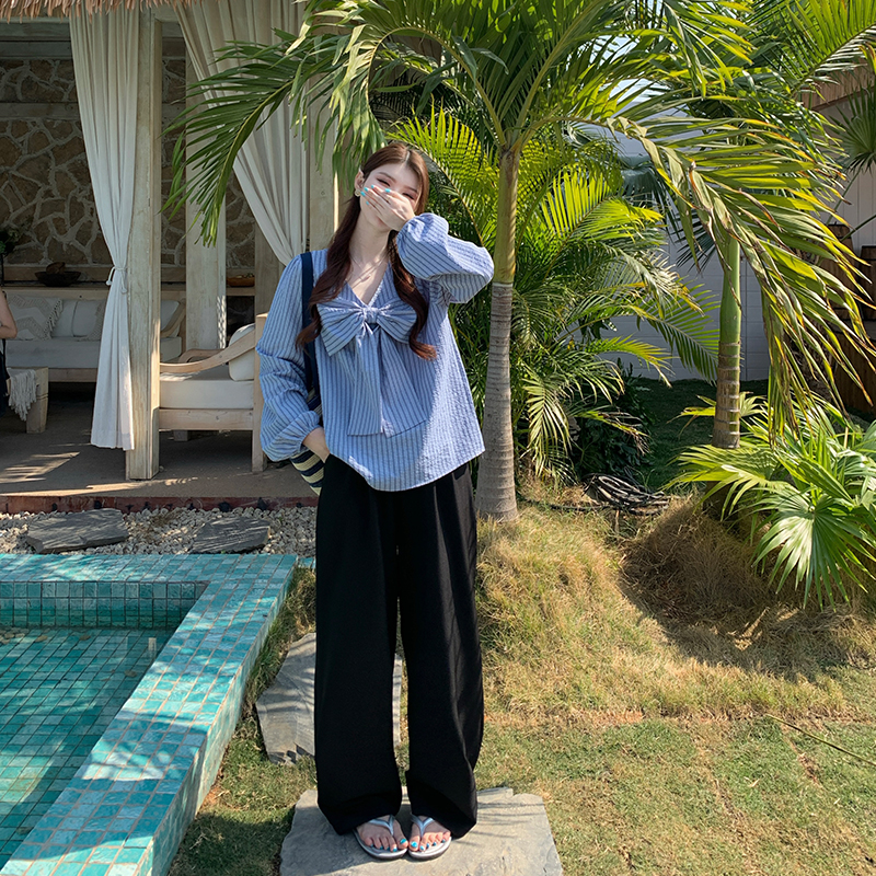 빅 사이즈 여성 의류 봄 스트라이프 셔츠 빅 사이즈 나비 매듭 슬림해 보이는 한국 스타일 셔츠 허리밴드 슬랙스 세트