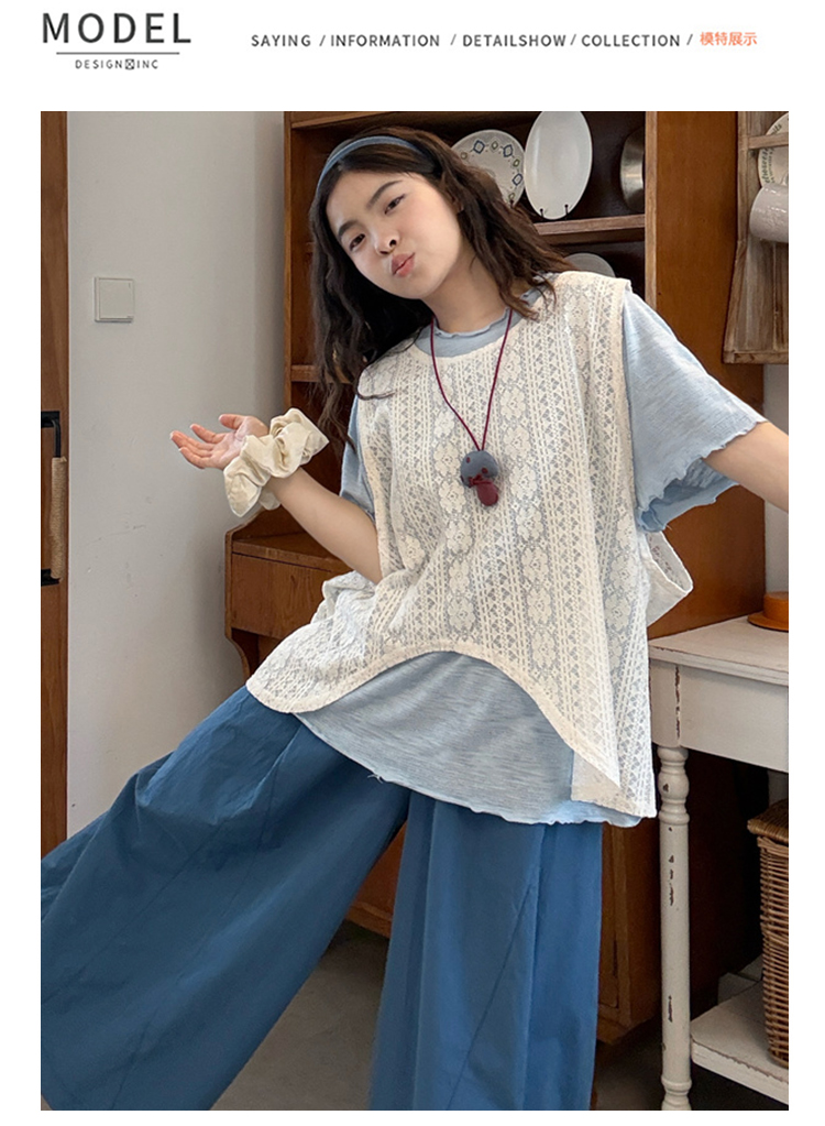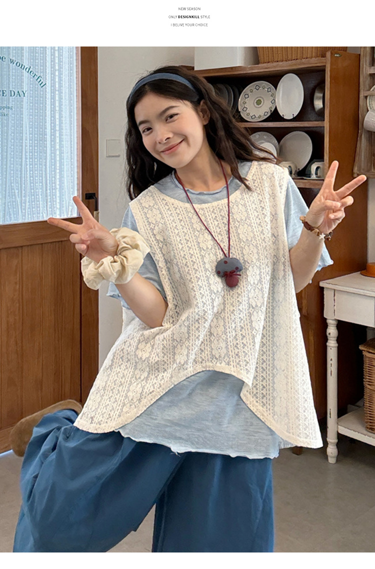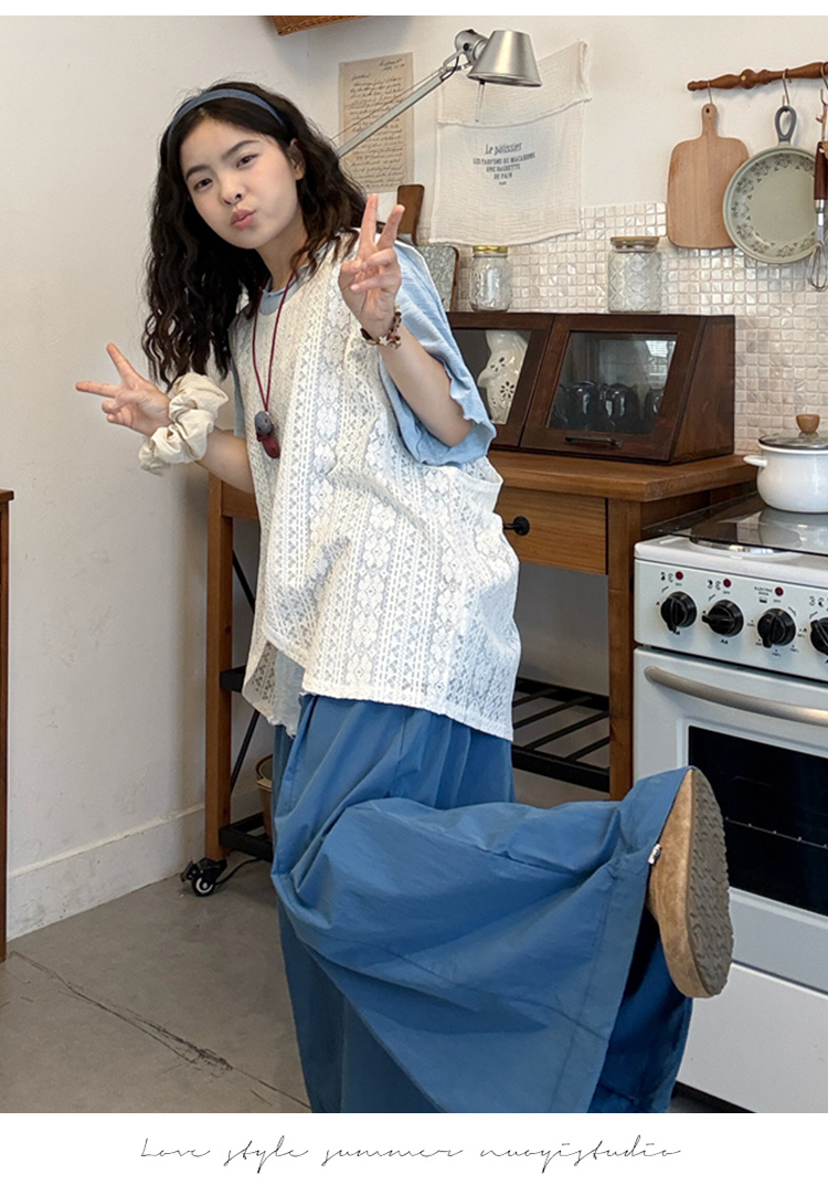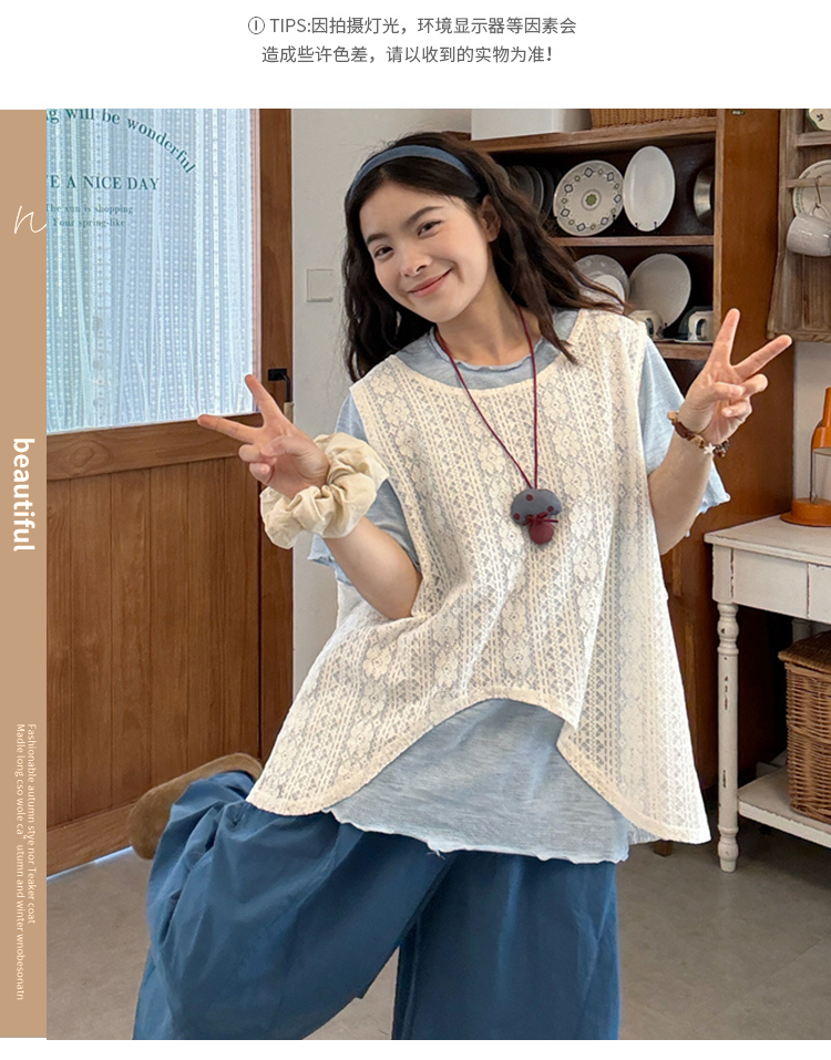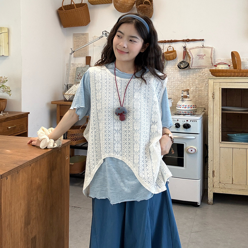 실사 2026 여름 드레스 새로운 레이스 레이스 블라우스 조끼 반팔 티셔츠 레이스 치마 출산 착용 3종 세트