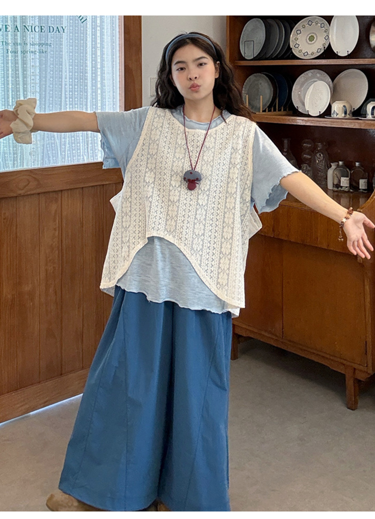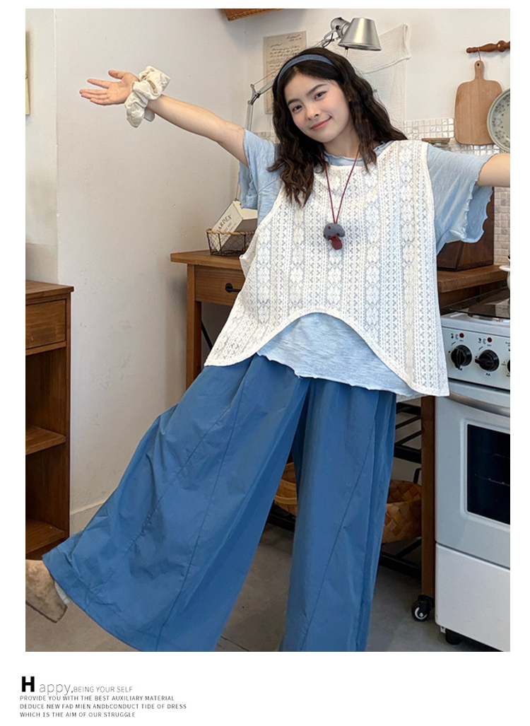 실사 지금 2026 여름 새로운 연령 감소 외국 가스 반팔 맨위 와이드 레그 팬츠 투피스 세트