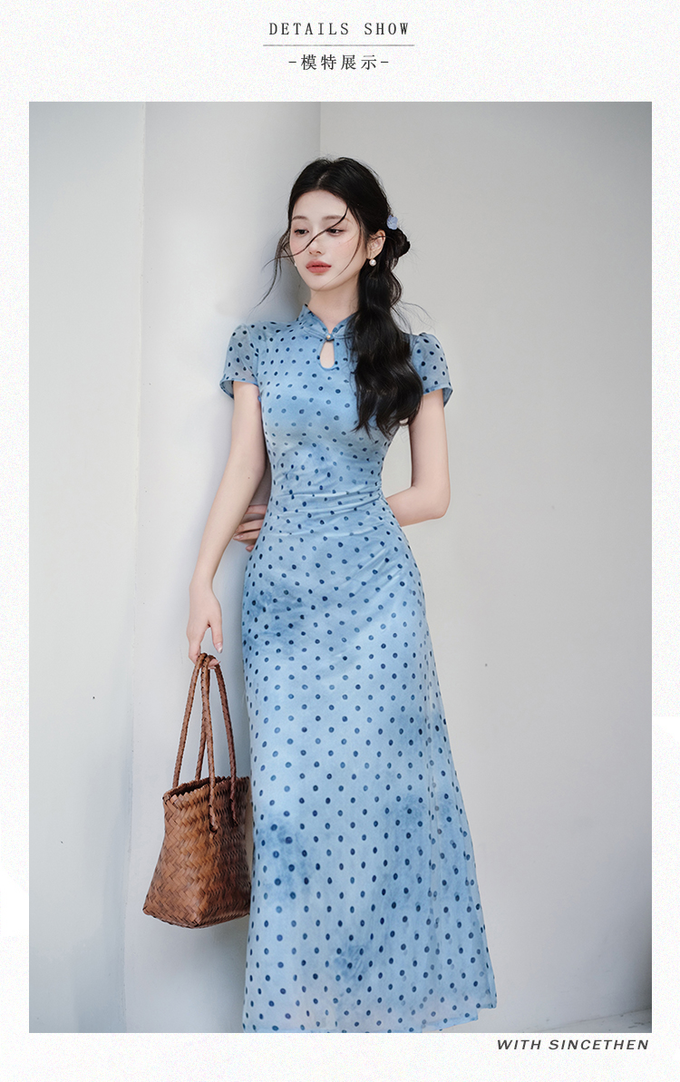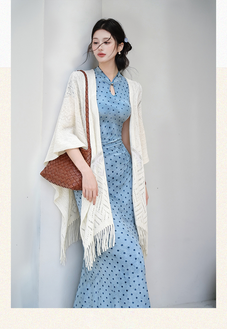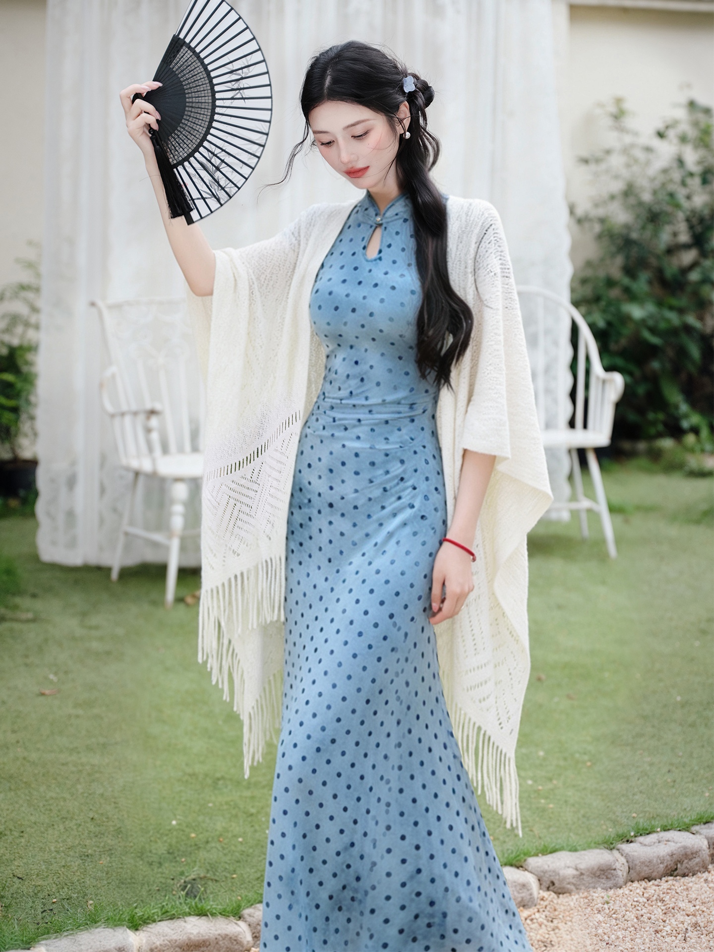 언어 그리스어 진짜 사진 찍기 새로운 도트 무늬 개선 반팔 치파오 코디 화이트 숄 우아함 품격 점프 슈트 치마 세트