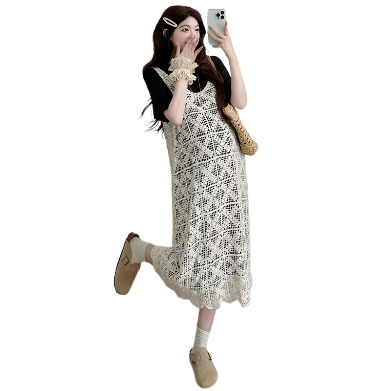 2026 여름 새로운 출산 착용 낭만주의 캐주얼 레이스업 허리 수축 롱 스커트 루즈핏 임산부 드레스