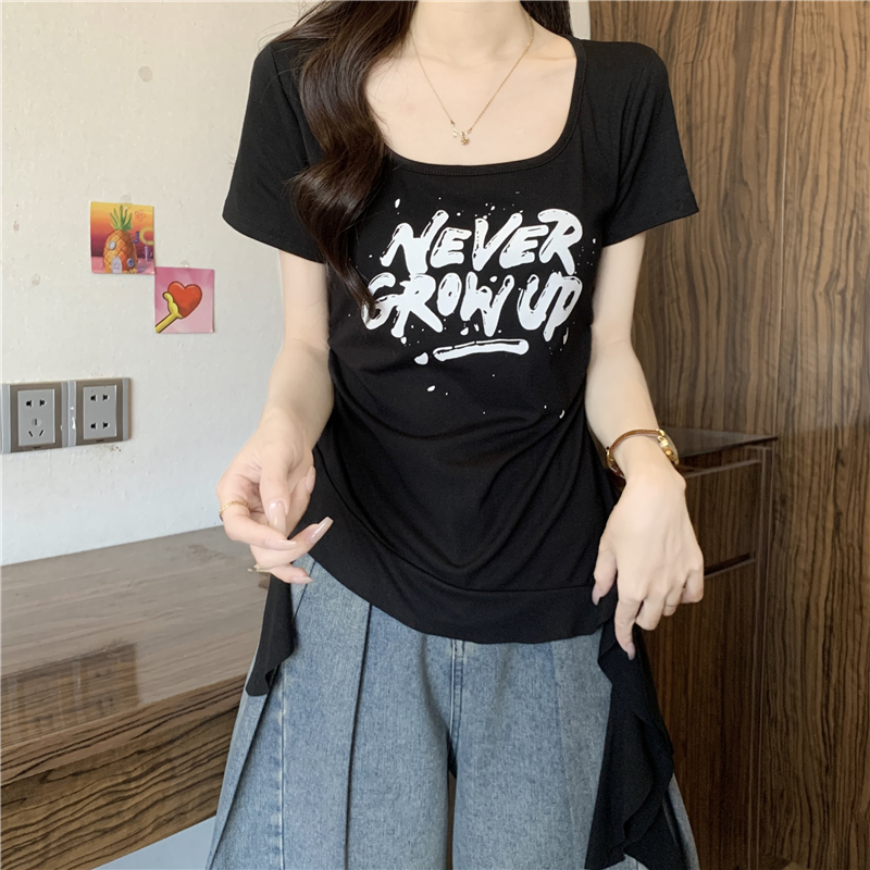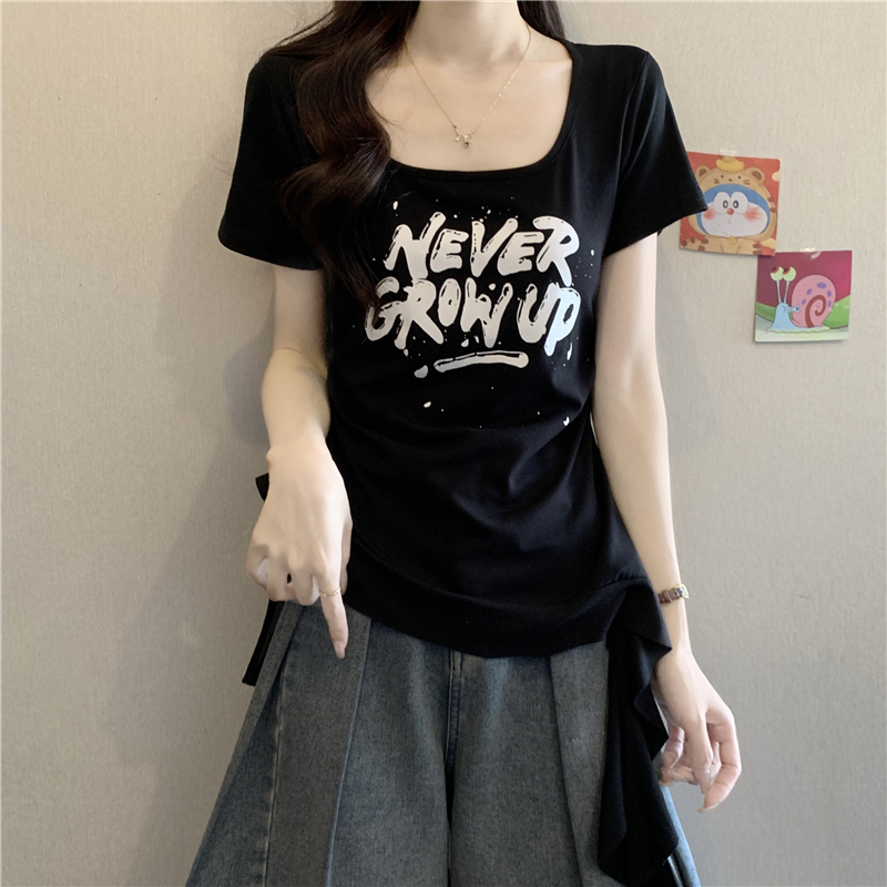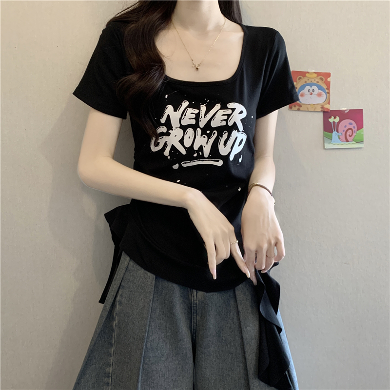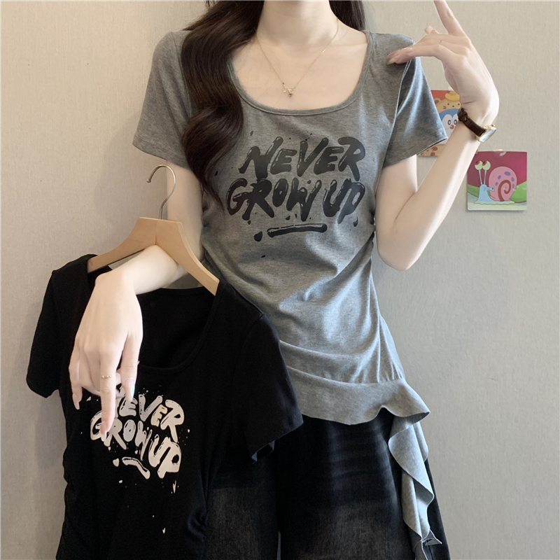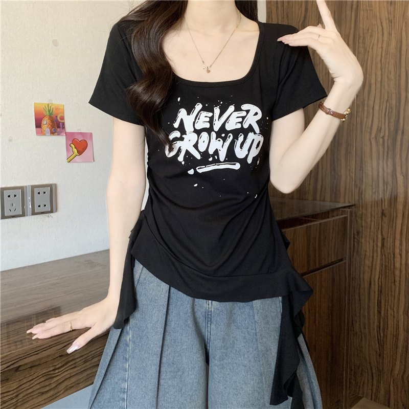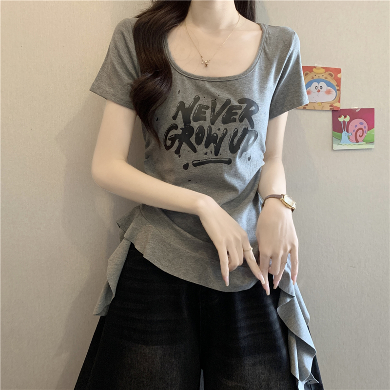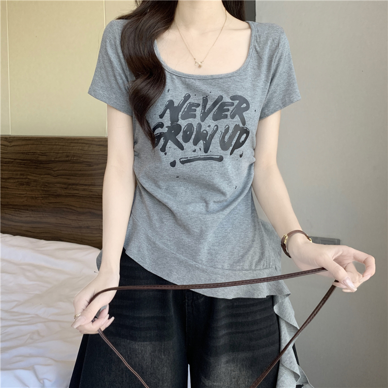 프릴 패치워크 리본 알파벳 프린트 반팔 티셔츠 여성 여름 지방 mm 외국 가스 몸매 가꾸기 불규칙 맨위 트렌디