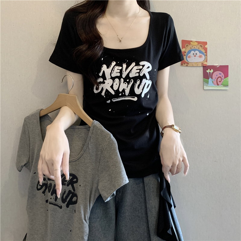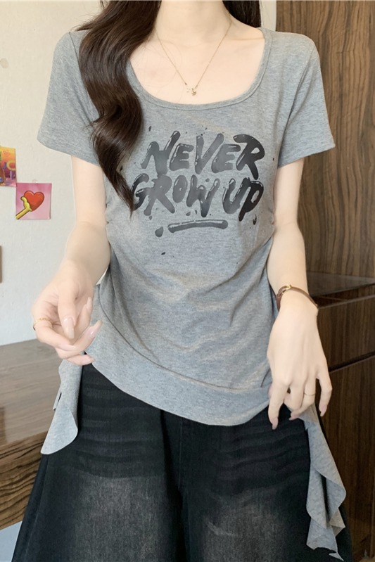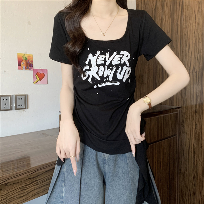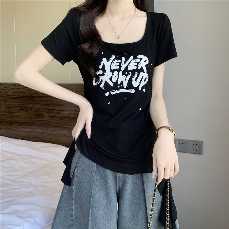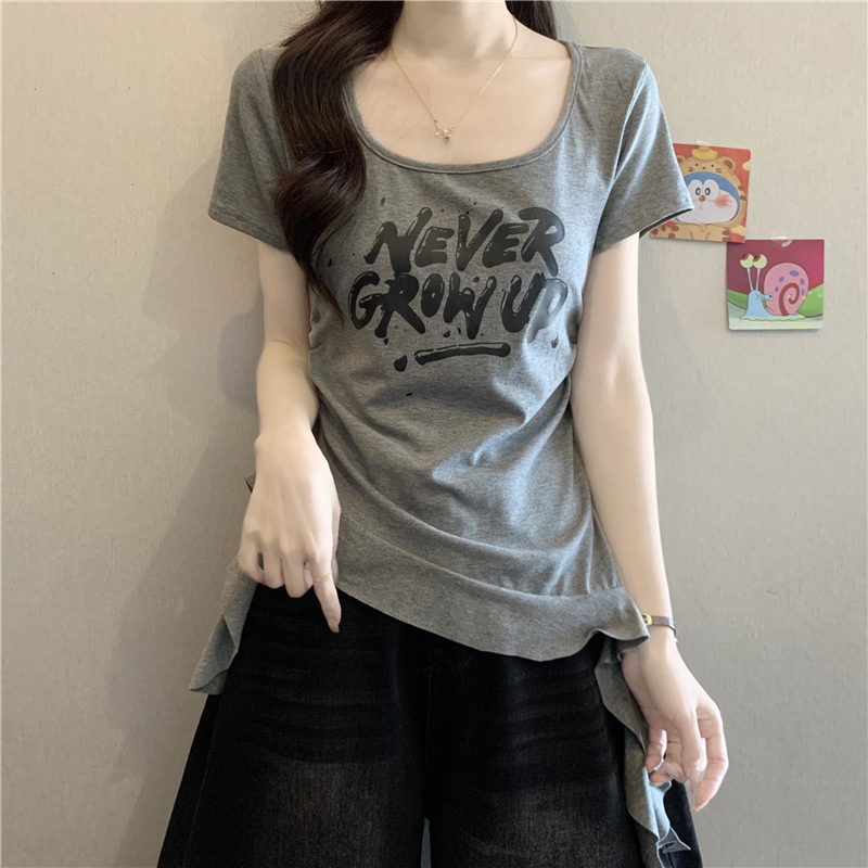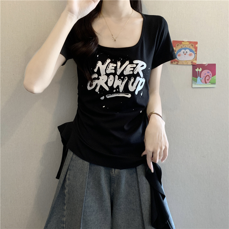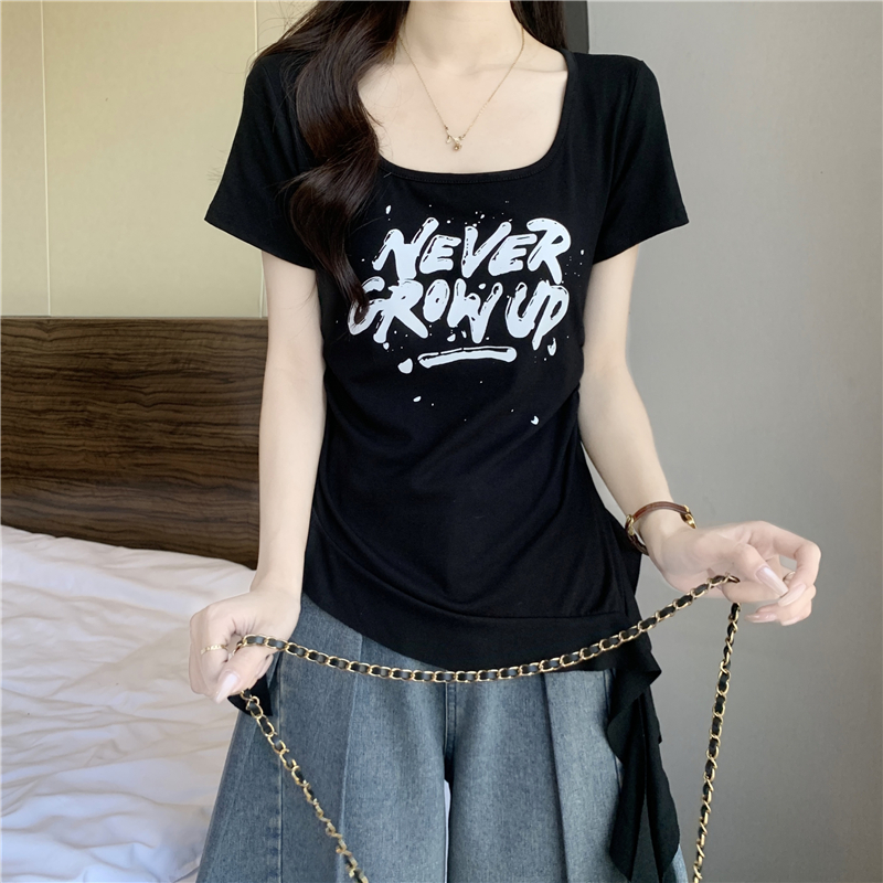 프릴 패치워크 리본 알파벳 프린트 반팔 티셔츠 여성 여름 지방 mm 외국 가스 몸매 가꾸기 불규칙 맨위 트렌디