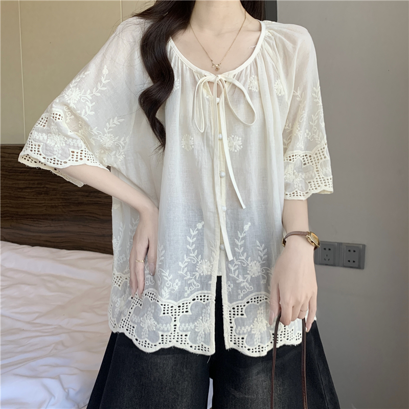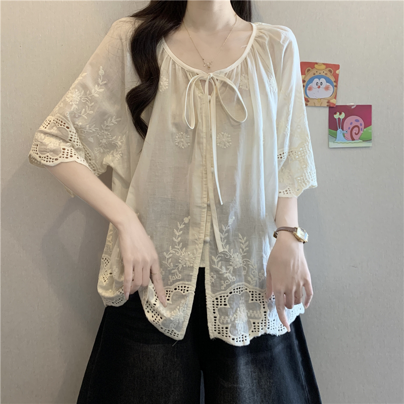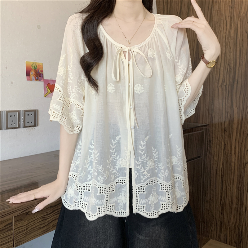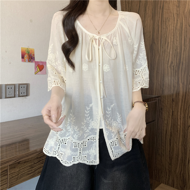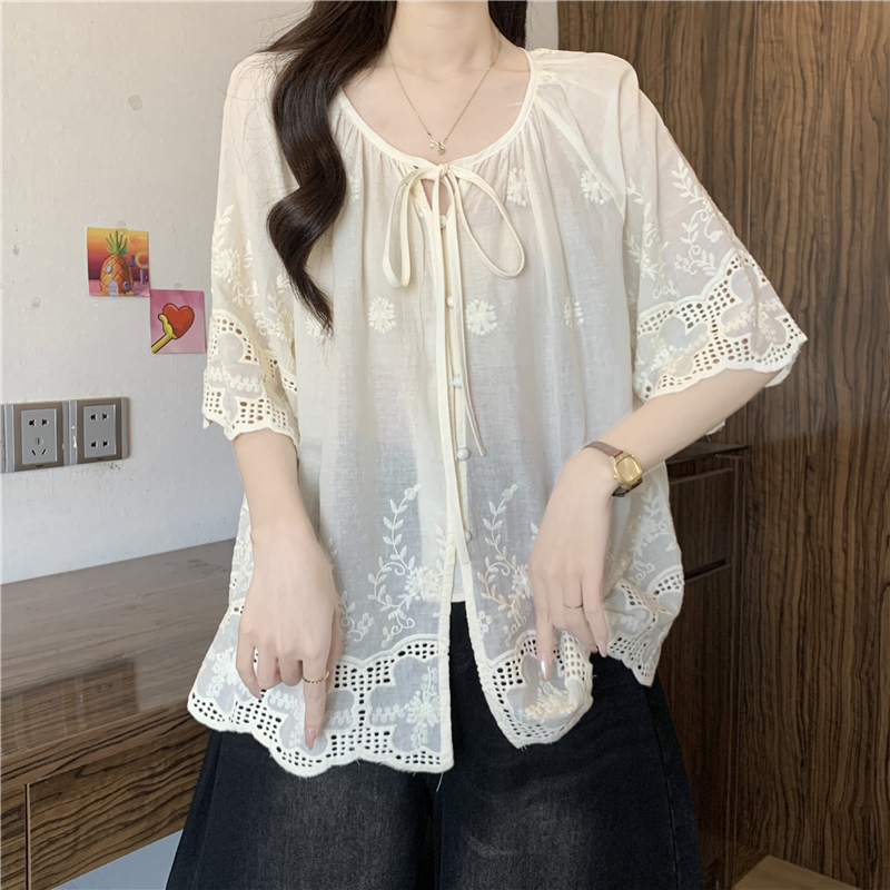 프랑스식 고급 센스 레이스업 자수 7부 소매 여성 셔츠 여름 빅 사이즈 지방 mm 표지 고기 슬림해 보이는 인형 셔츠 맨위
