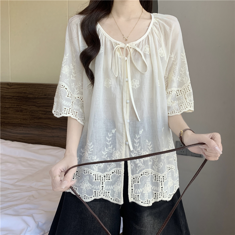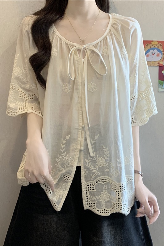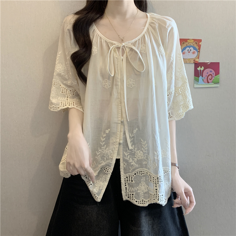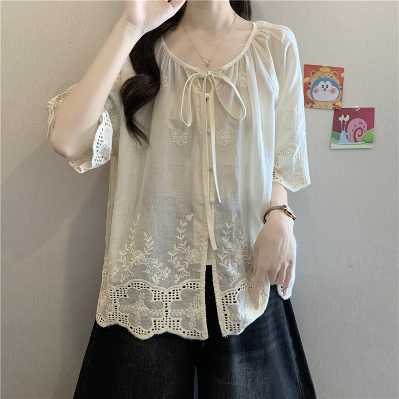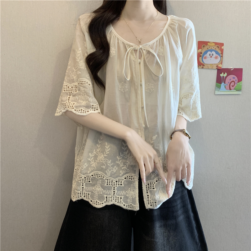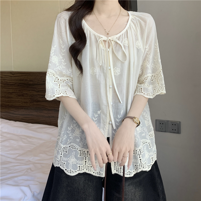프랑스식 고급 센스 레이스업 자수 7부 소매 여성 셔츠 여름 빅 사이즈 지방 mm 표지 고기 슬림해 보이는 인형 셔츠 맨위