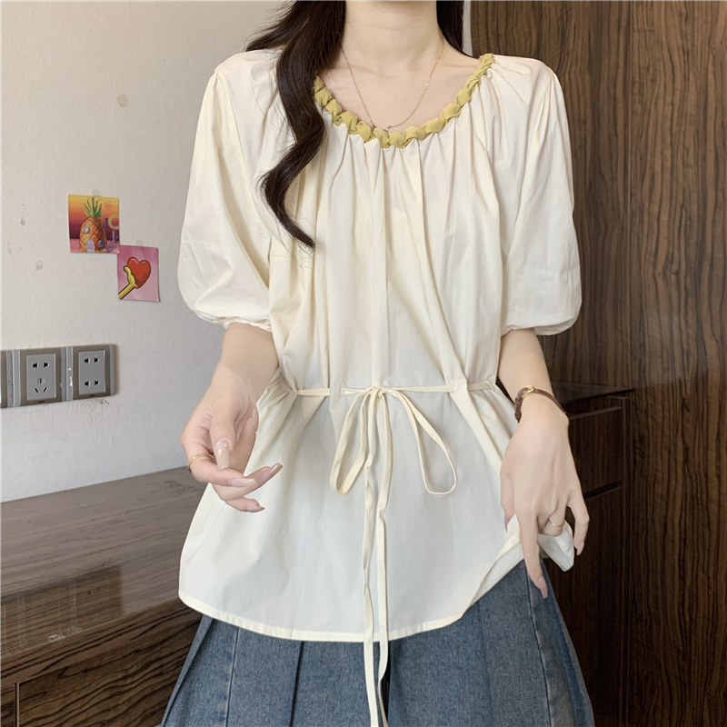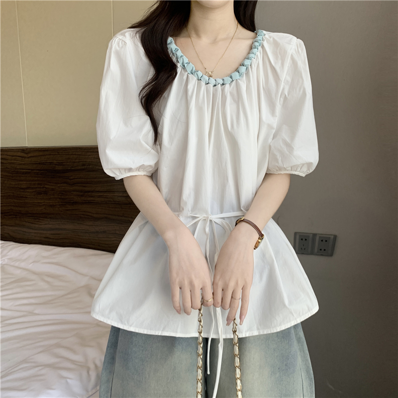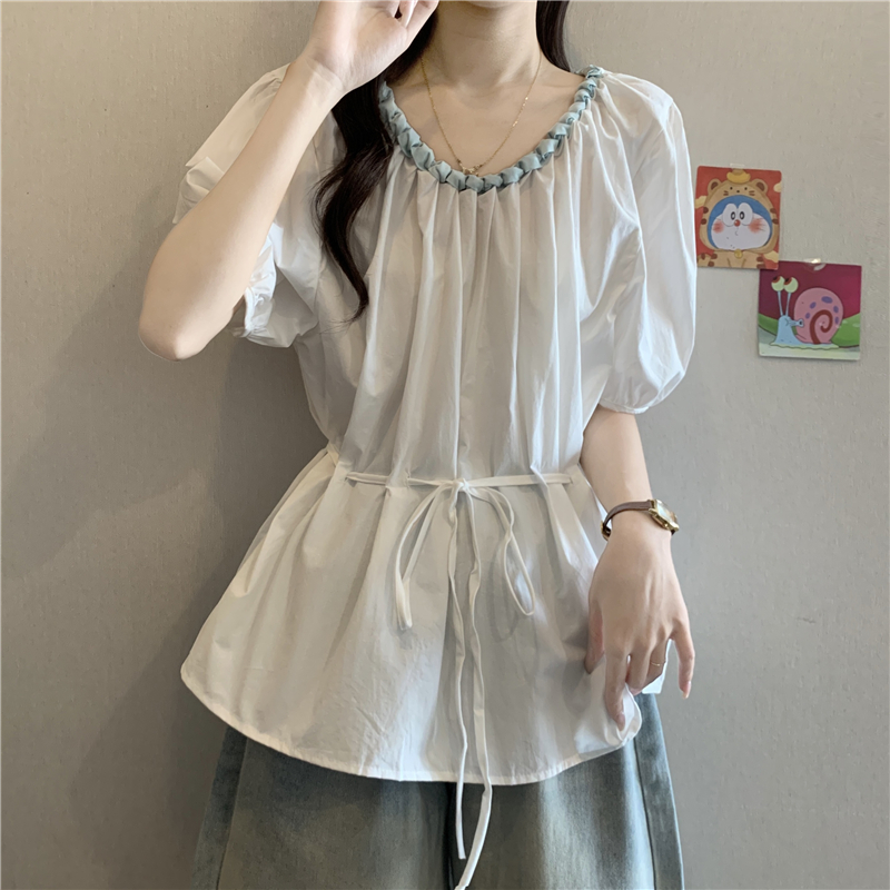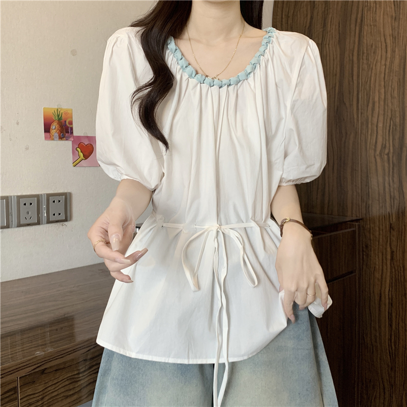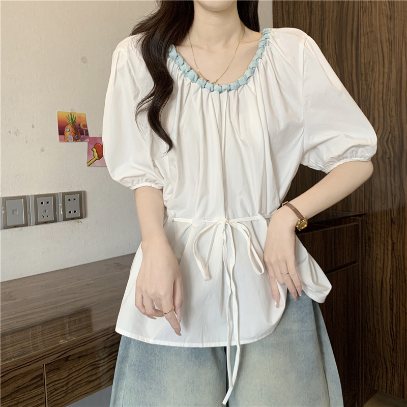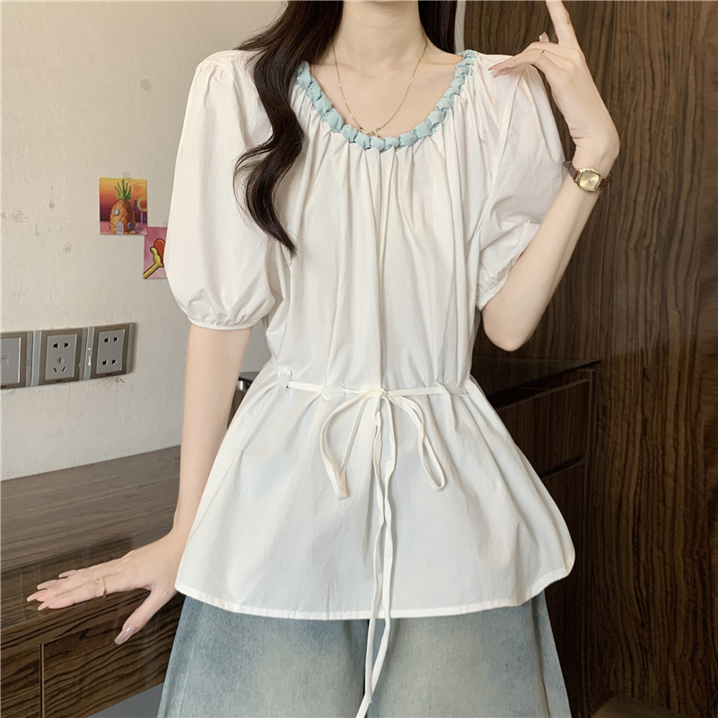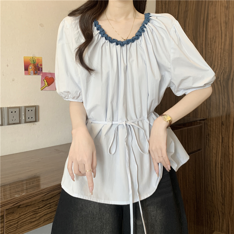 외국 가스 배색 짜임 레이스 라운드 넥 반팔 여성 셔츠 여름 빅 사이즈 지방 mm 레이스업 허리 수축 인형 셔츠 맨위