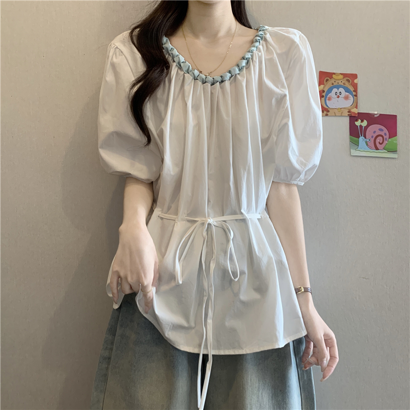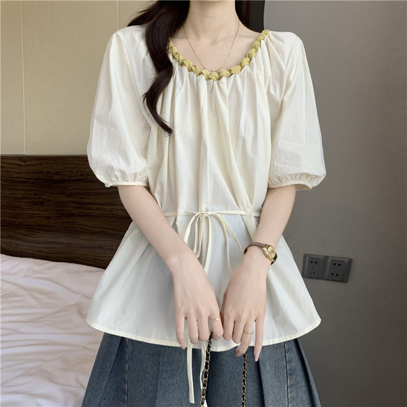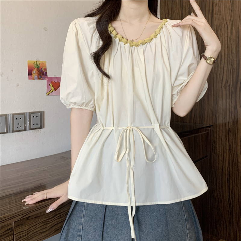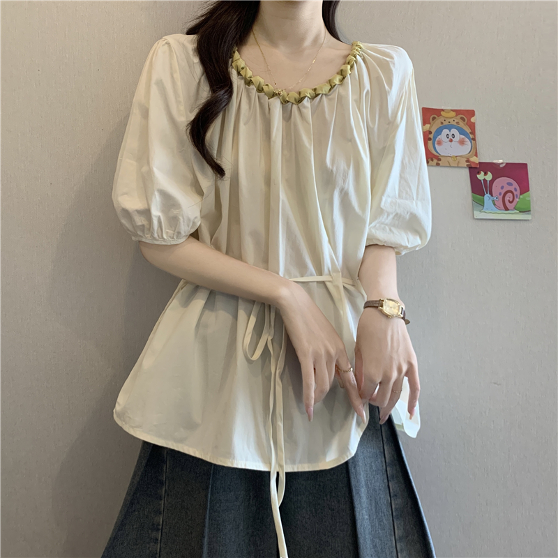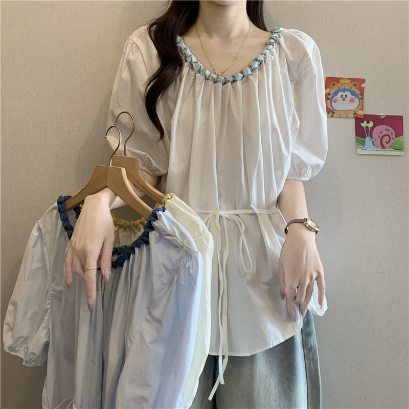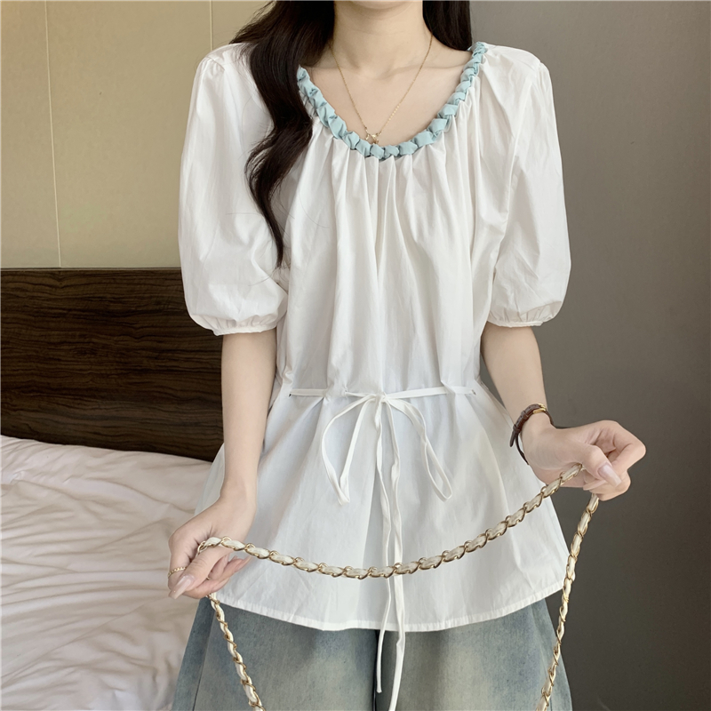 외국 가스 배색 짜임 레이스 라운드 넥 반팔 여성 셔츠 여름 빅 사이즈 지방 mm 레이스업 허리 수축 인형 셔츠 맨위