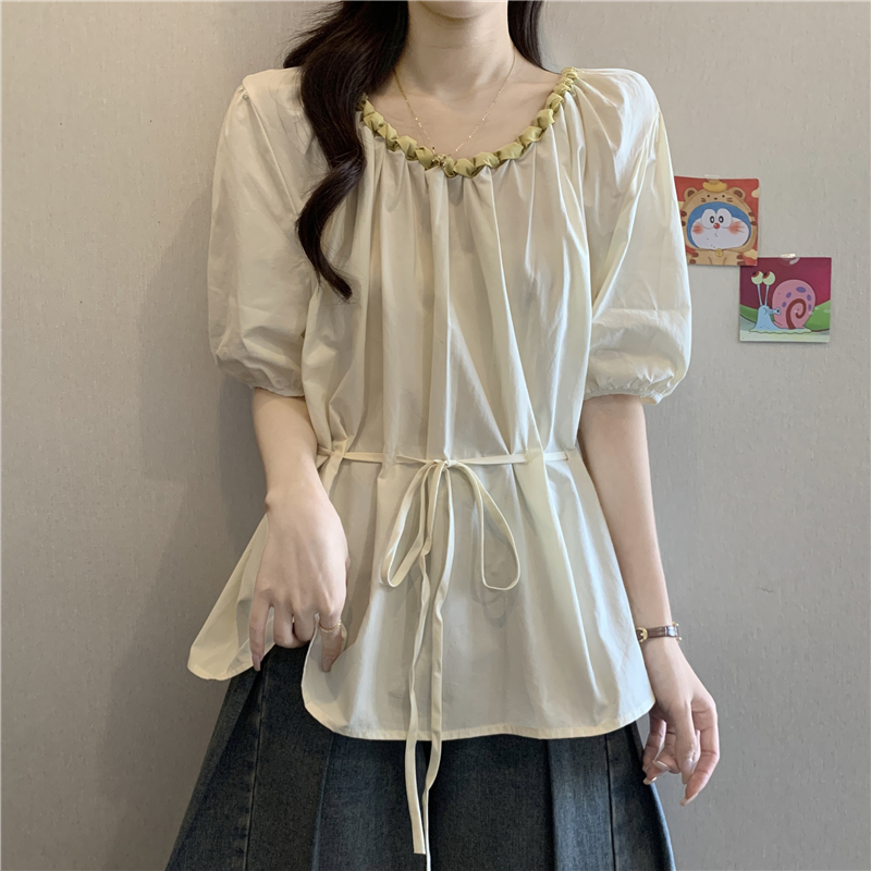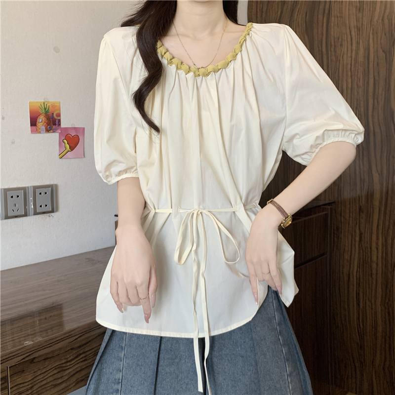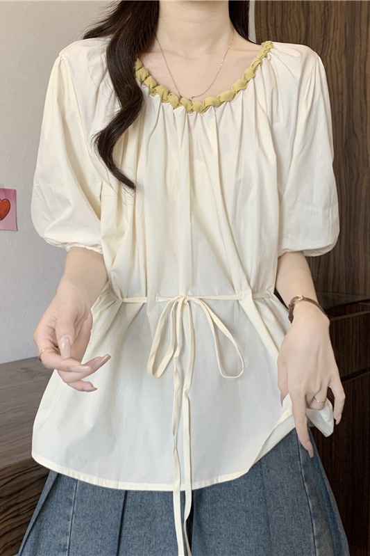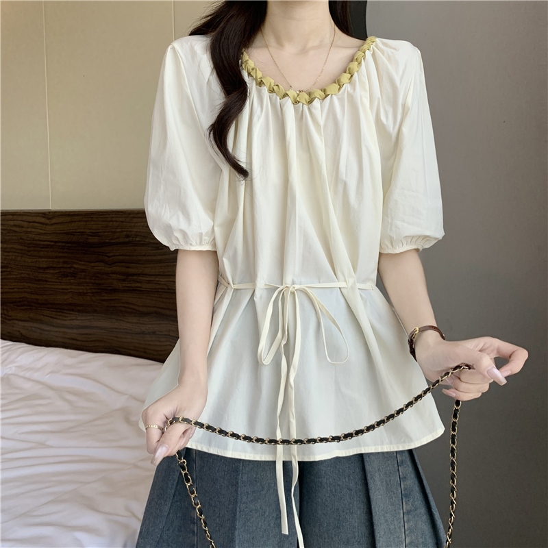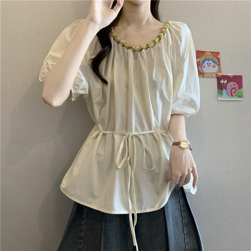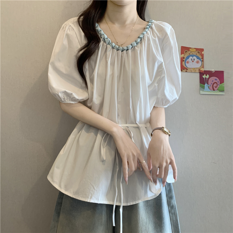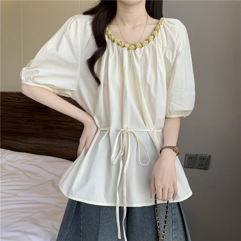 외국 가스 배색 짜임 레이스 라운드 넥 반팔 여성 셔츠 여름 빅 사이즈 지방 mm 레이스업 허리 수축 인형 셔츠 맨위
