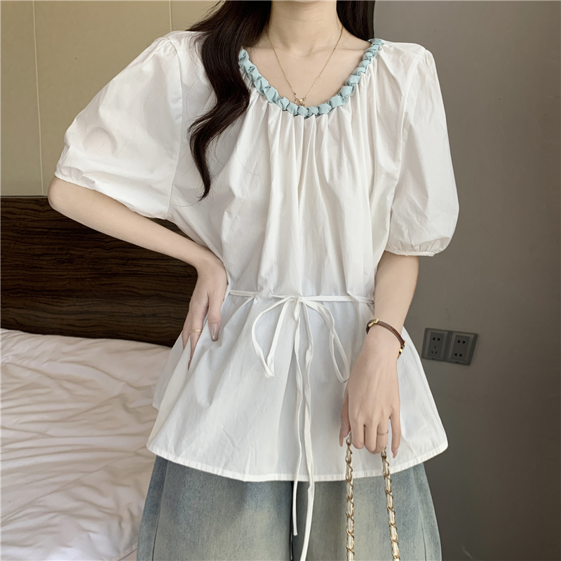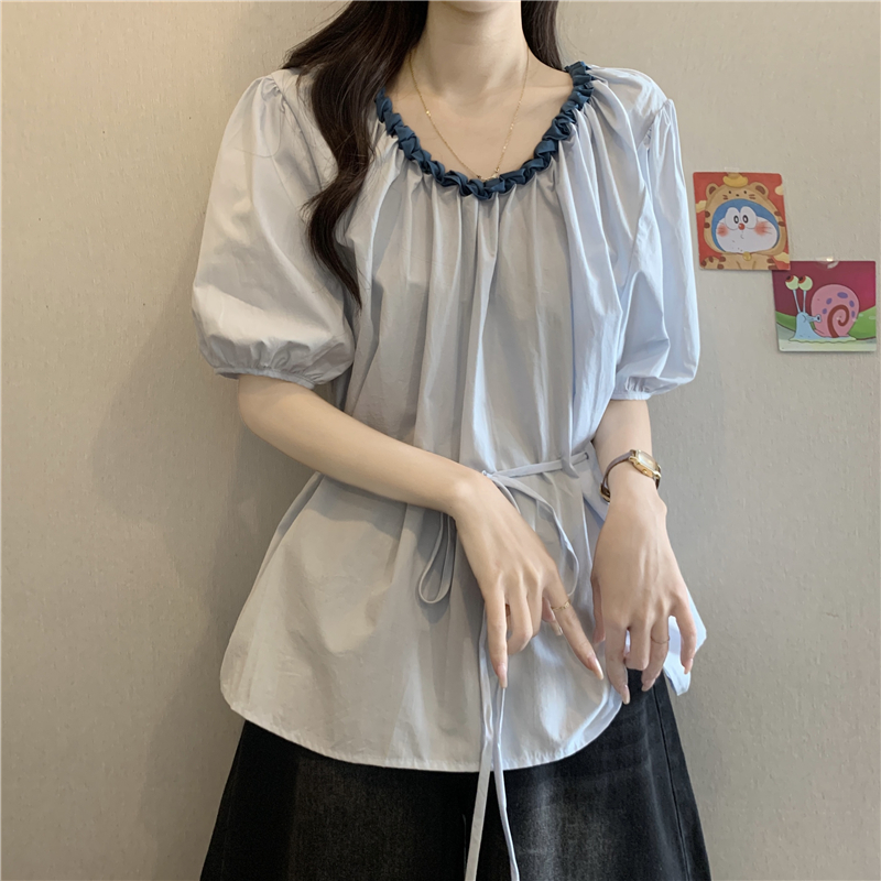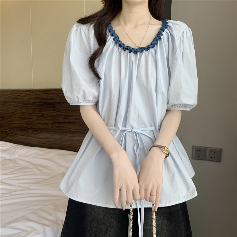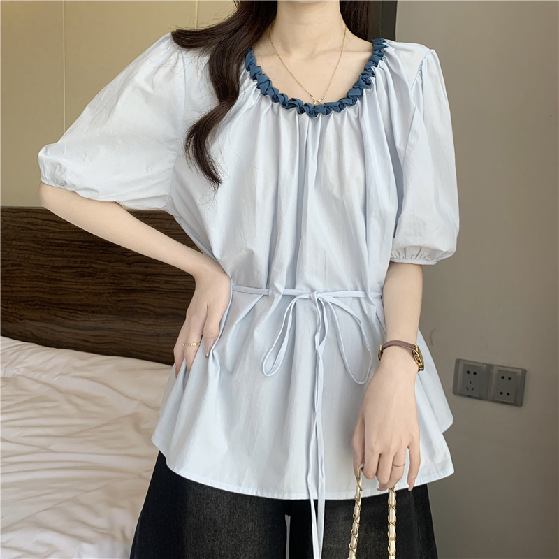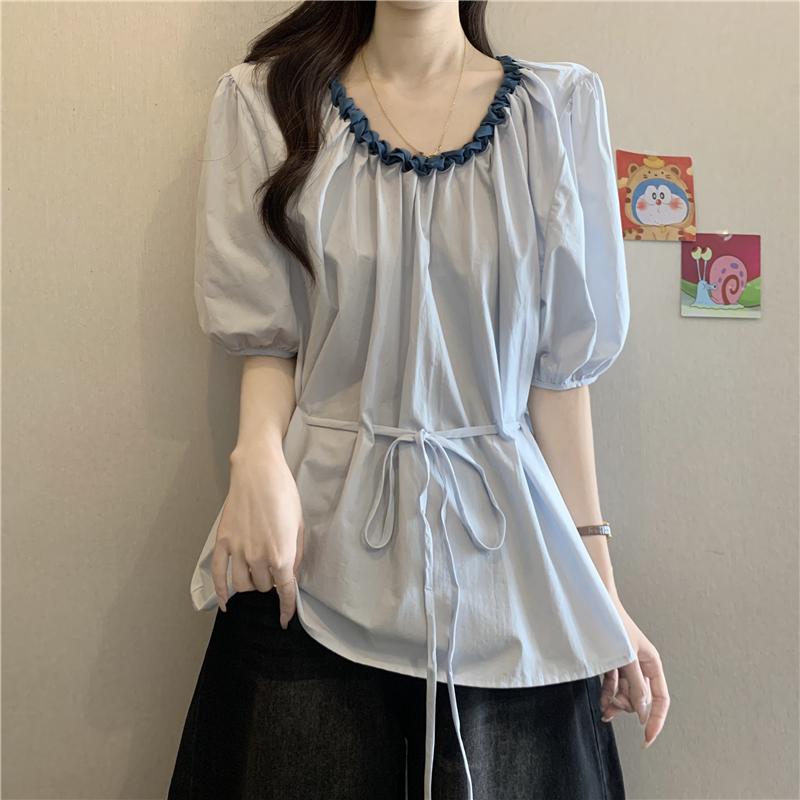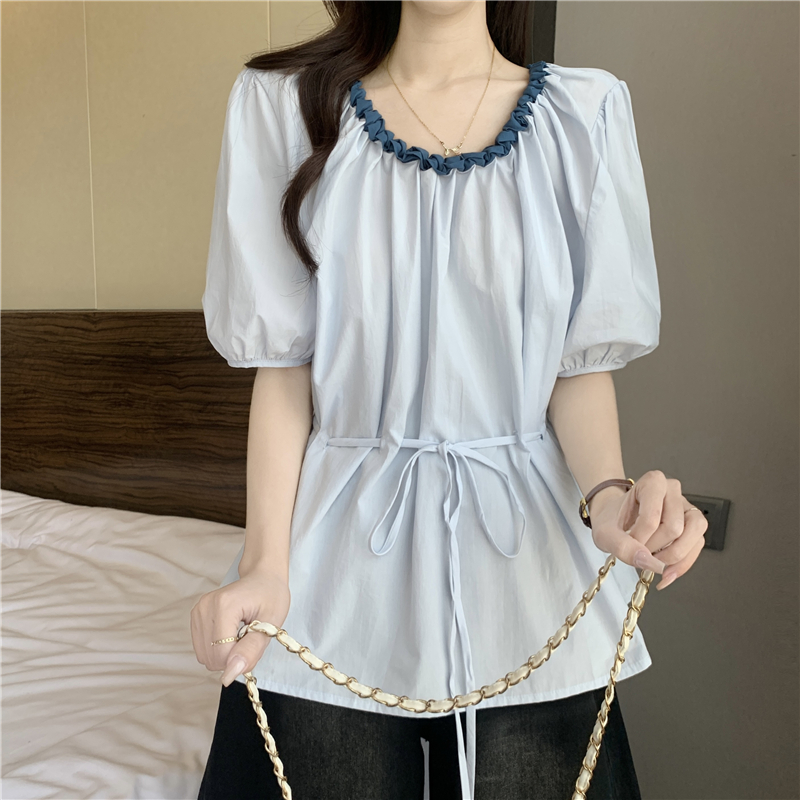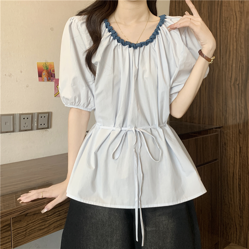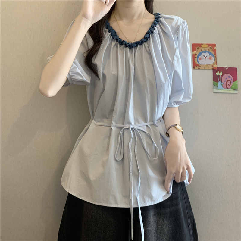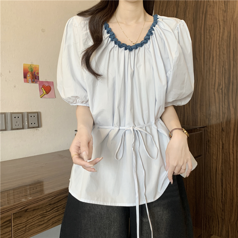 하늘색 외국 가스 레이스 칼라 작은 날다 반팔 여성 셔츠 2026 여름 지방 mm 레이스업 허리 수축 인형 셔츠 맨위