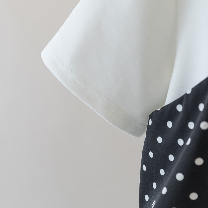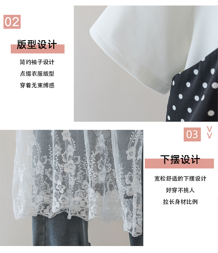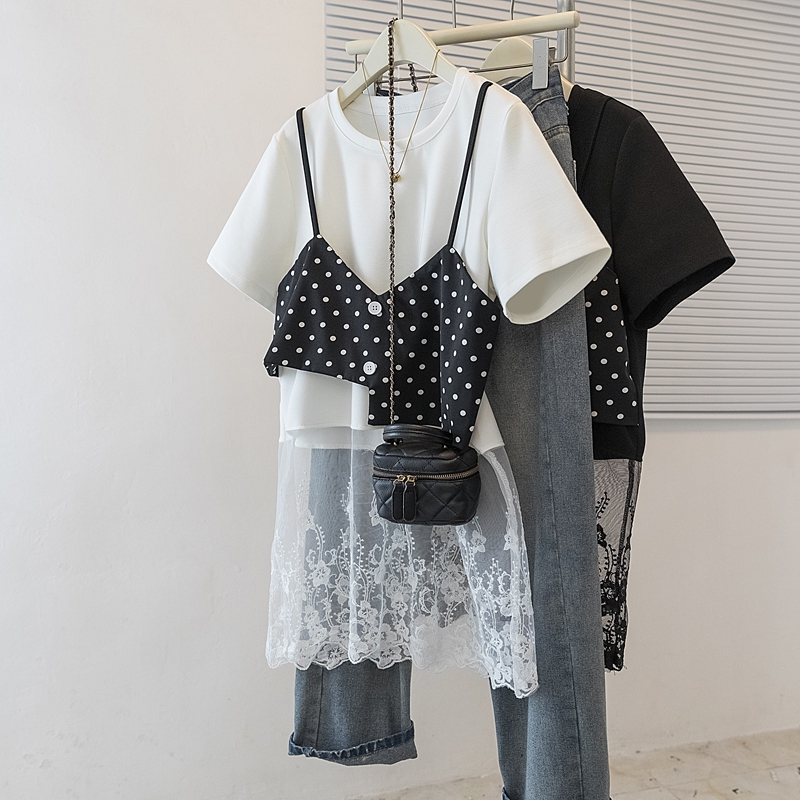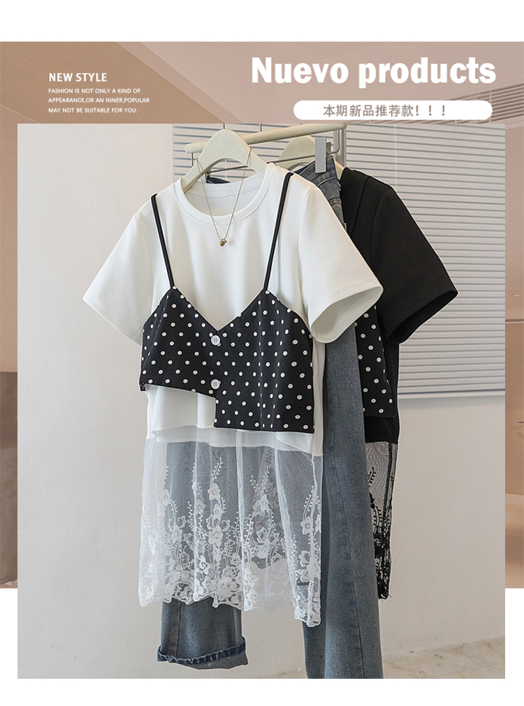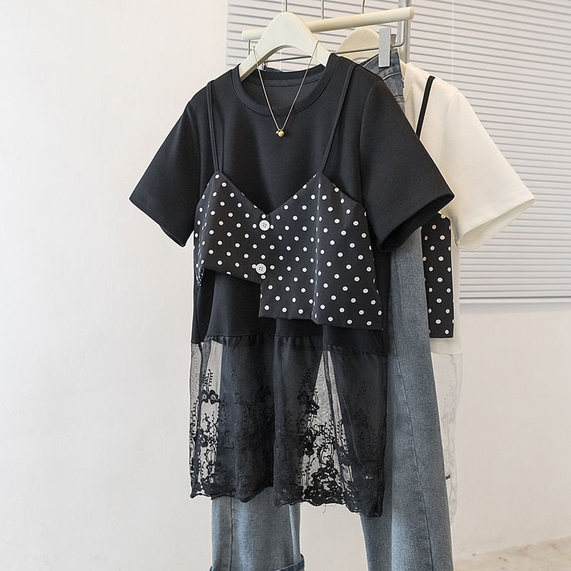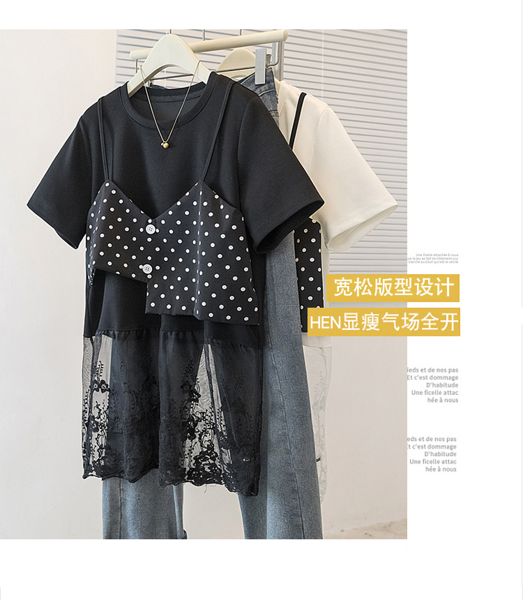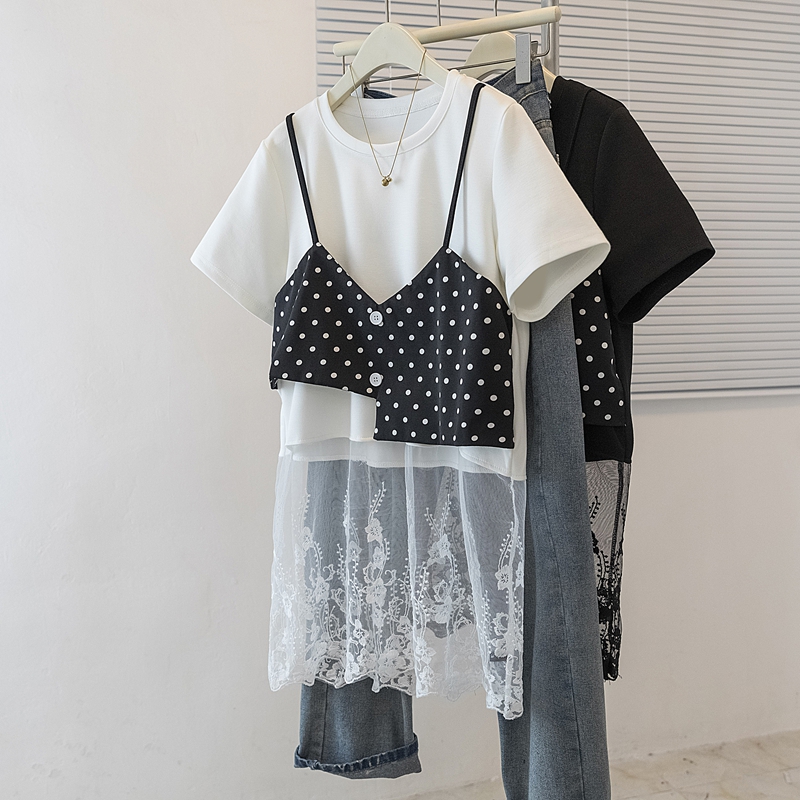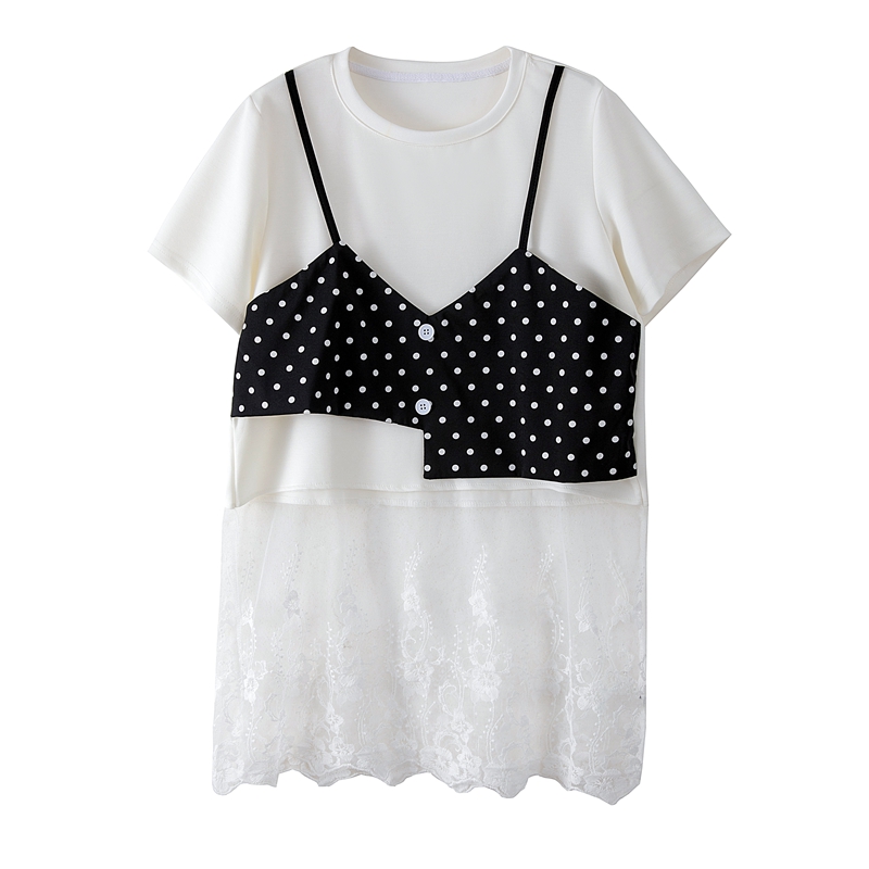 실사 빅 사이즈 페이크 레이어드 레이스 반팔 맨위 도트 무늬 여성 지방 mm 여름 표지 고기 빅 사이즈 여성 의류