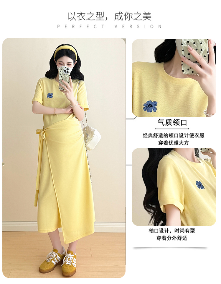 실사 지금 지금 2026 임산부 새로운 라운드 넥 알파벳 반팔 티셔츠 길다 치마 여름 루즈핏 캐주얼 드레스