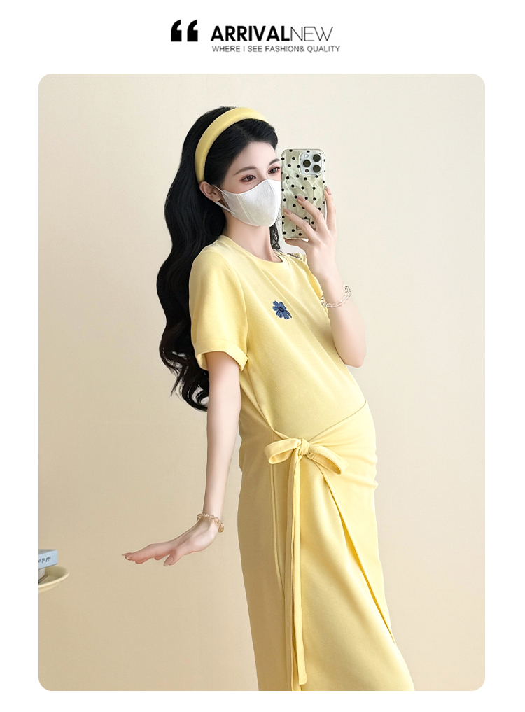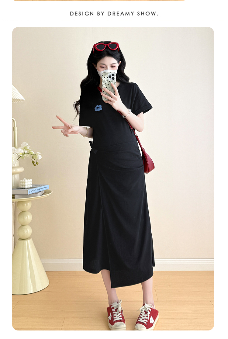 2026 실사 여름 새로운 슬림해 보이는 여성 자수 패키지 과립 버클 중간 길이 임산부 패션 폴로 칼라 드레스