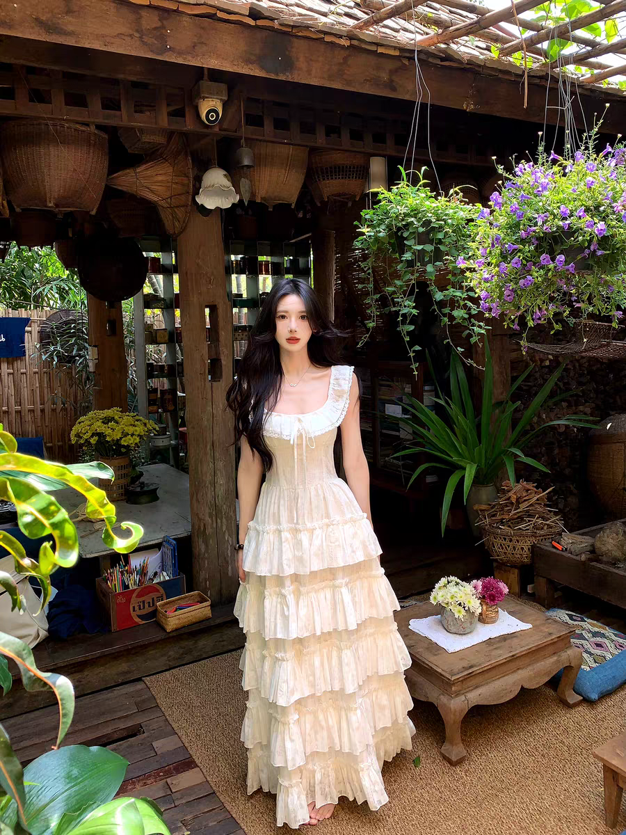 화이트 워터 여성 꽃 와 앨리스 광장 칼라 레이스 치마 여성 여름 휴가 바람 도루 센스 슬림해 보이는 큰 진자 드레스