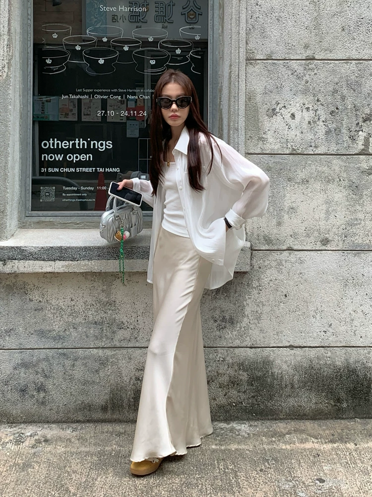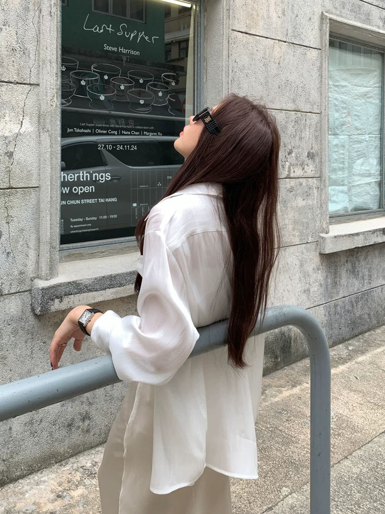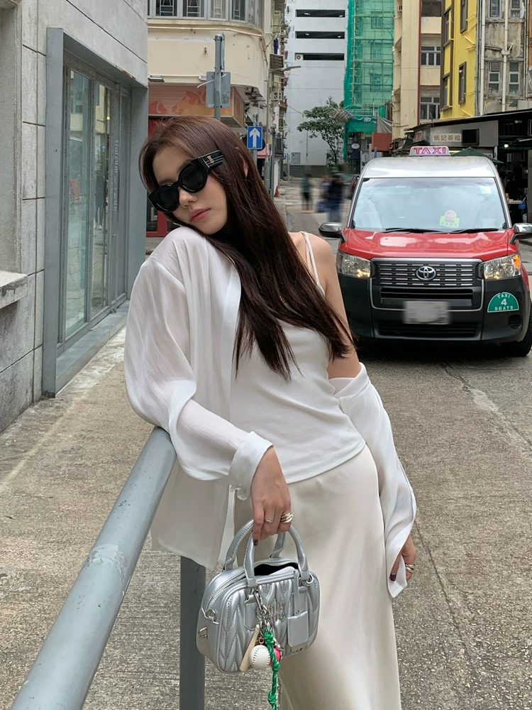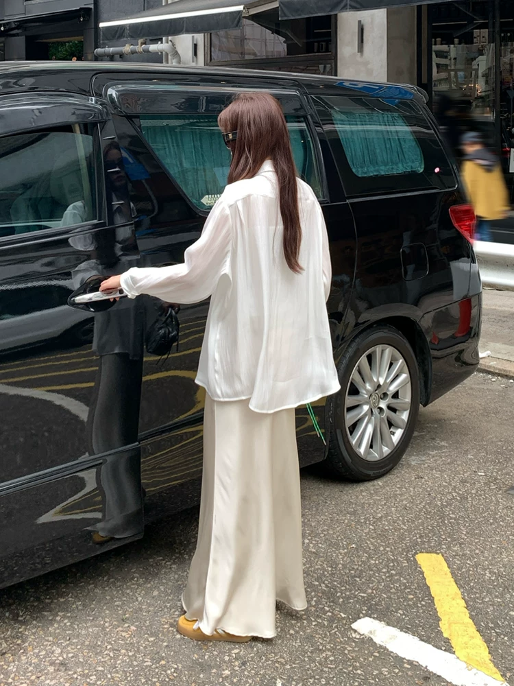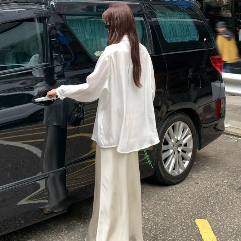고급 센스 얇은 스타일 루즈핏 주간 실크 여성 셔츠 여름 긴팔 맨위 자외선 차단 셔츠 카디건 코트 외부 가져 가라. 화이트