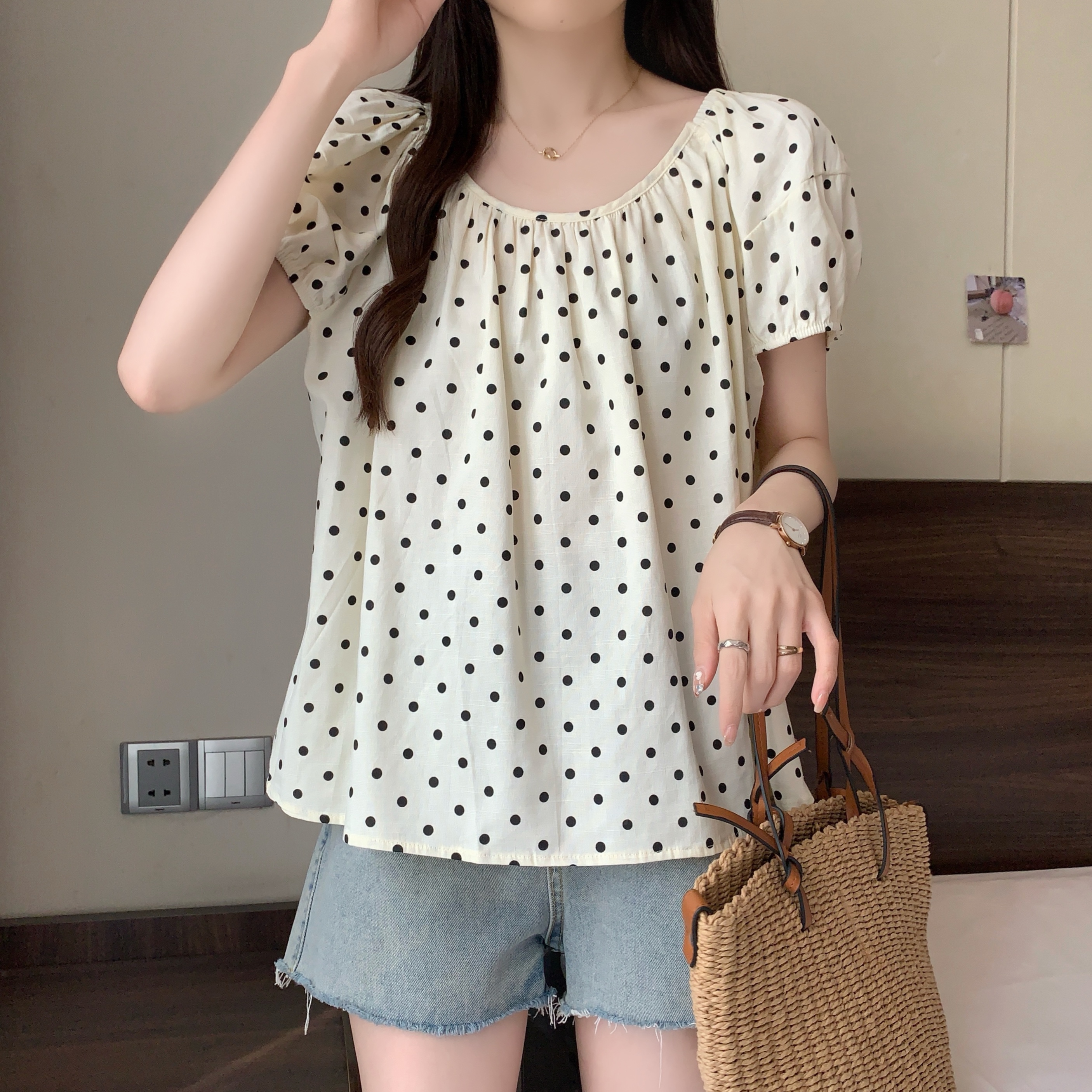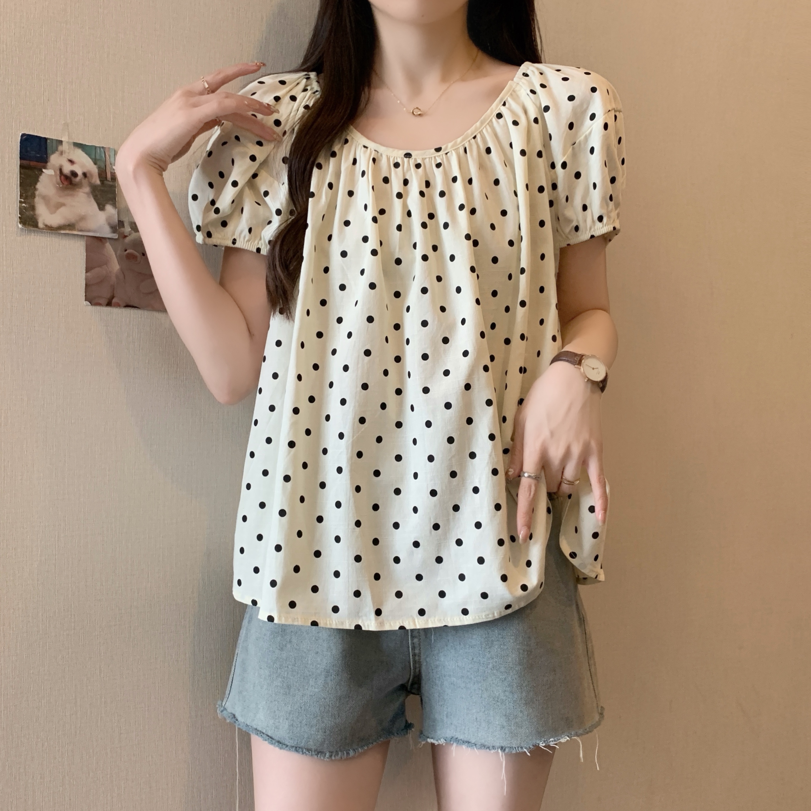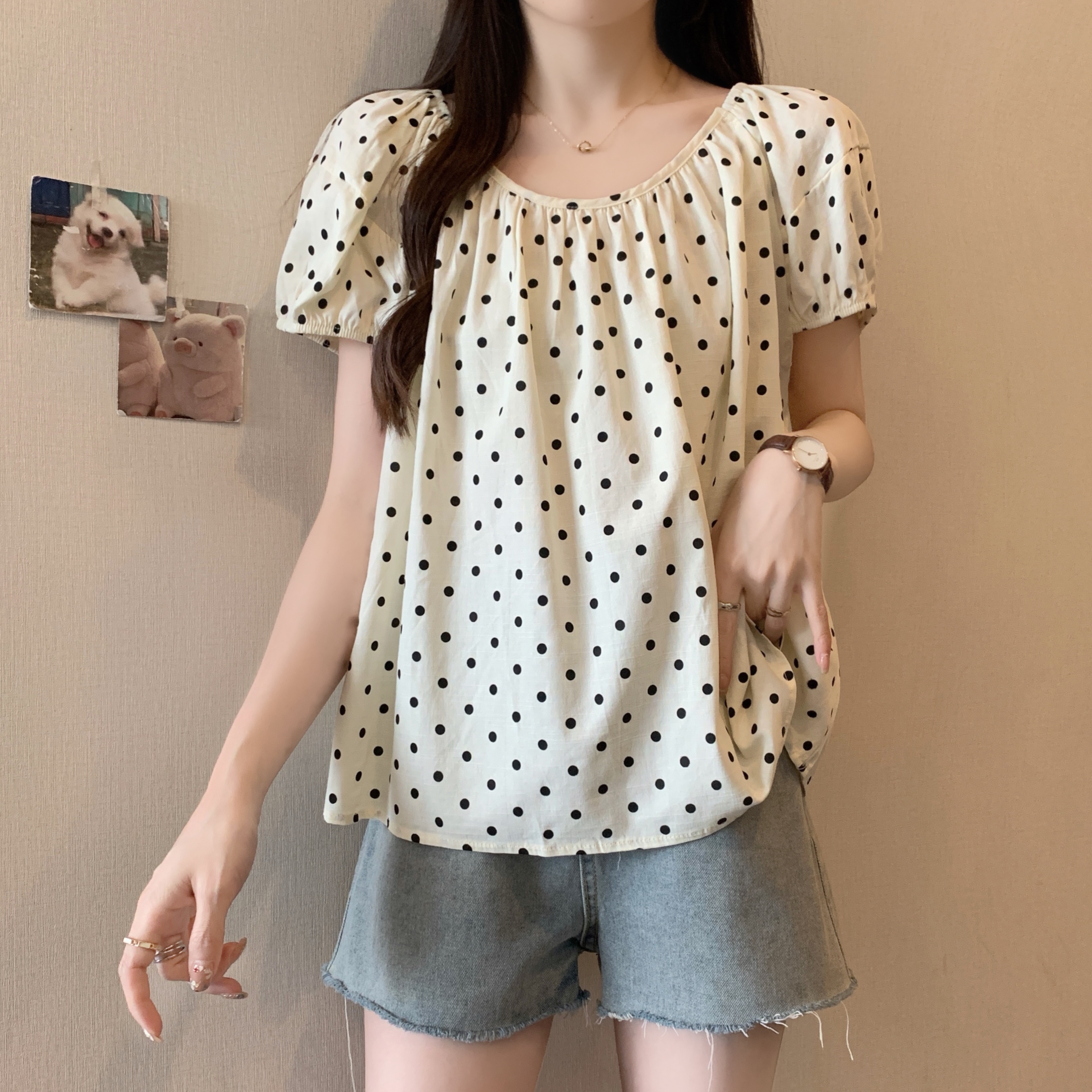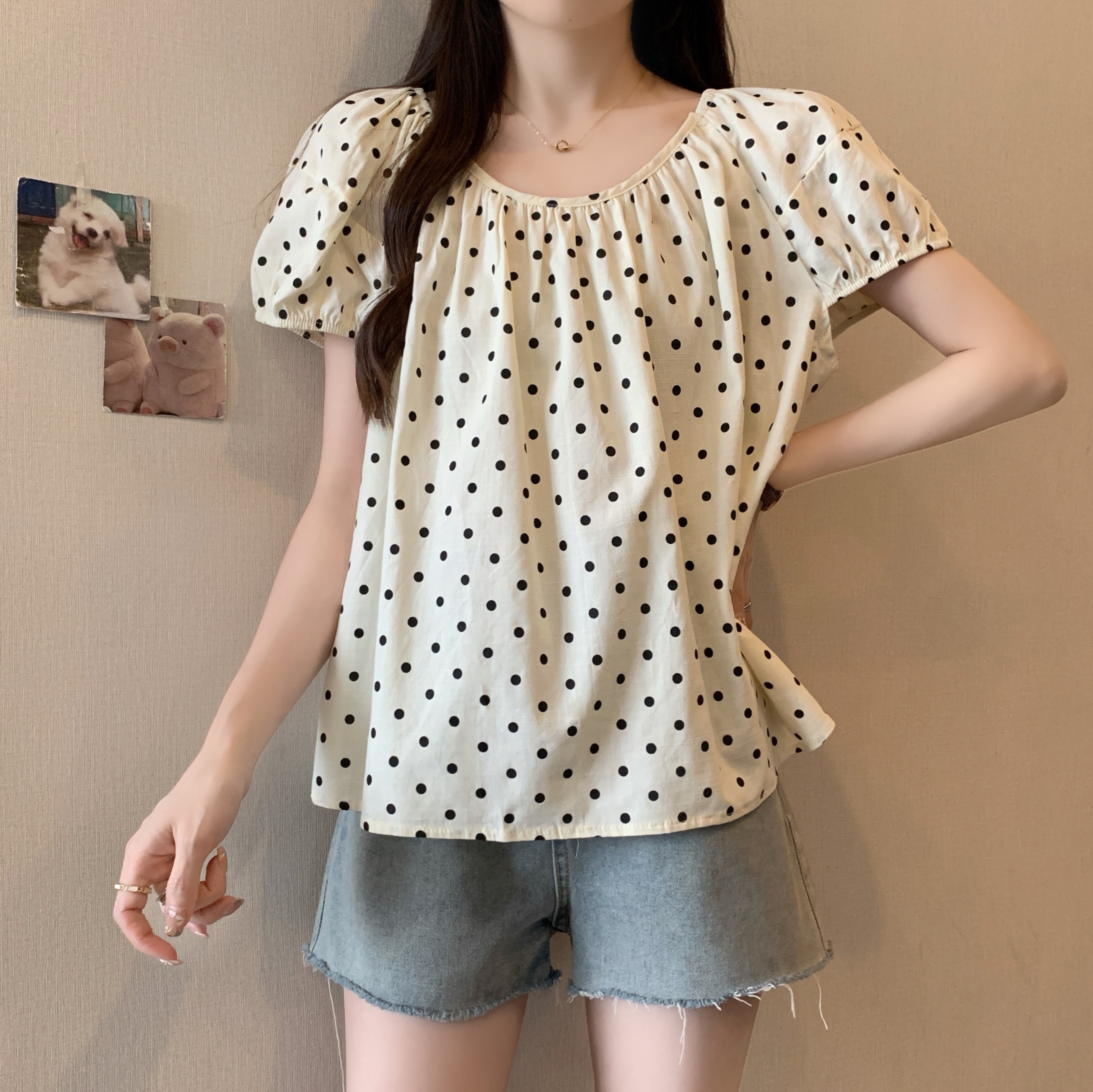 실사 2207# 빅 사이즈 여성 의류 미니멀리즘 부드러운 바람 도트 무늬 라운드 넥 버블 반팔 품격 슬림해 보이는 맨위