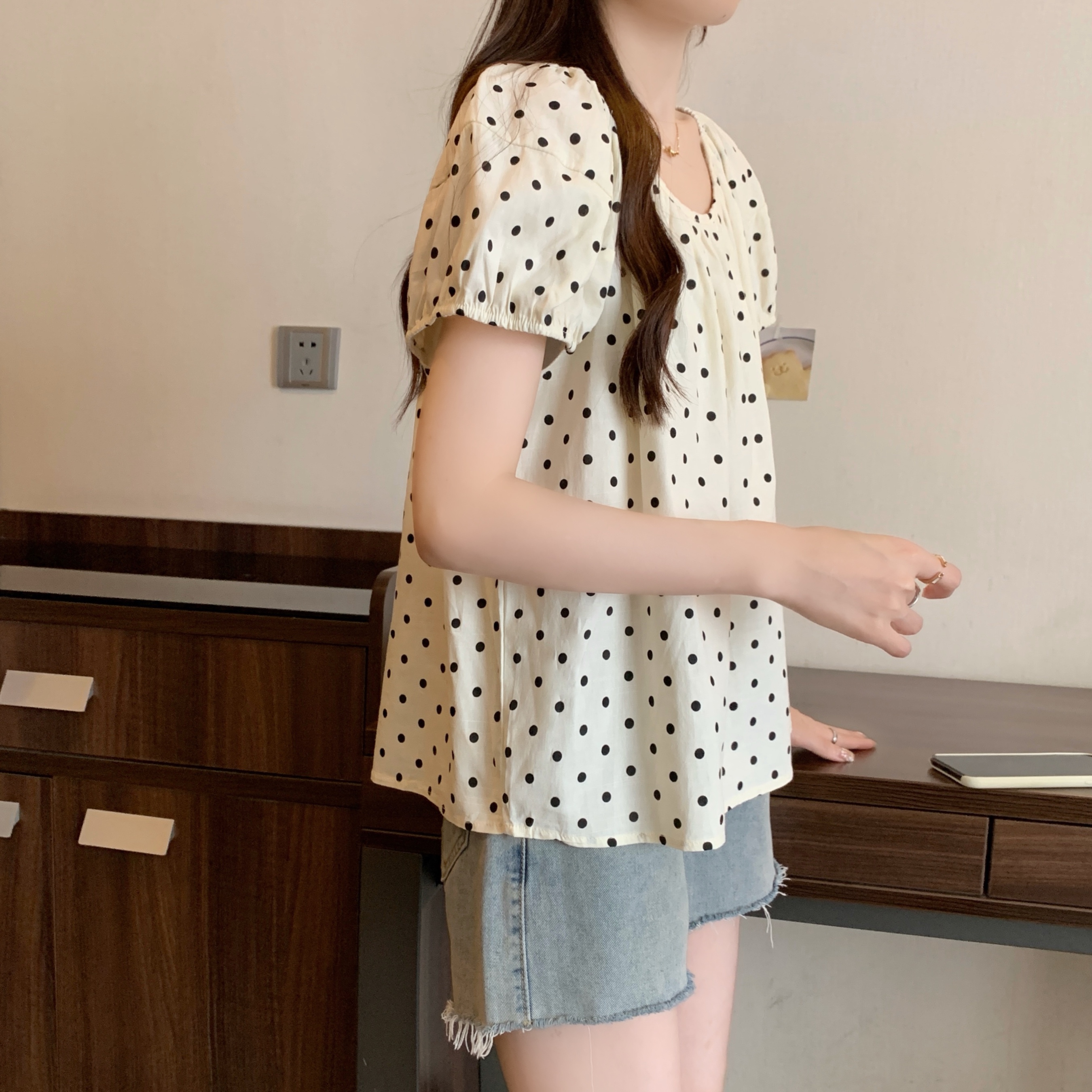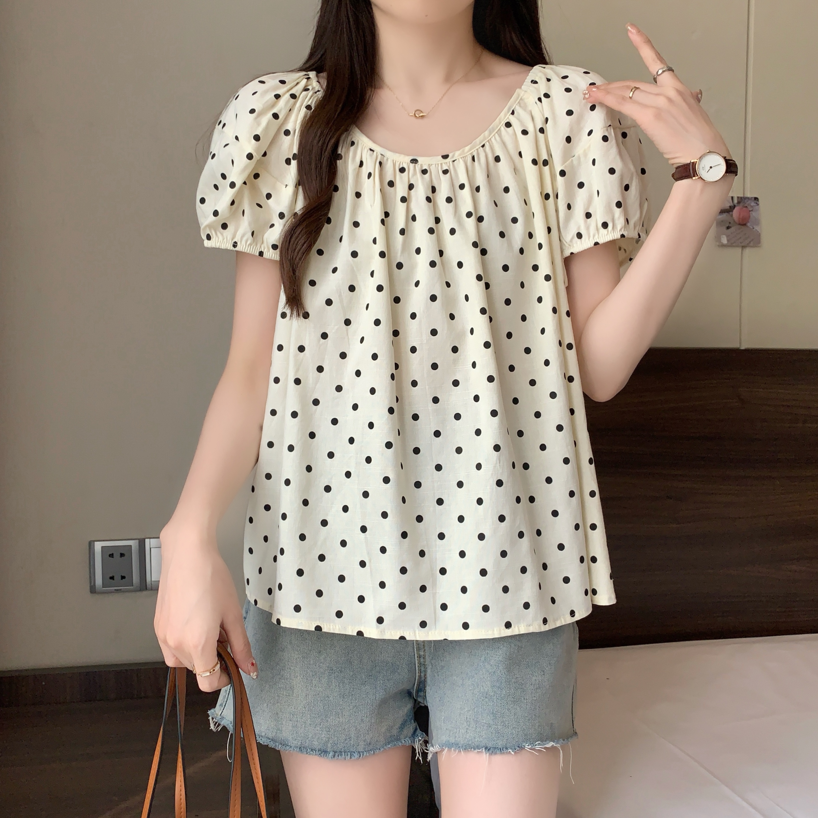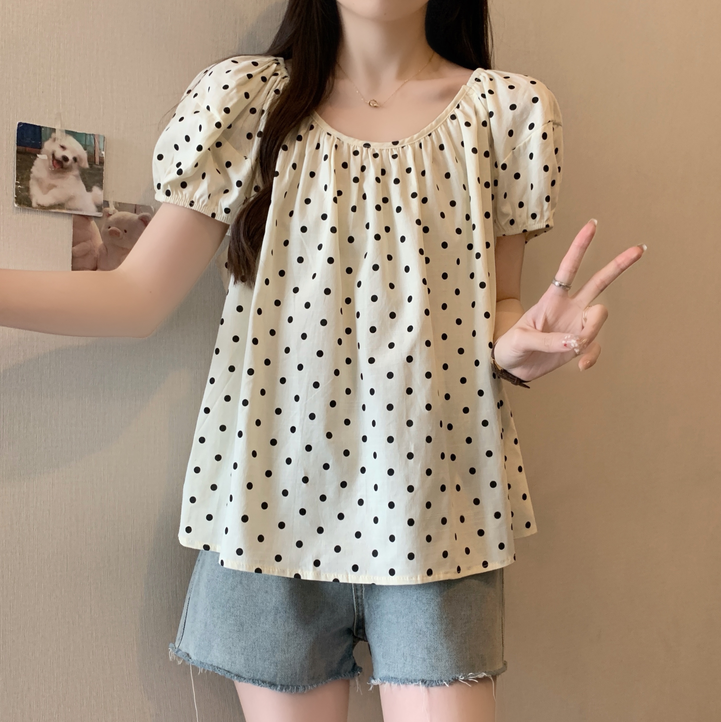 실사 2207# 빅 사이즈 여성 의류 미니멀리즘 부드러운 바람 도트 무늬 라운드 넥 버블 반팔 품격 슬림해 보이는 맨위