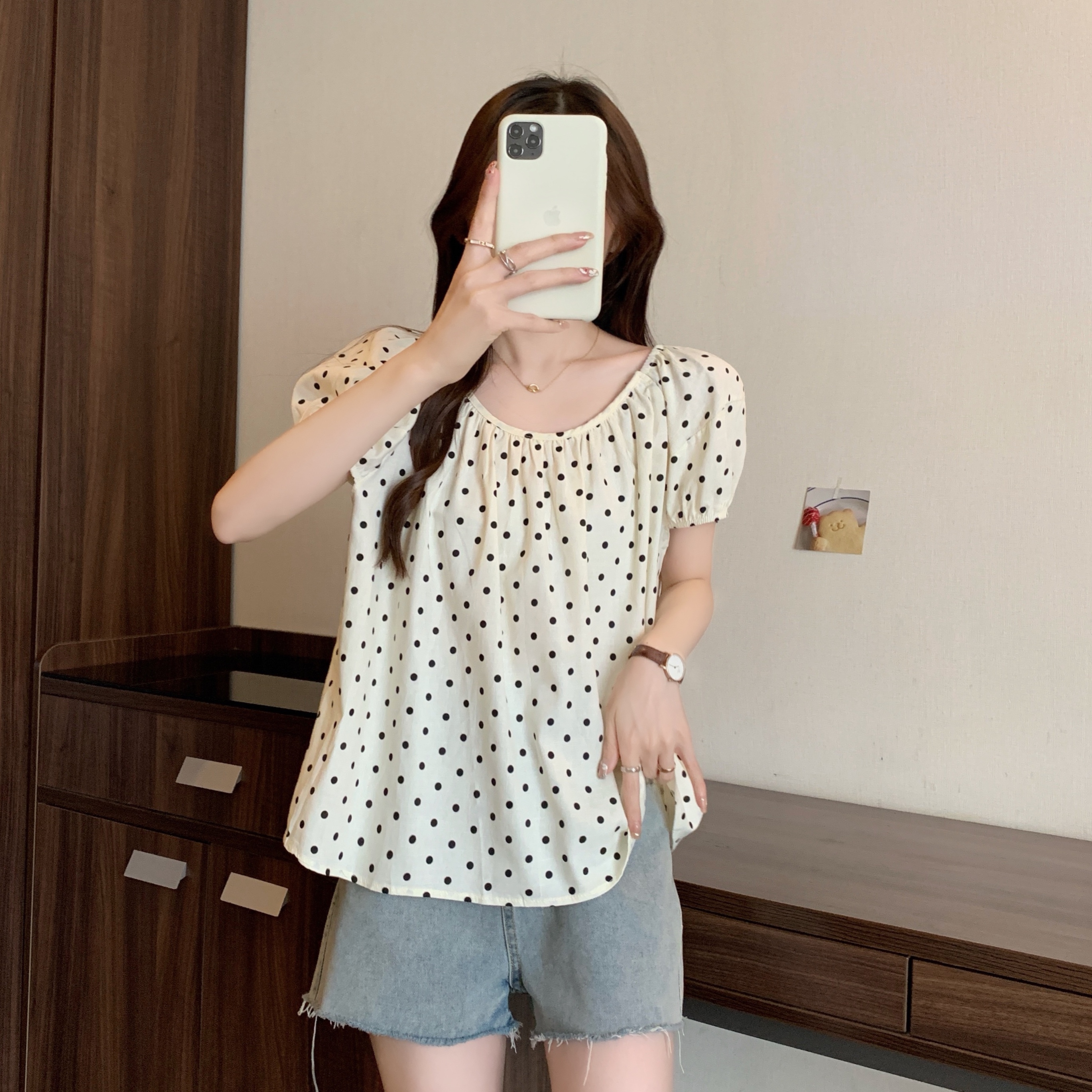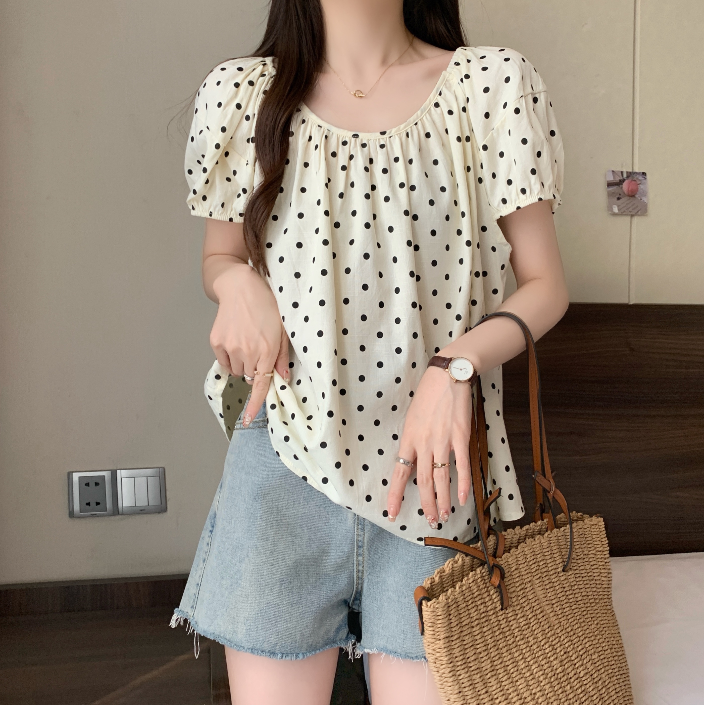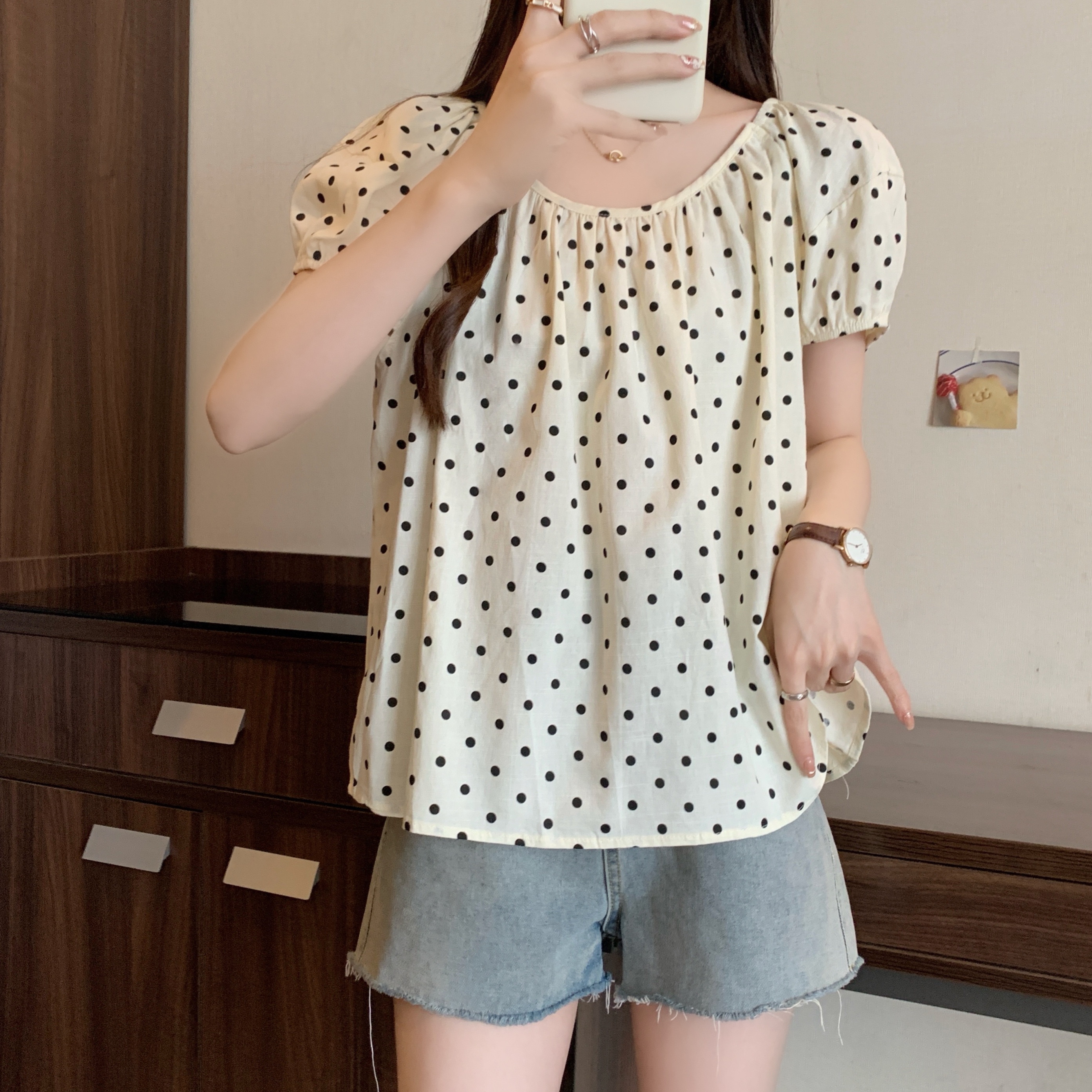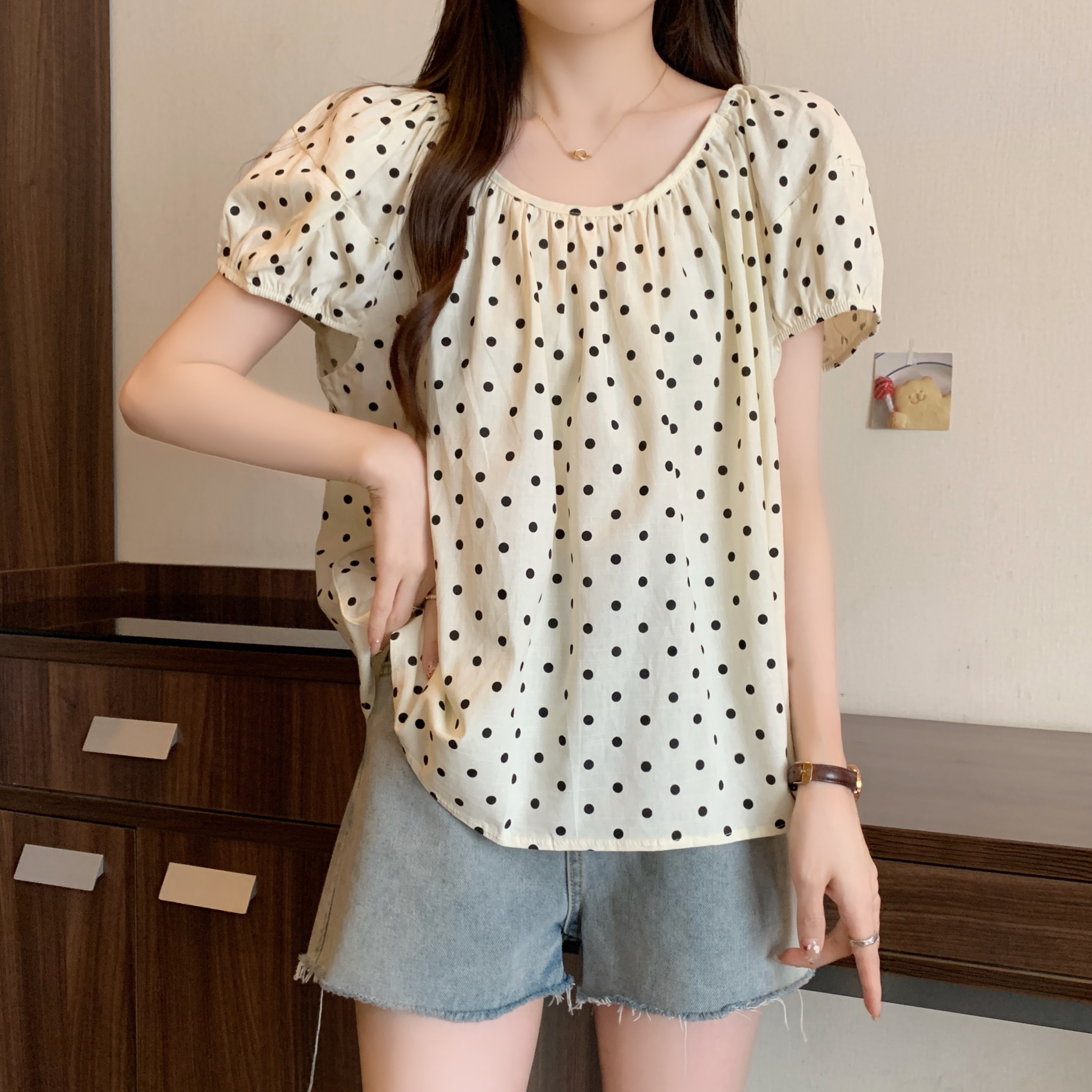 실사 2207# 빅 사이즈 여성 의류 미니멀리즘 부드러운 바람 도트 무늬 라운드 넥 버블 반팔 품격 슬림해 보이는 맨위