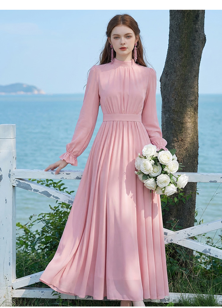 06 년 봄 여름 새로운 여성 프랑스식 우아함 품격 허리 수축 슬림해 보이는 핑크색 고급 센스 긴팔 드레스