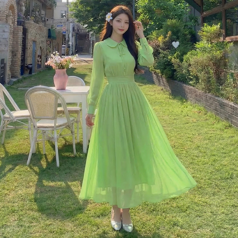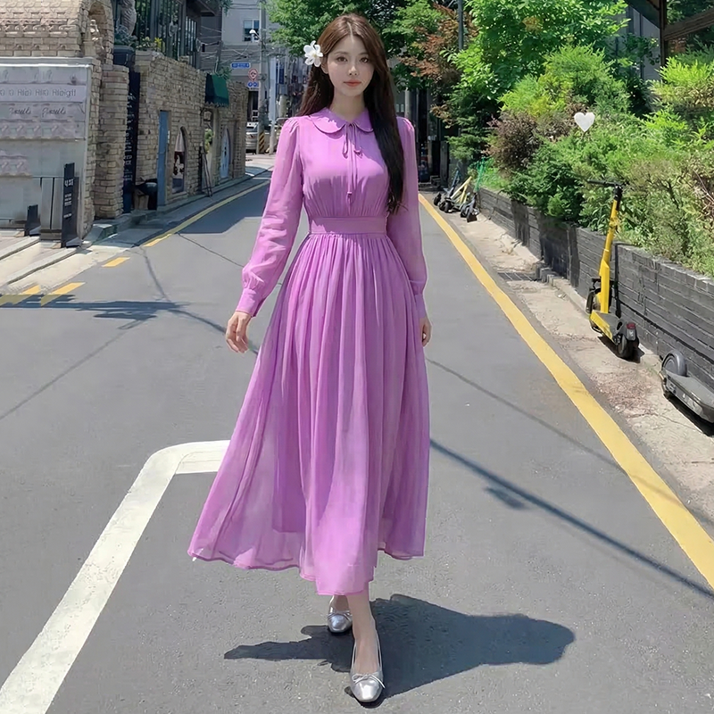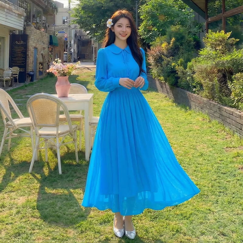 봄 여름 새로운 패션 프랑스식 베이비 칼라 긴팔 쉬폰 여성 드레스 품격 해변가 휴가 해변 길다 치마
