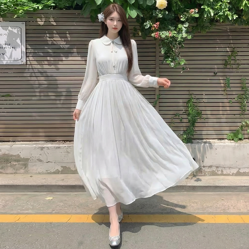 2026 새로운 프랑스식 베이비 칼라 화이트 여성 드레스 여름 품격 해변가 휴가 롱 스커트 긴팔 해변 드레스