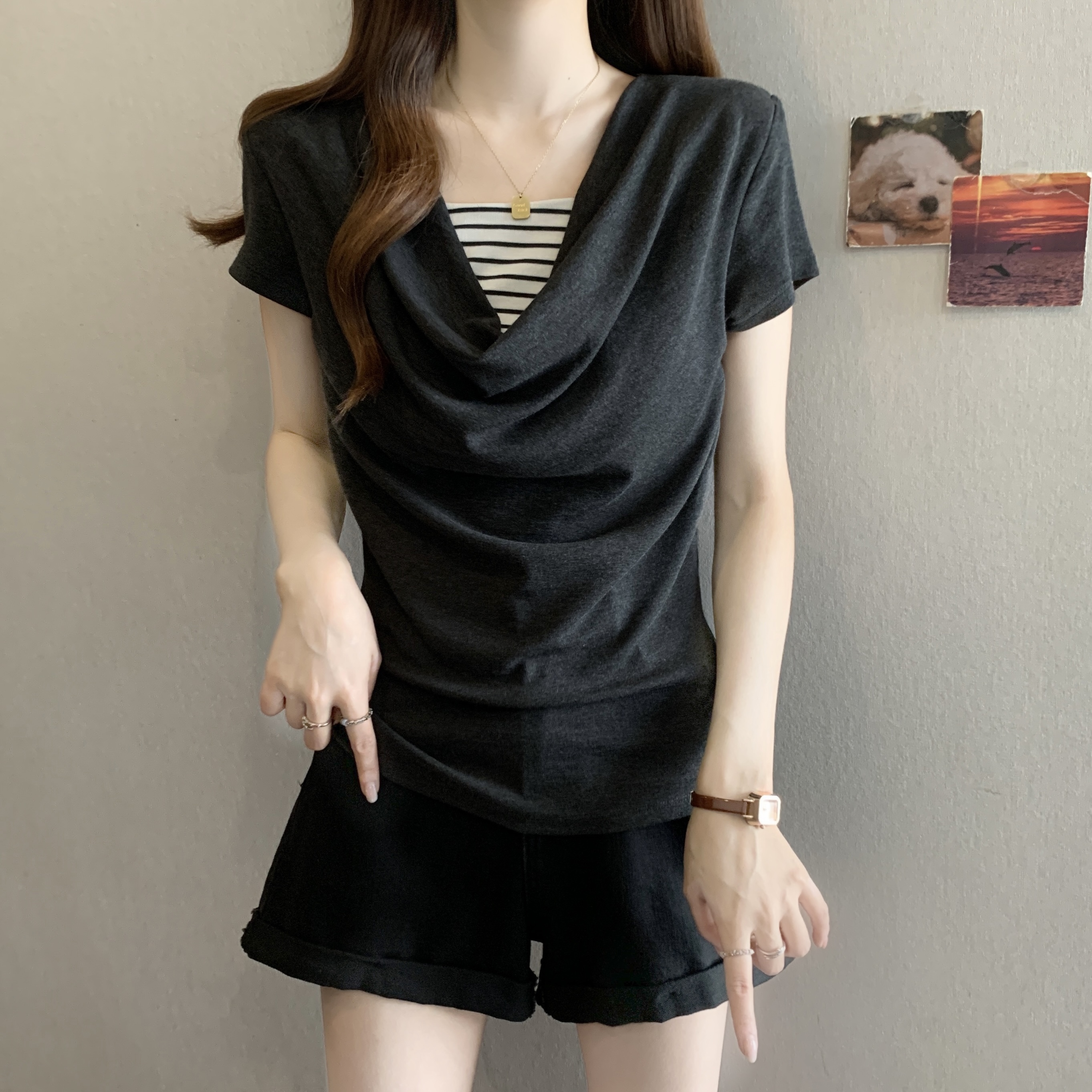 빅 사이즈 여성 의류 한 부서 연령 감소 디자인 짧은 티셔츠 여성 레트로 슬립 패치워크 사실 두 조각 통통한 여동생 맨위 여름