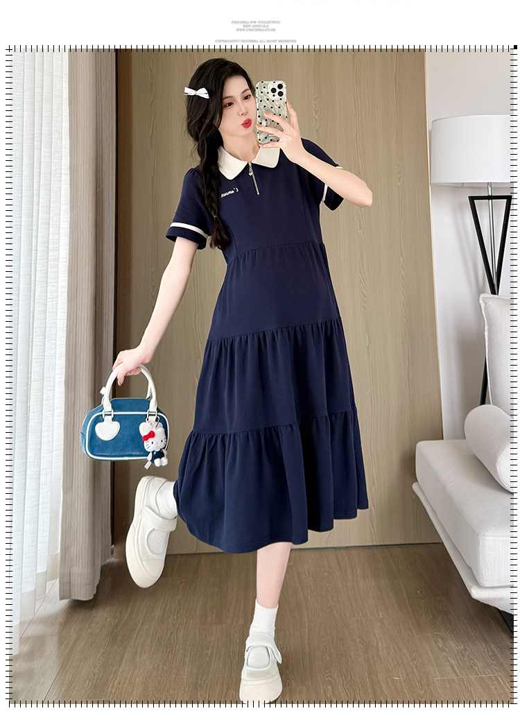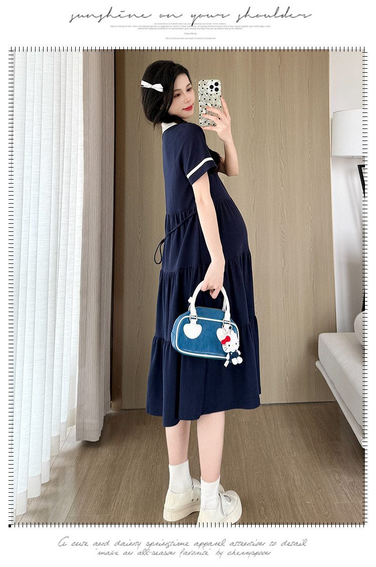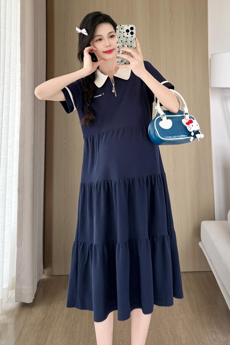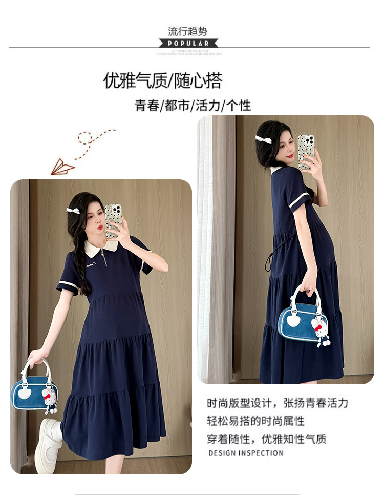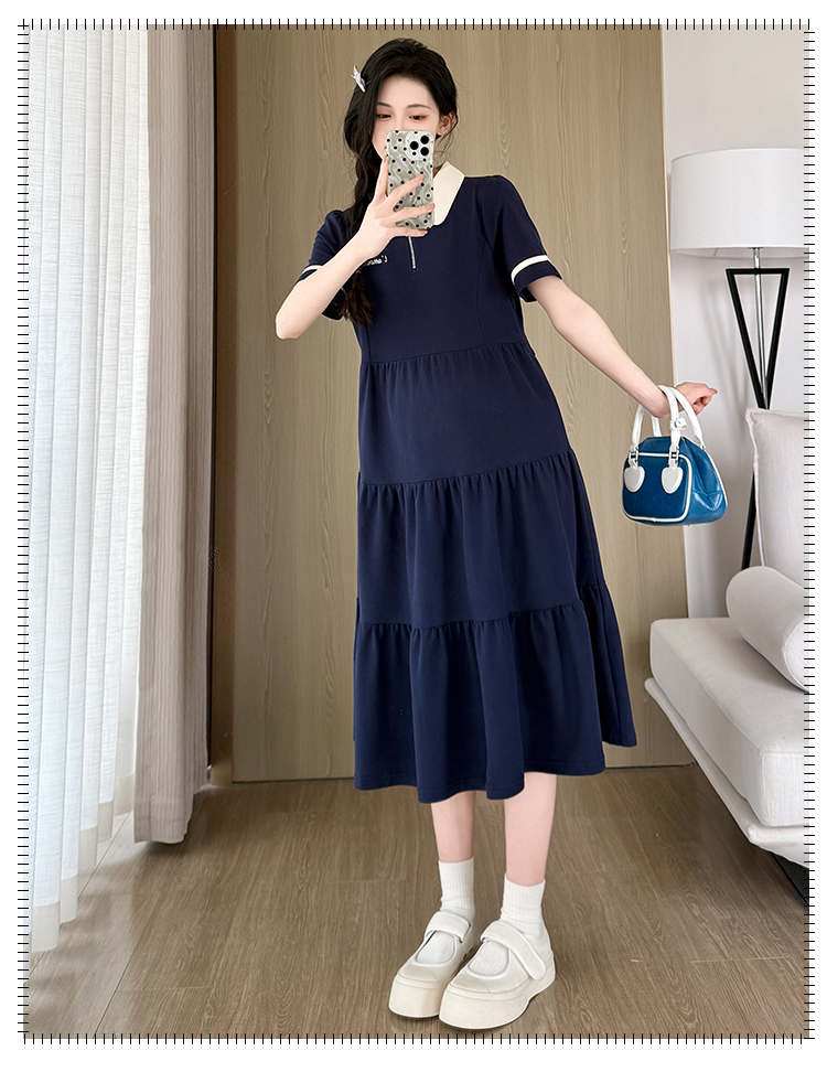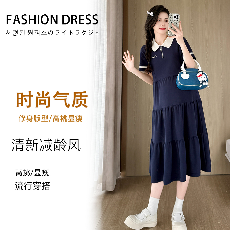 2026 실사 임산부 드레스 여름 새로운 해군 POLO 칼라 반팔 루즈핏 빅 사이즈 허리 수축 드레스