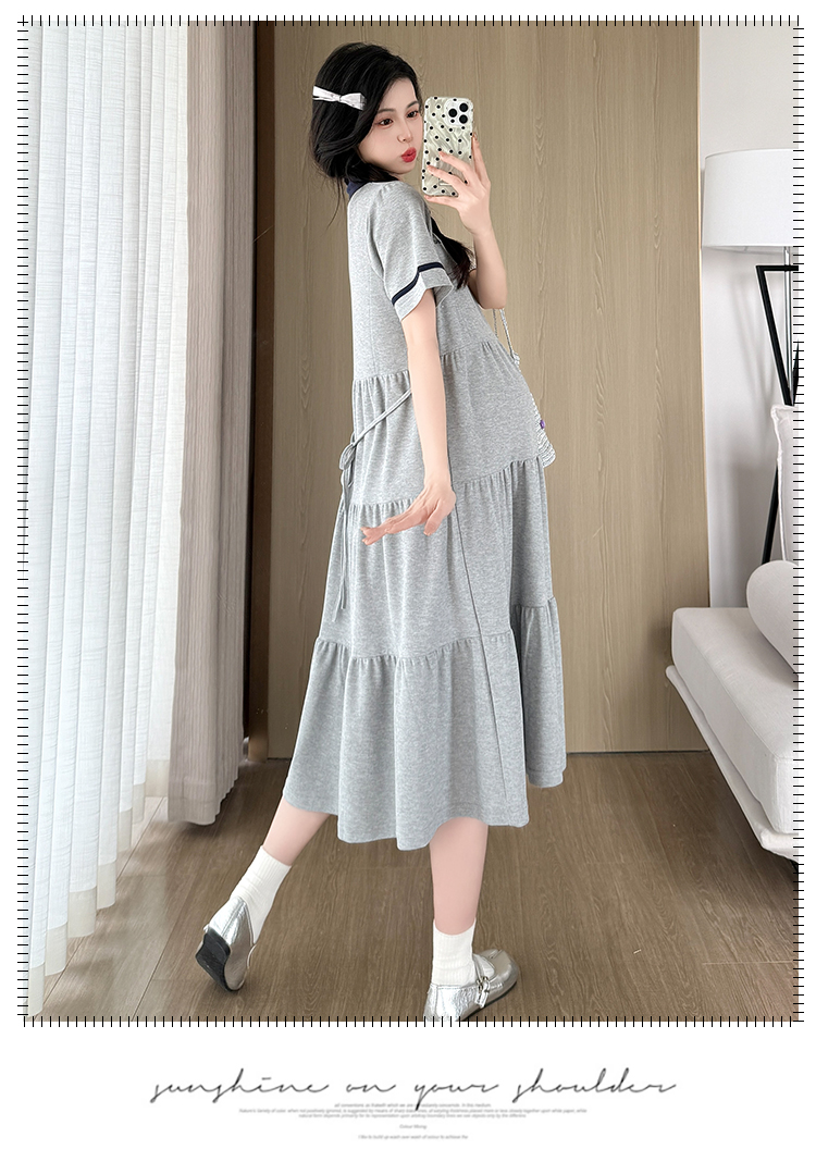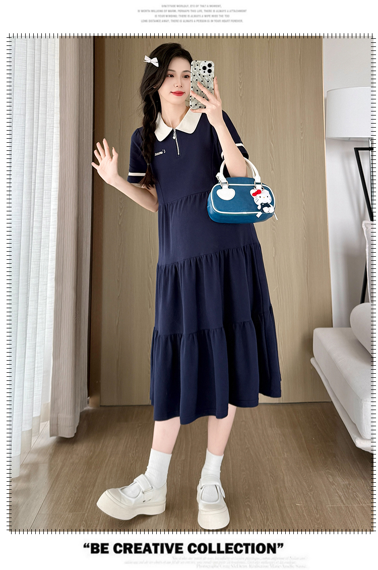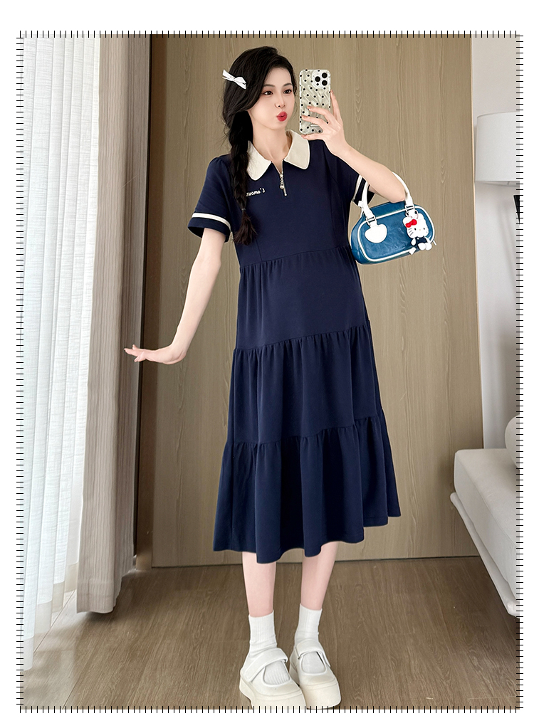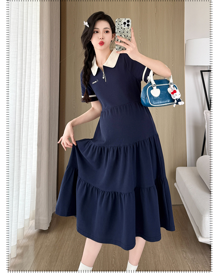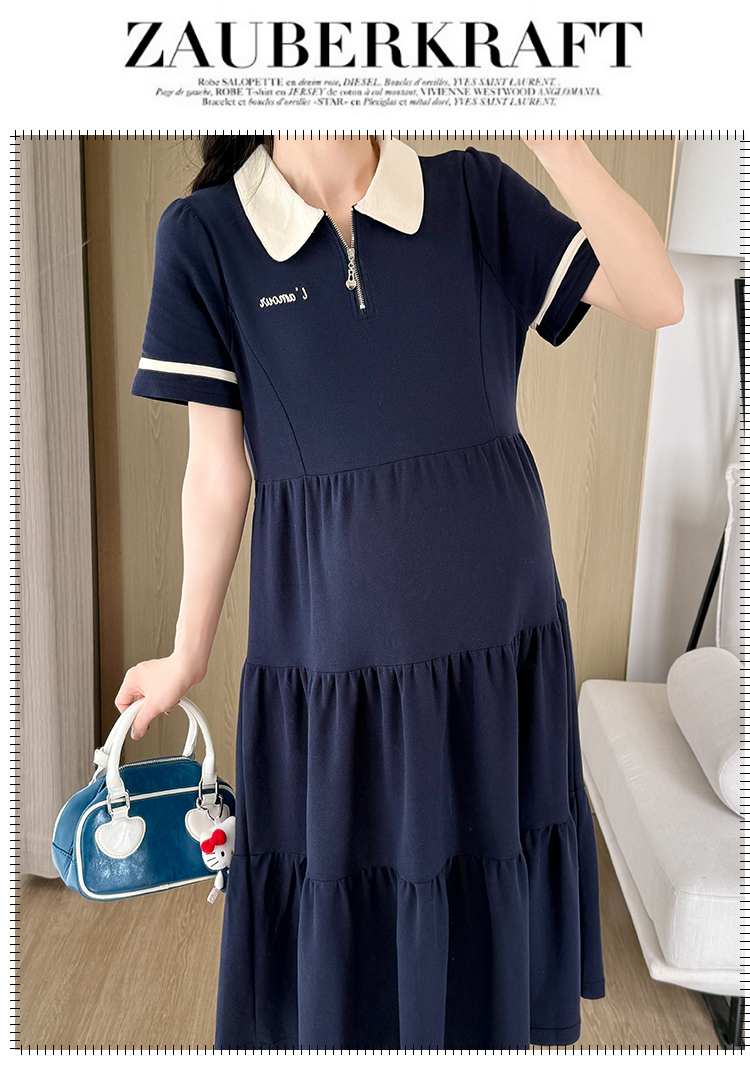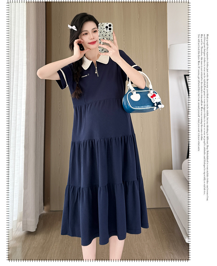 2026 실사 임산부 드레스 여름 새로운 해군 POLO 칼라 반팔 루즈핏 빅 사이즈 허리 수축 드레스