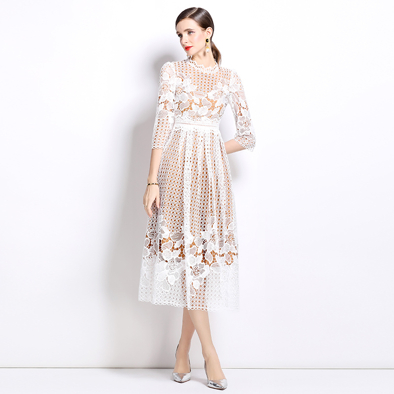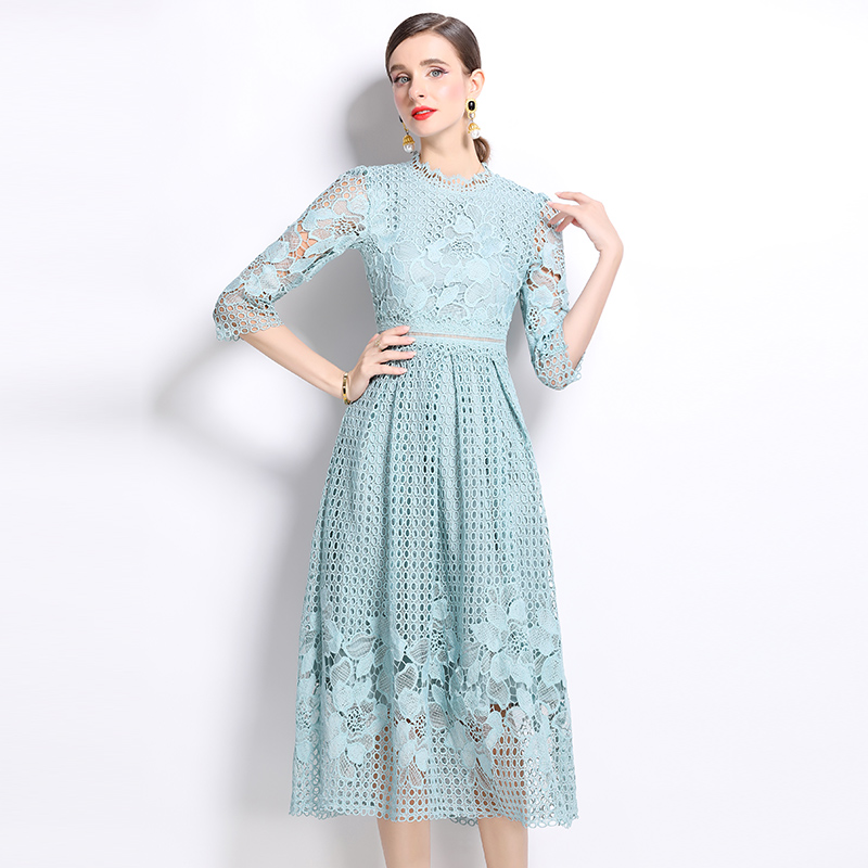 실사 오리지널 V넥 패션 슬림해 보이는 홀로우 아웃 물 용해 레이스 포지셔닝 중간 길이 드레스