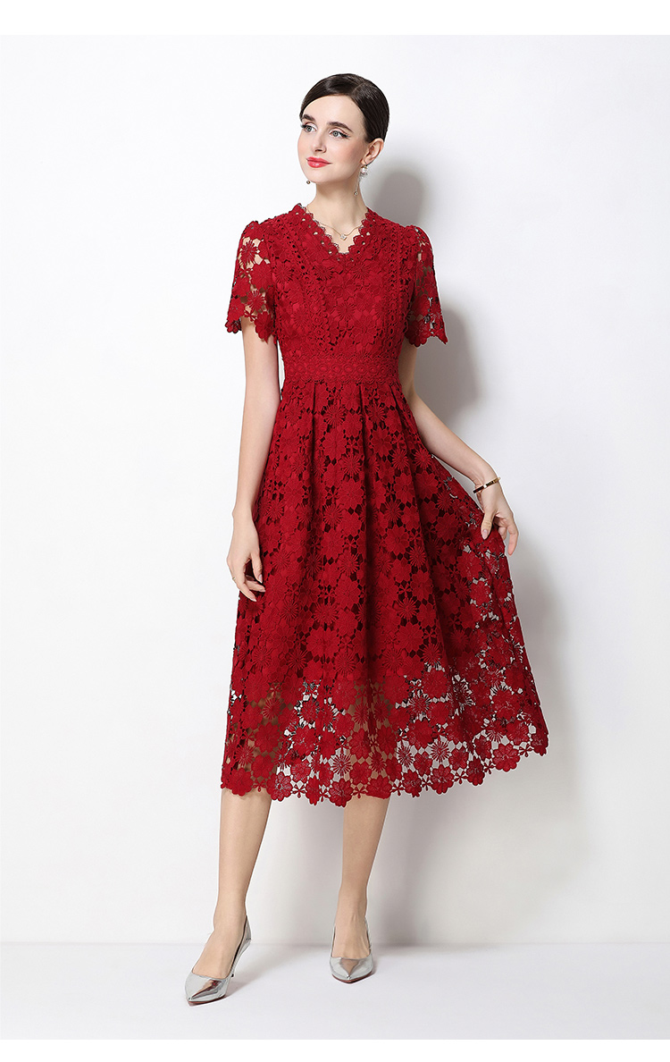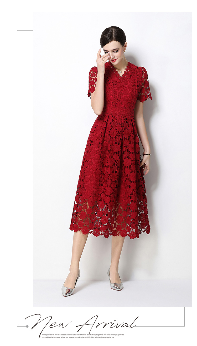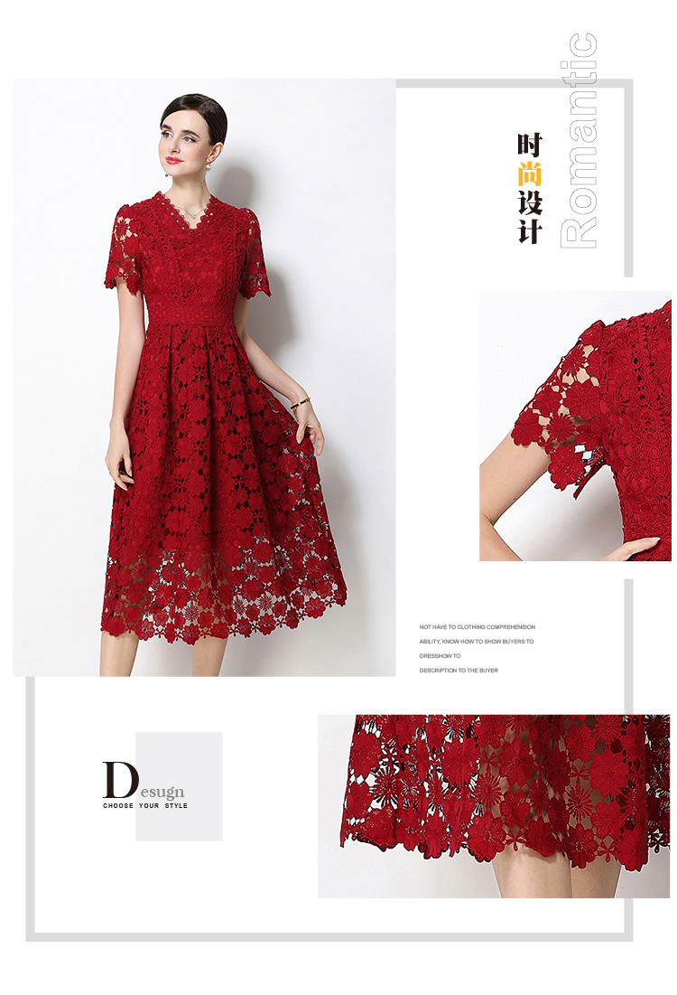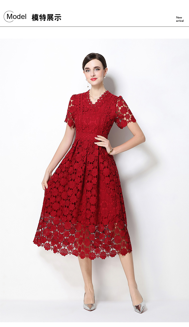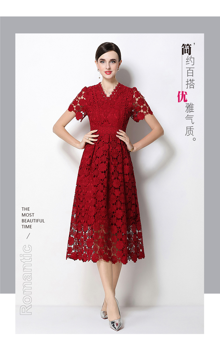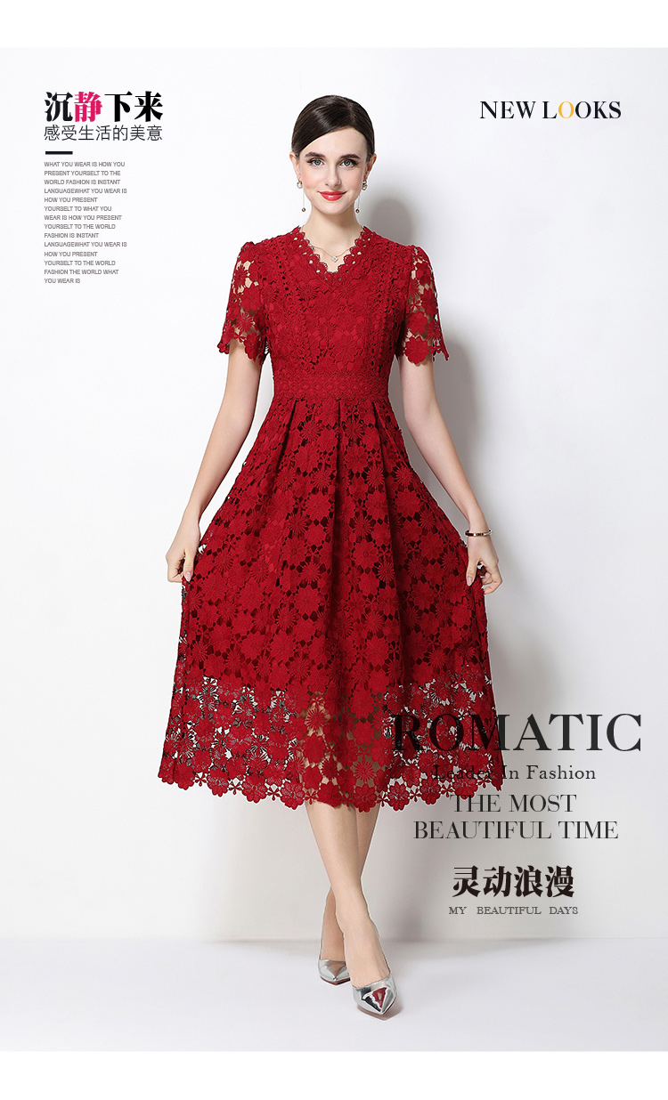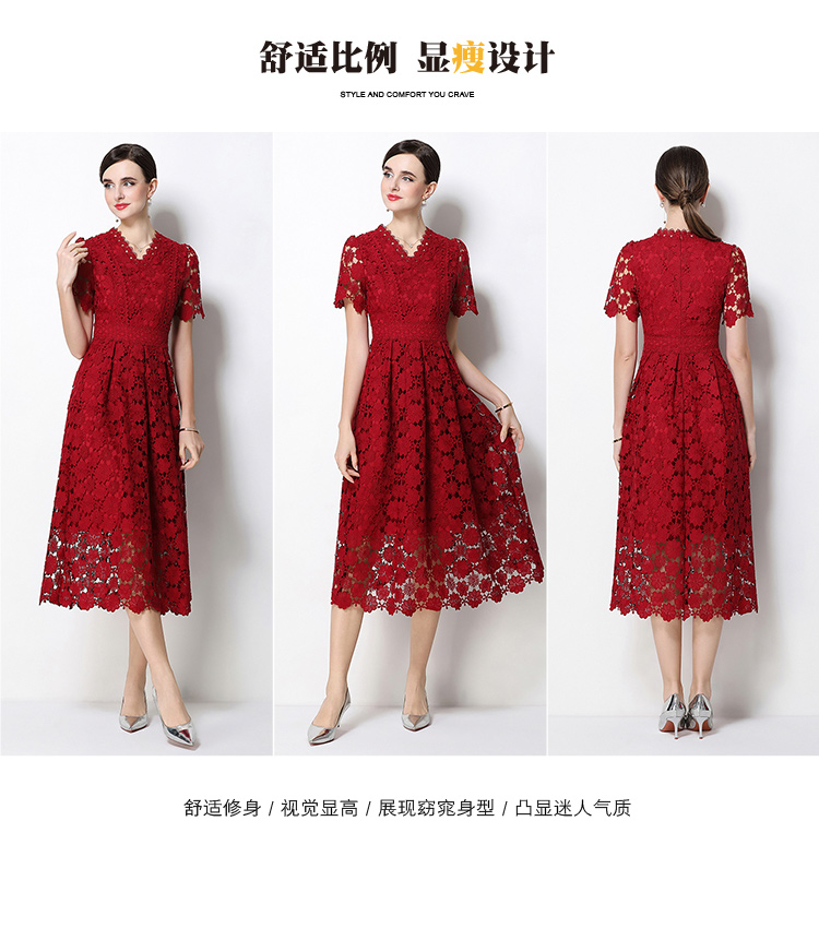 실사 오리지널 V넥 패션 슬림해 보이는 홀로우 아웃 물 용해 레이스 포지셔닝 중간 길이 드레스