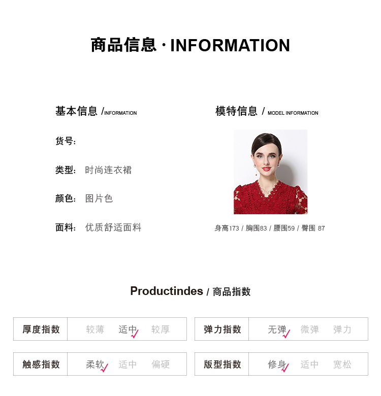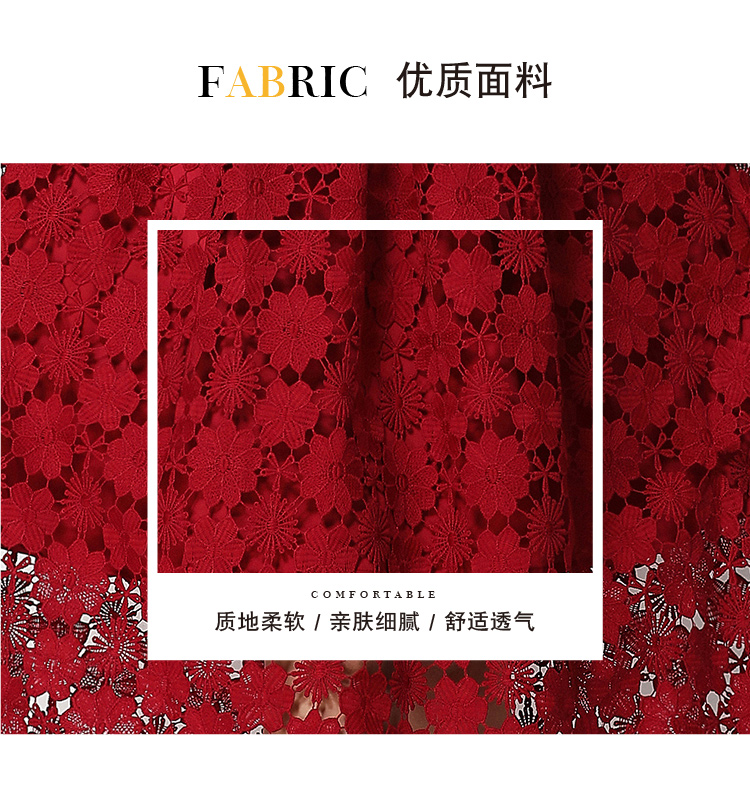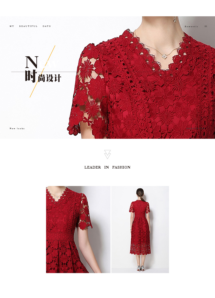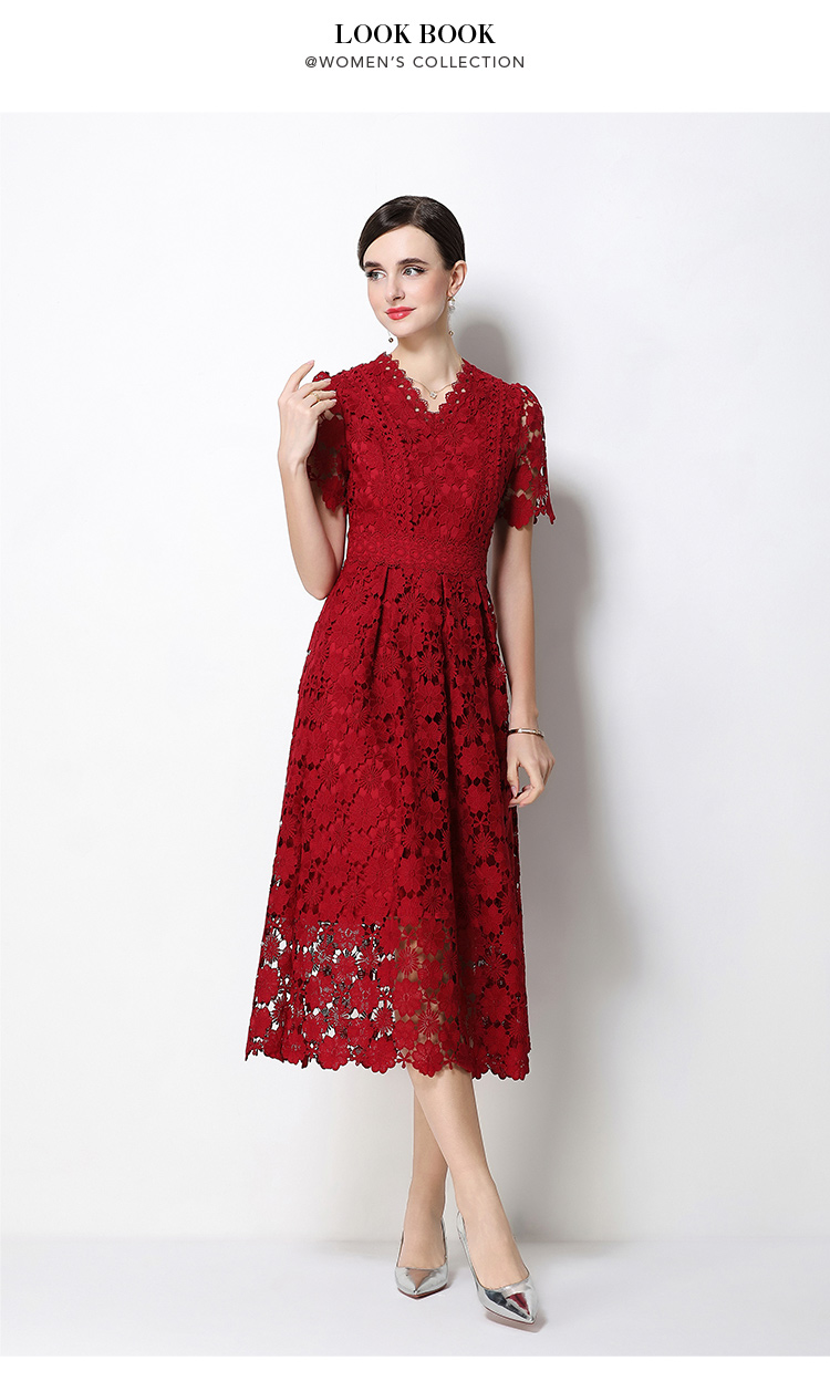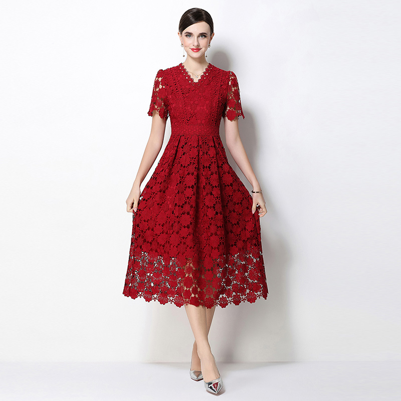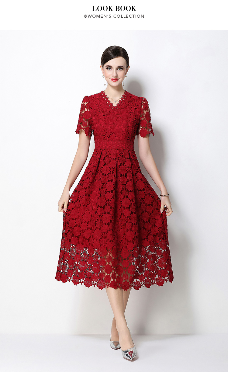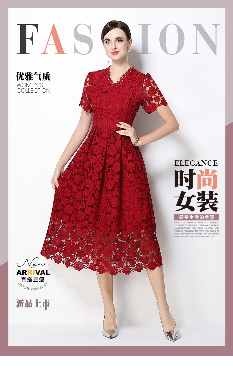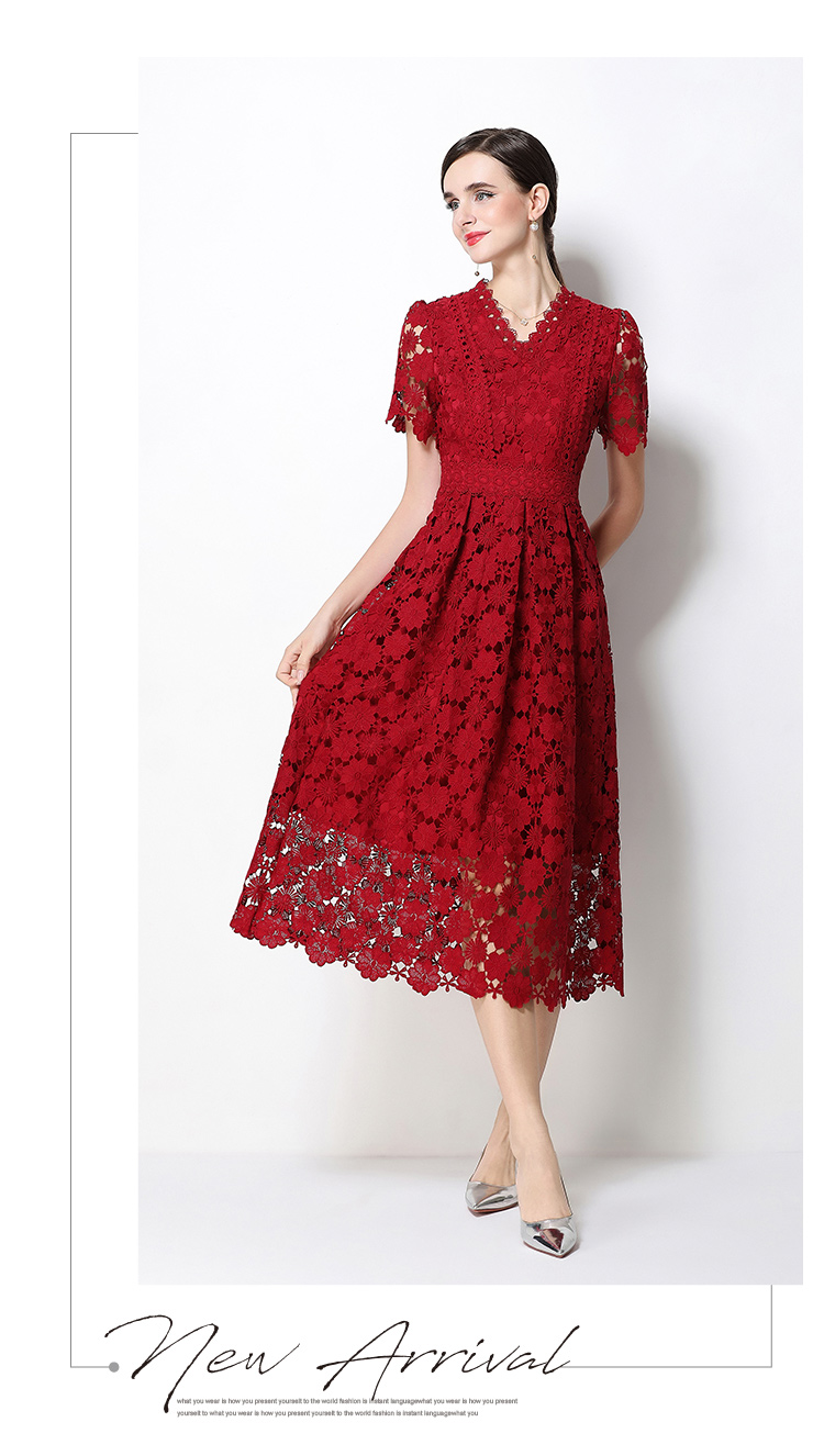 실사 오리지널 V넥 패션 슬림해 보이는 홀로우 아웃 물 용해 레이스 포지셔닝 중간 길이 드레스