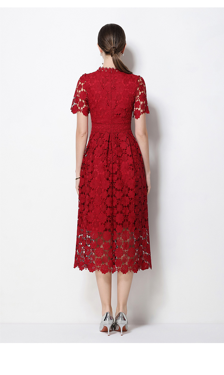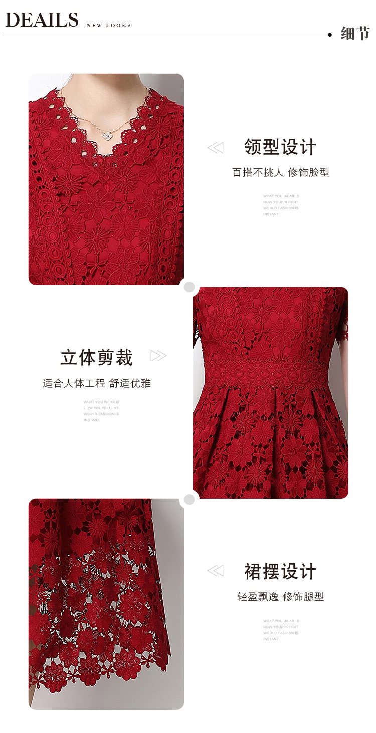 실사 반팔 슬림해 보이는 홀로우 아웃 물 용해 레이스 포지셔닝 중간 길이 드레스