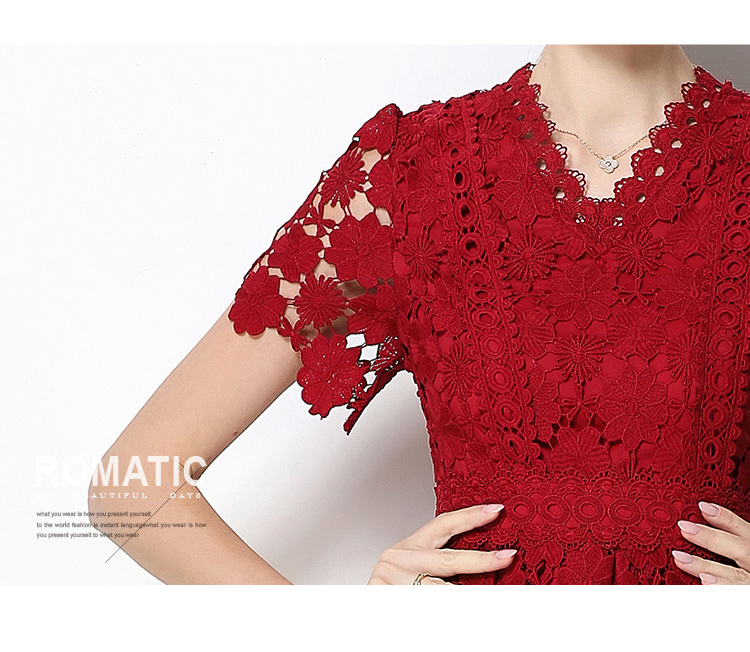 실사 반팔 슬림해 보이는 홀로우 아웃 물 용해 레이스 중간 길이 드레스