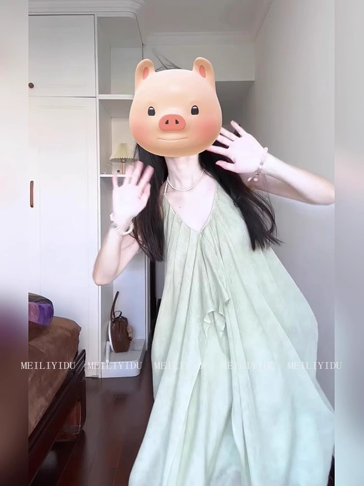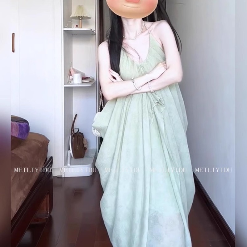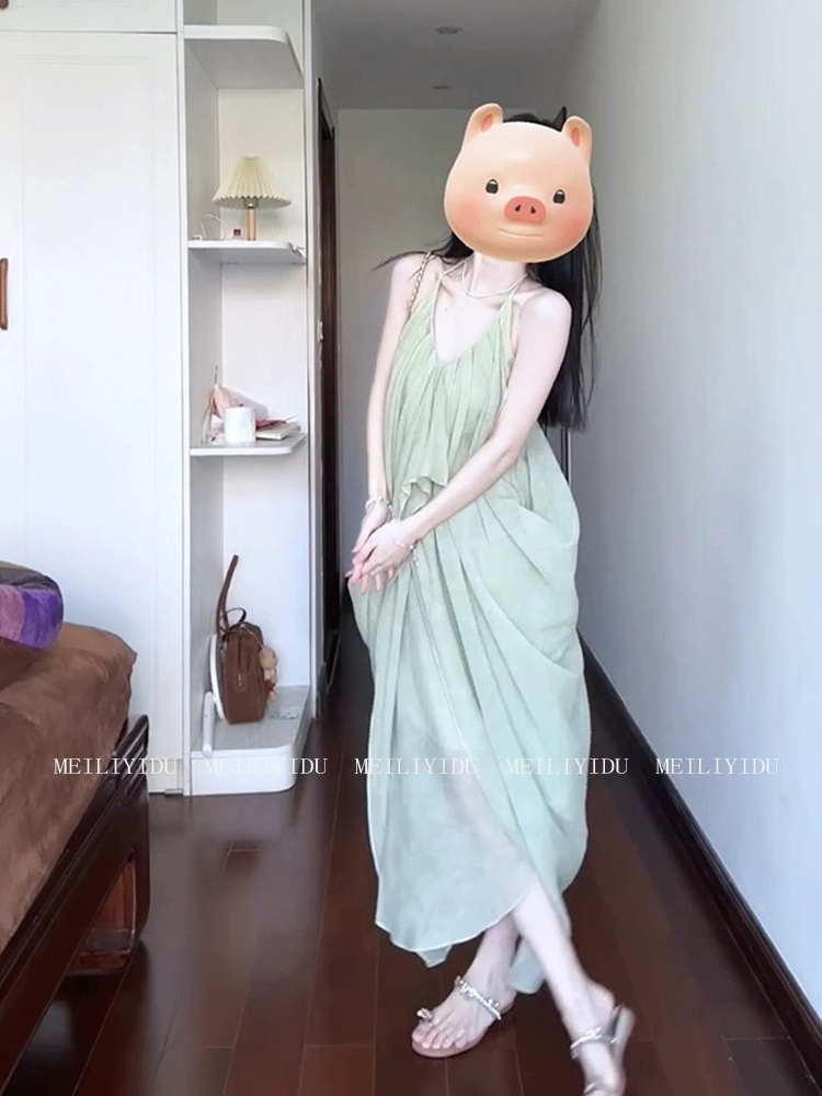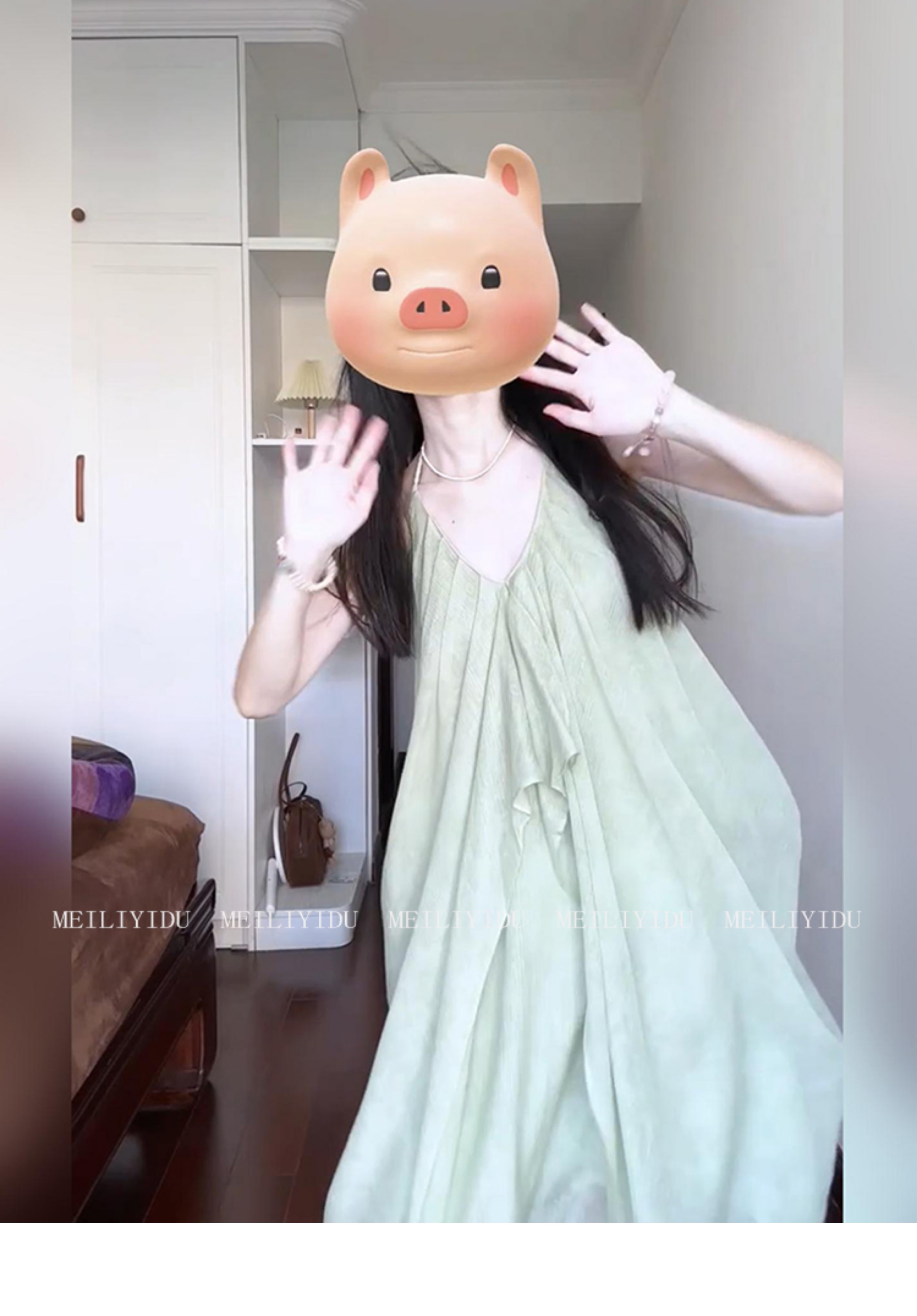 2026 빅 사이즈 프랑스식 녹색 V넥 행침 목 슬립 드레스 휴가 바람 요정 가스 우아한 해변가 치마