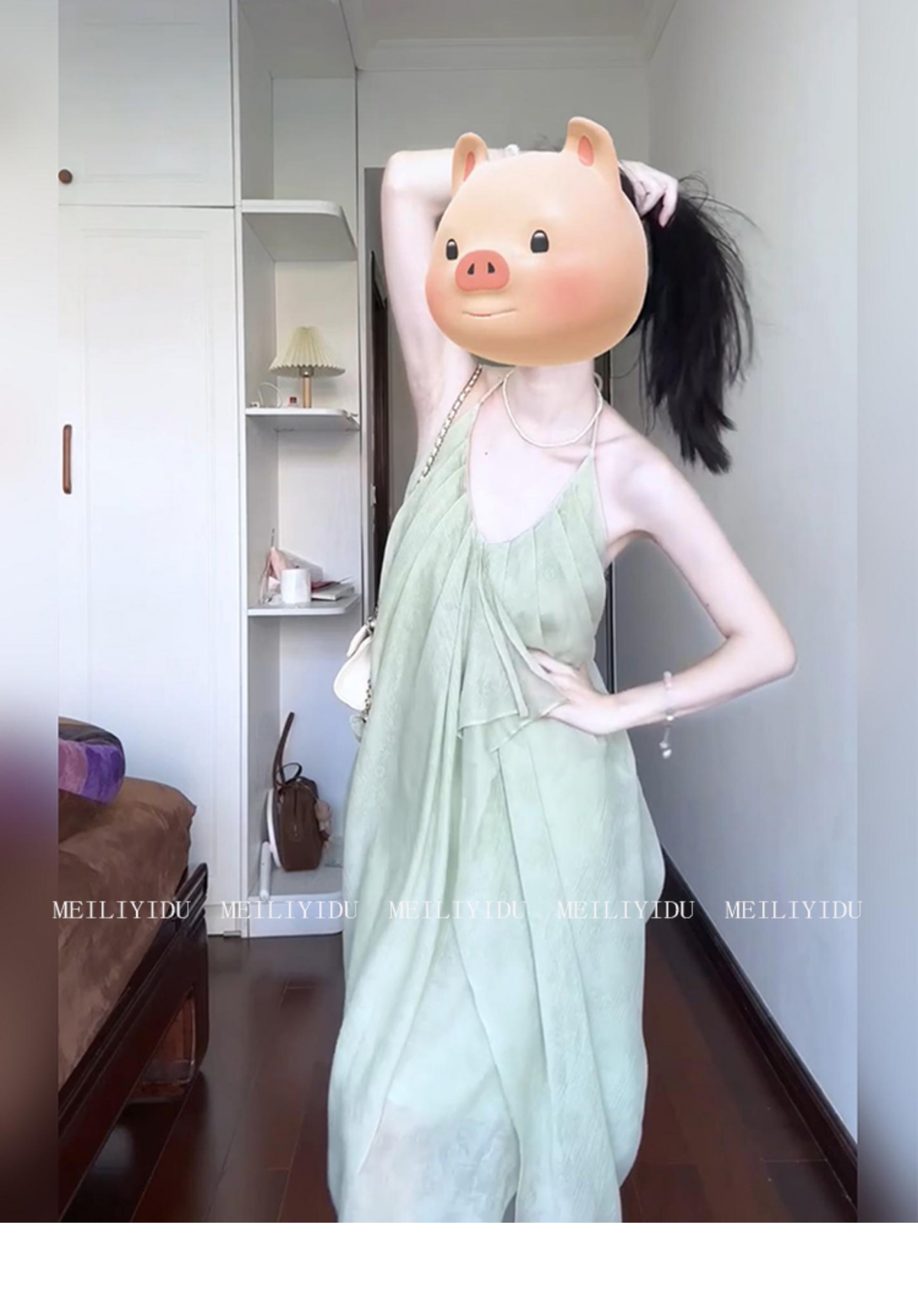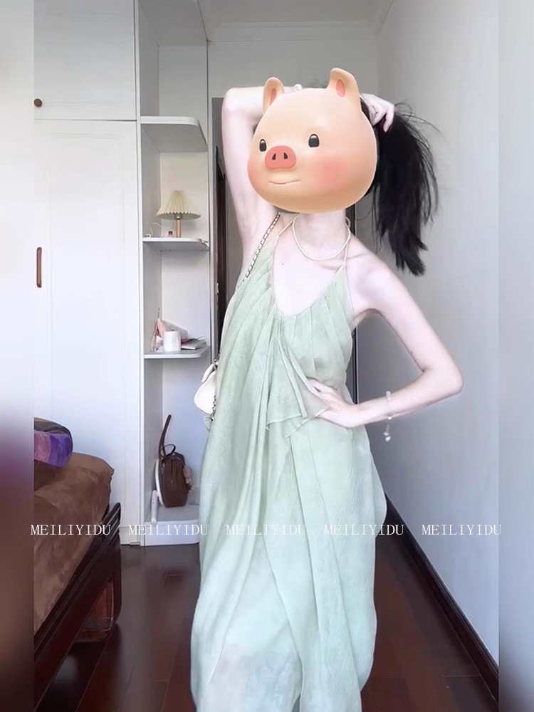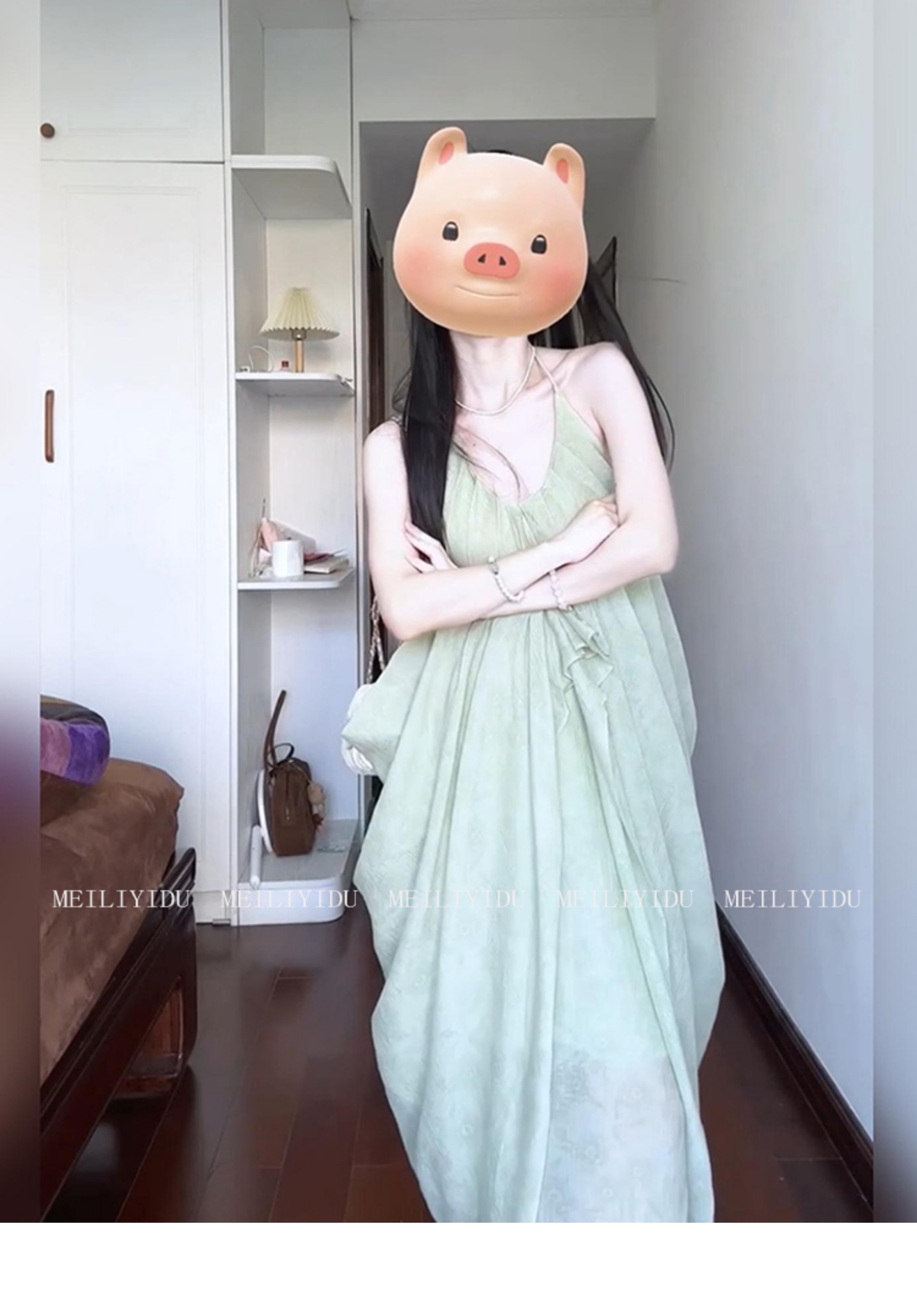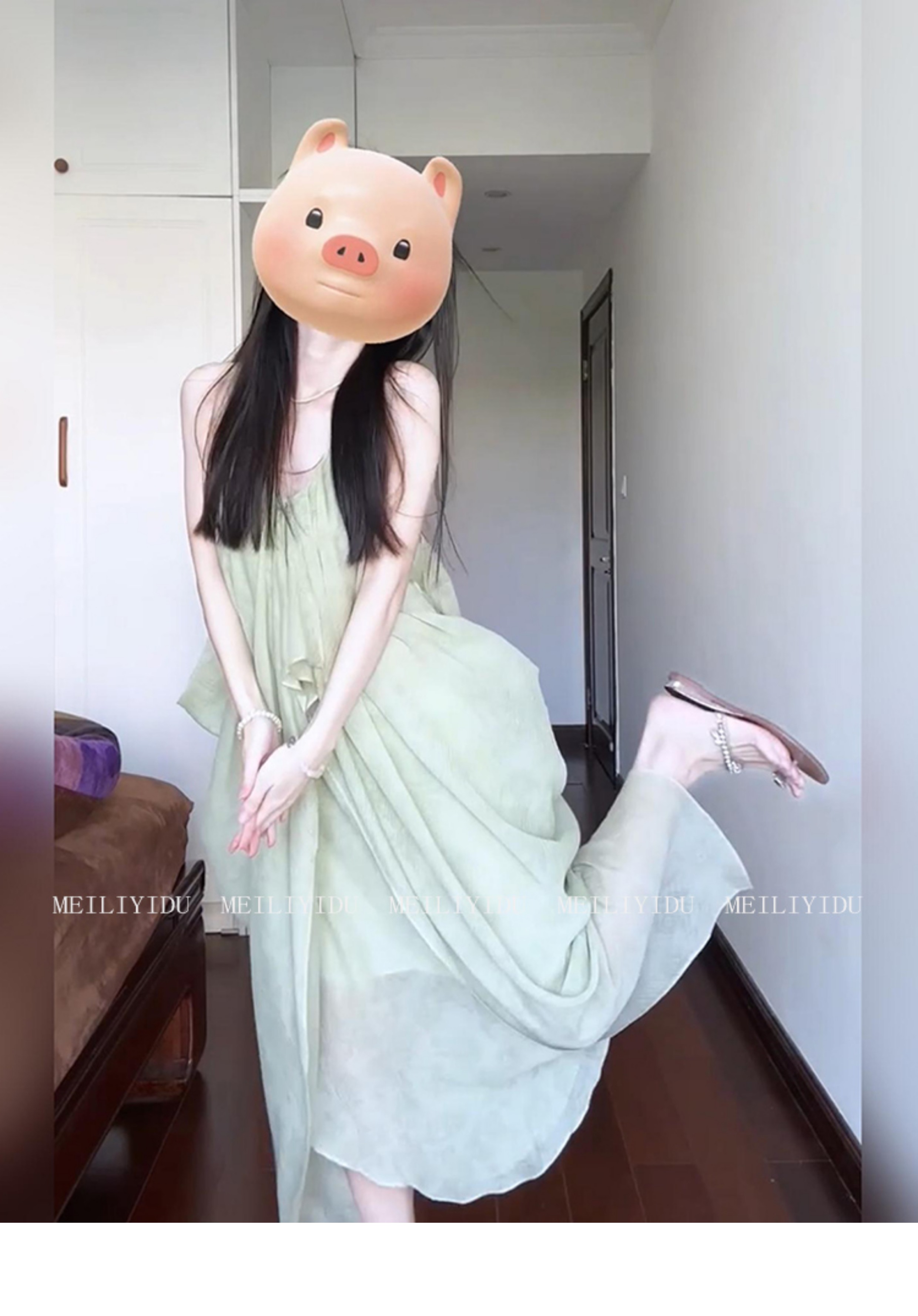 2026 빅 사이즈 프랑스식 녹색 V넥 행침 목 슬립 드레스 휴가 바람 요정 가스 우아한 해변가 치마