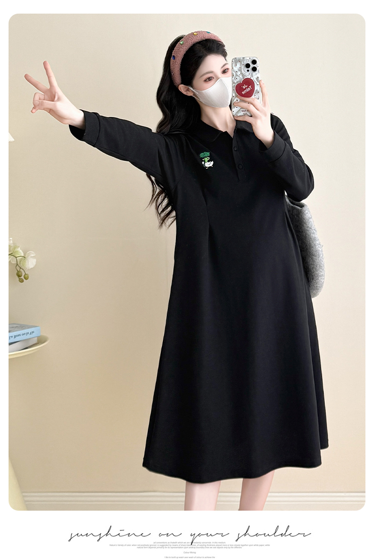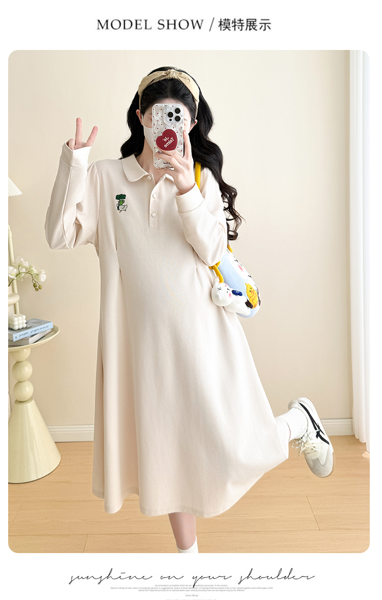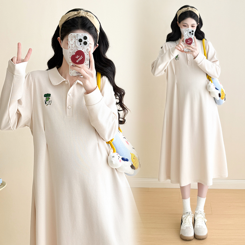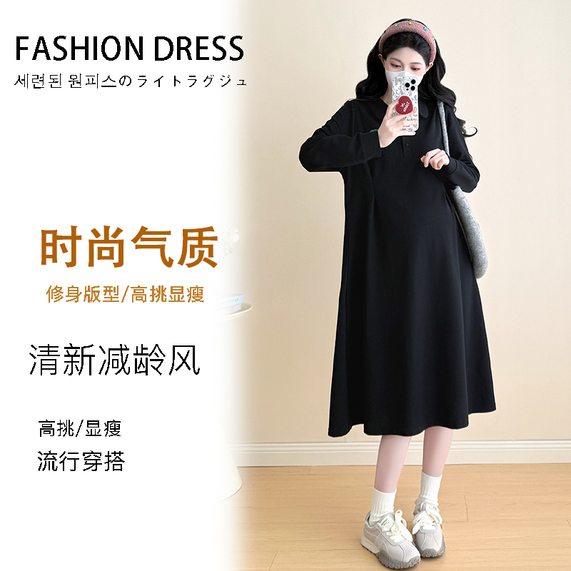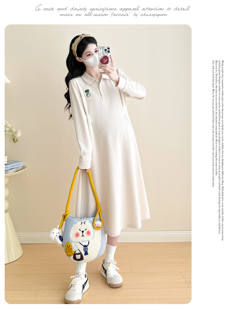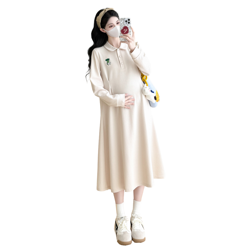 실사 2026 이른 봄 가을 새로운 슬림해 보이는 여성 자수 패키지 과립 버클 중간 길이 임산부 polo 드레스
