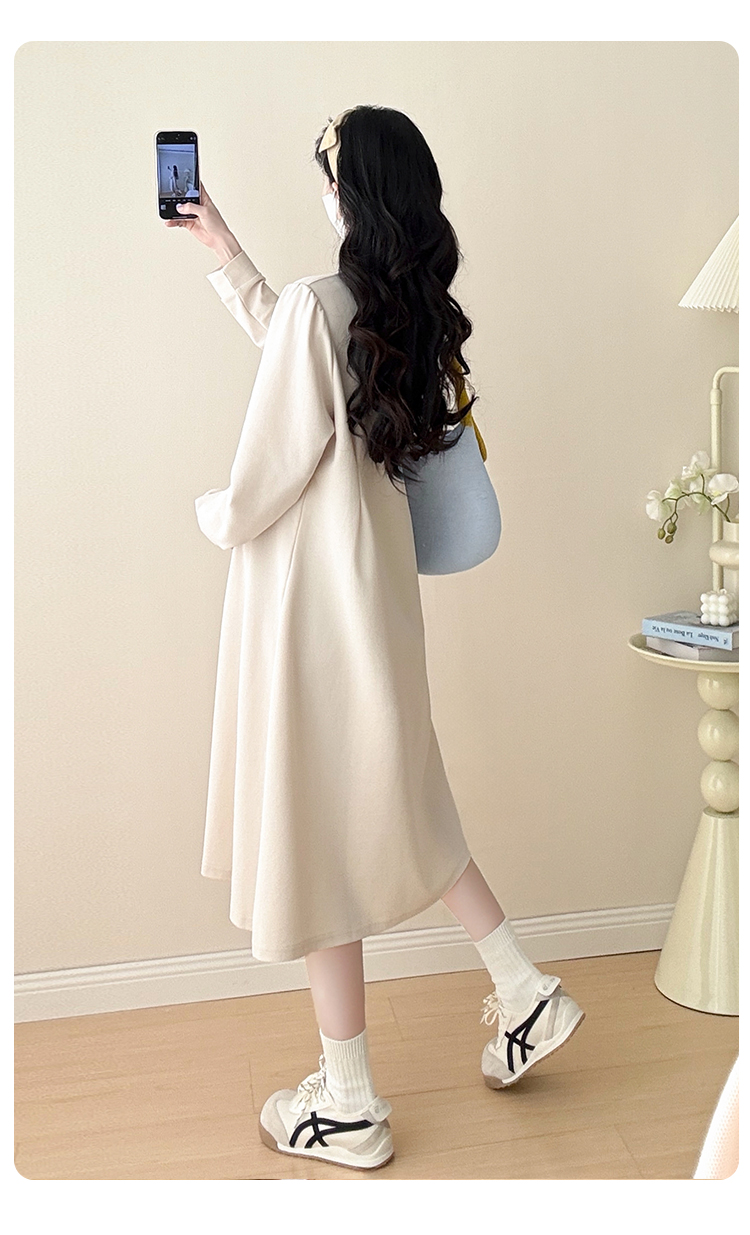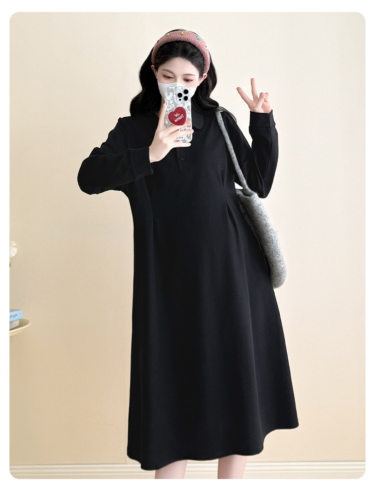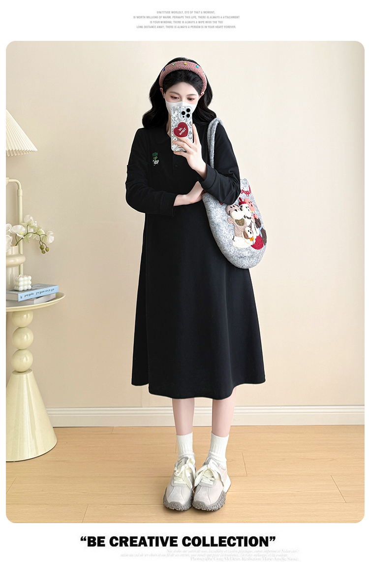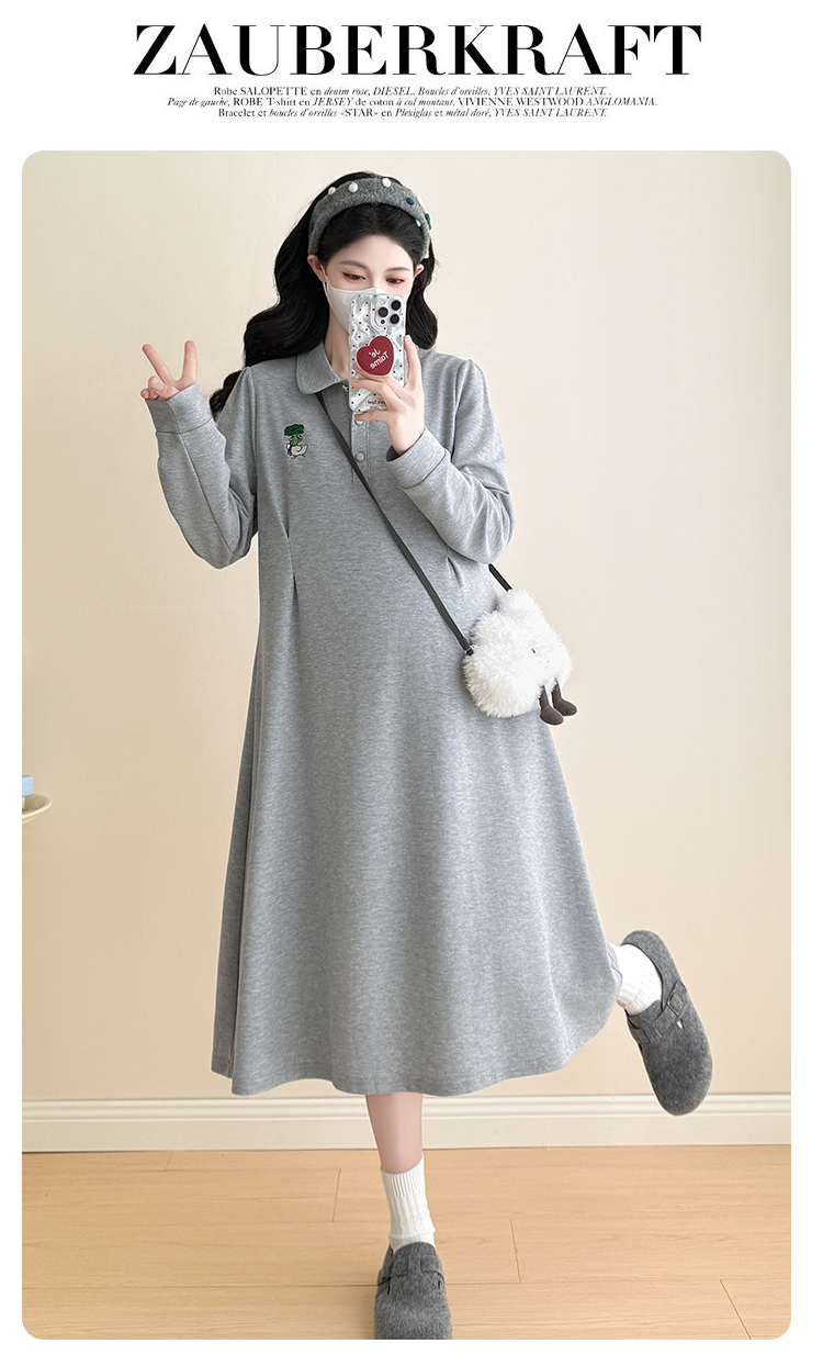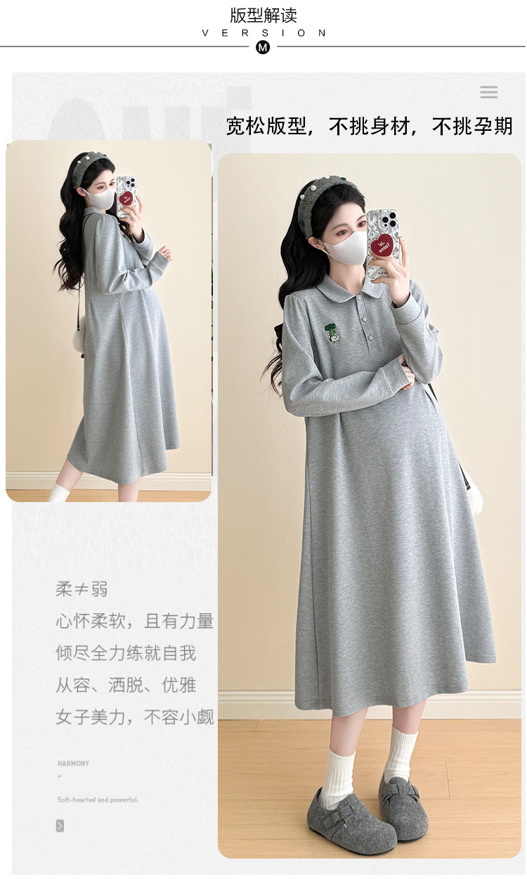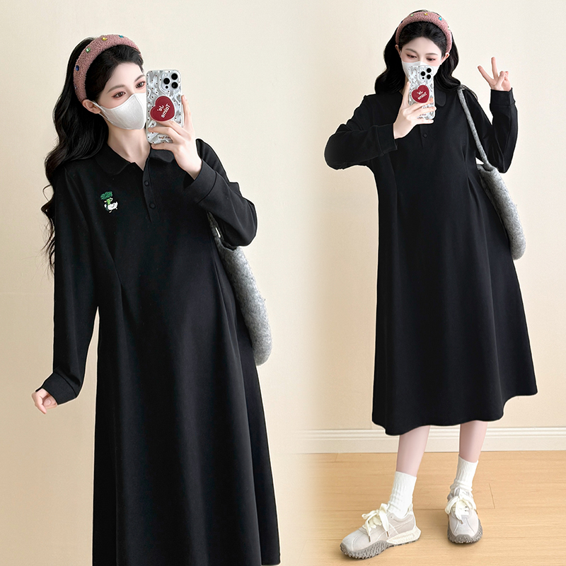 실사 2026 이른 봄 가을 새로운 슬림해 보이는 여성 자수 패키지 과립 버클 중간 길이 임산부 polo 드레스