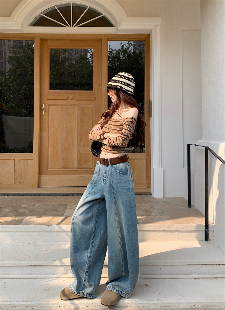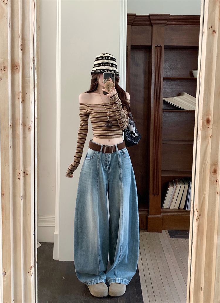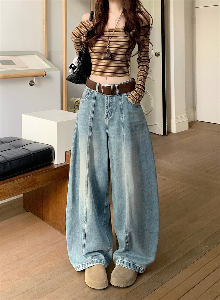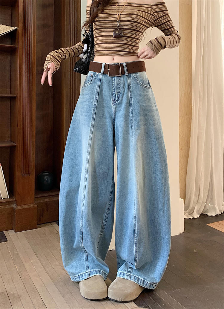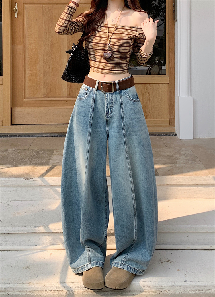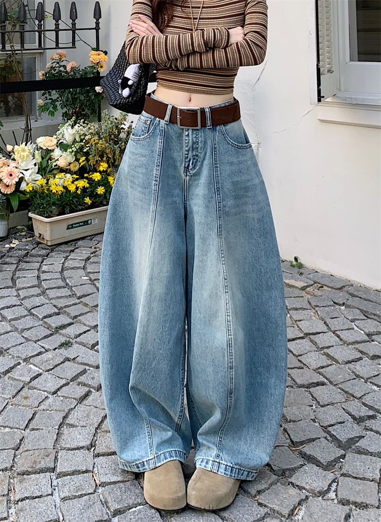 실사 아메리칸 레트로 넓은 다리 청바지 여성 새로운 하이웨이스트 슬림해 보이는 스트레이트 도루 센스 풍선 바닥 청소 긴 바지
