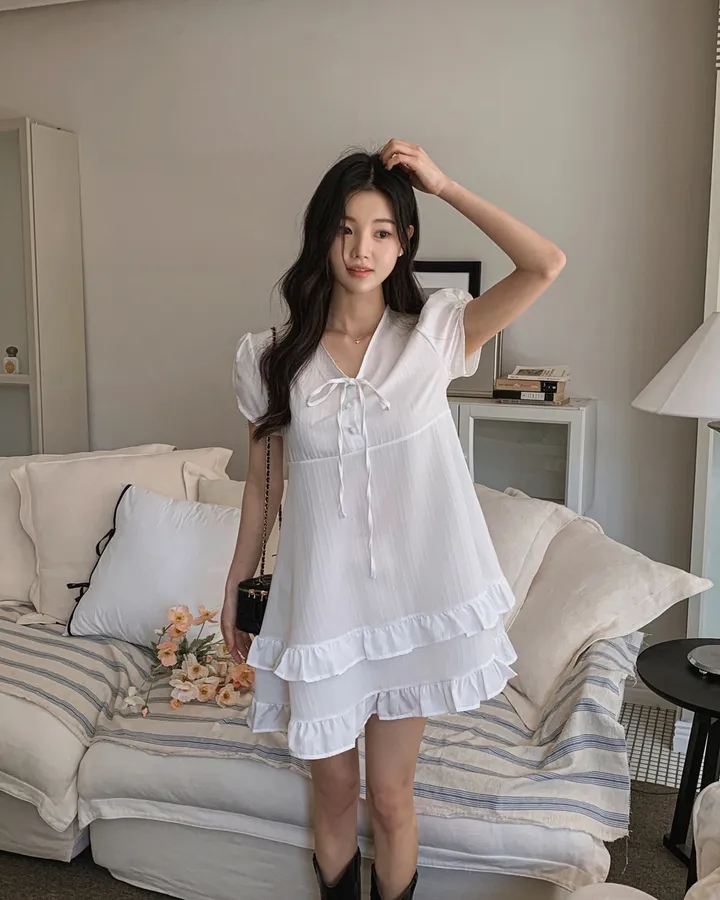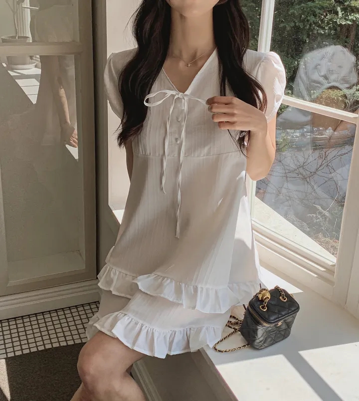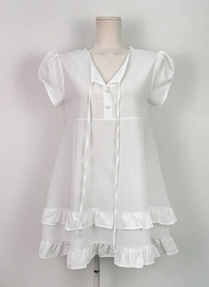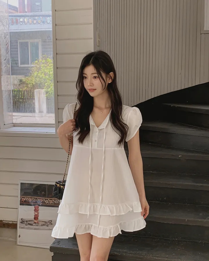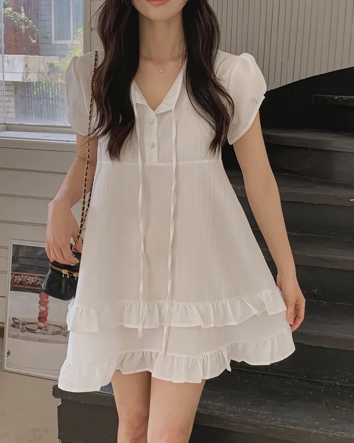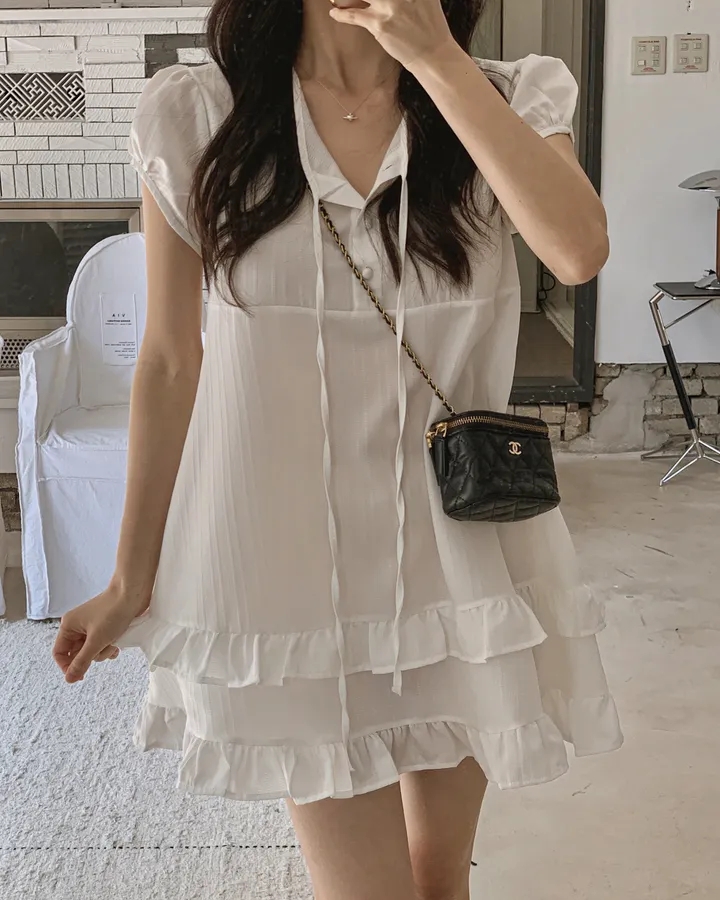 chic 한 부서 여름 부드러운 달콤함 이중층 프릴 레이스업 반 개방 칼라 작은 키 드레스