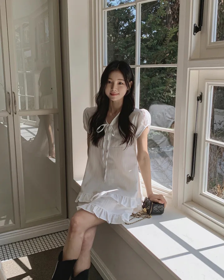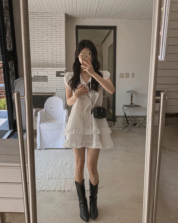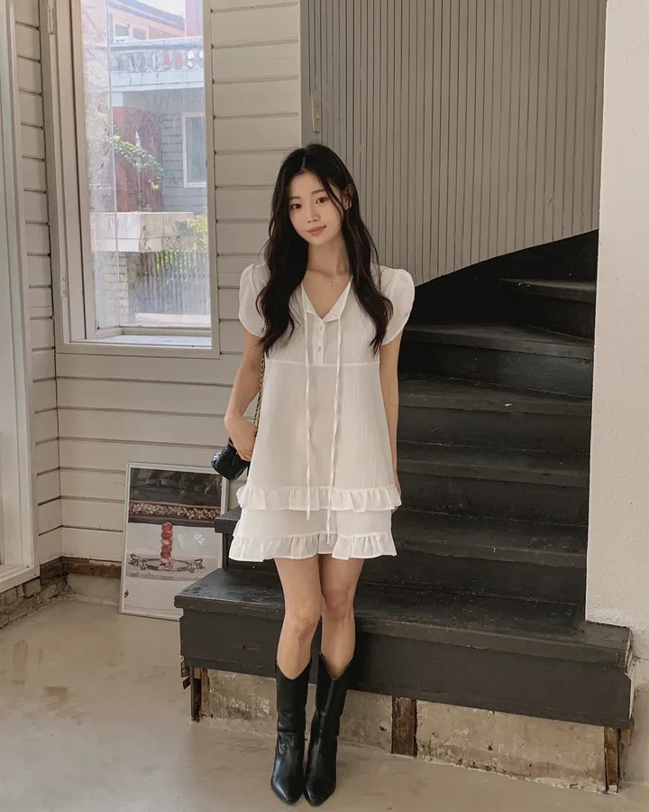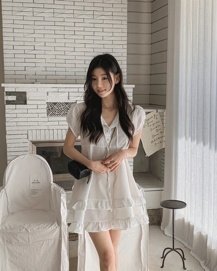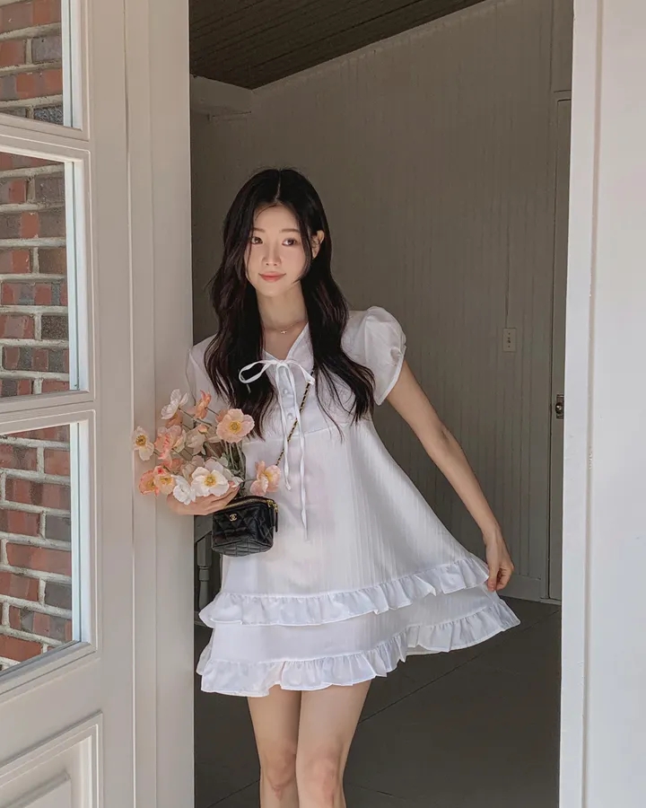 chic 한 부서 여름 부드러운 달콤함 이중층 프릴 레이스업 반 개방 칼라 작은 키 드레스