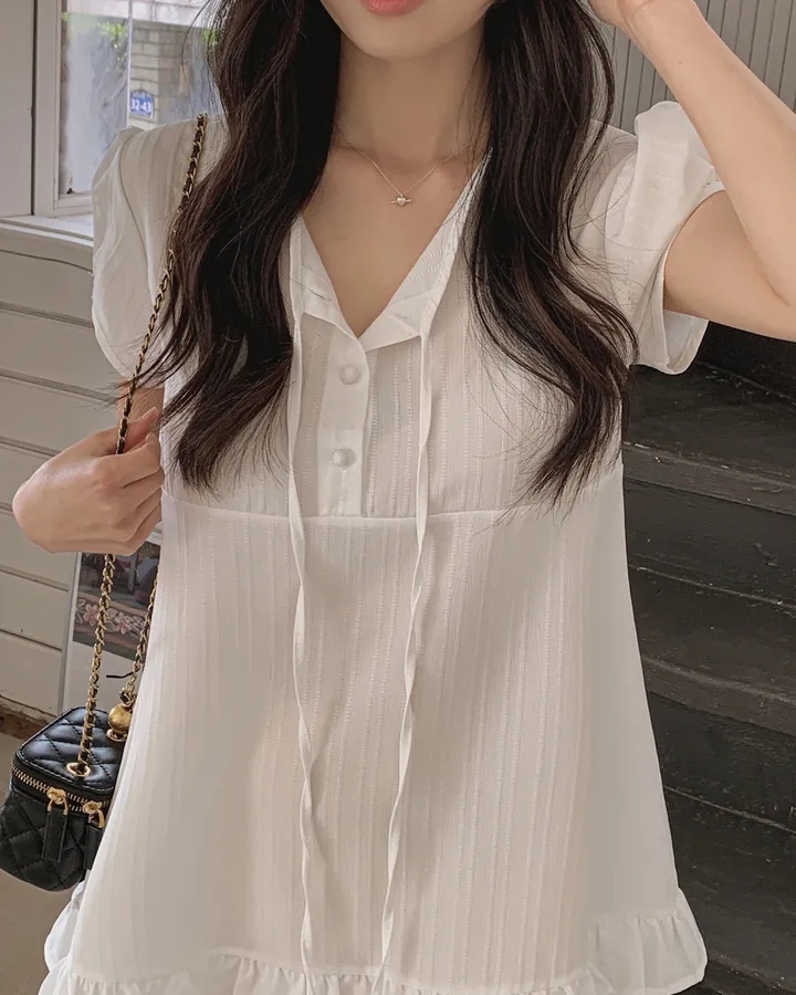 chic 한 부서 여름 부드러운 달콤함 나비 매듭 주름 장식 디자인 센스 Feifei 소매 패션 다용도 셔츠 맨위