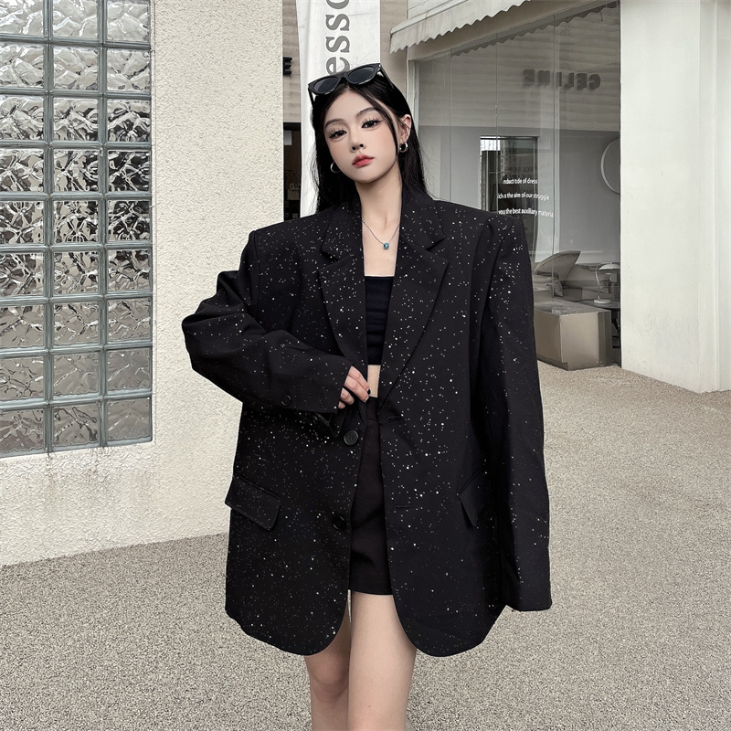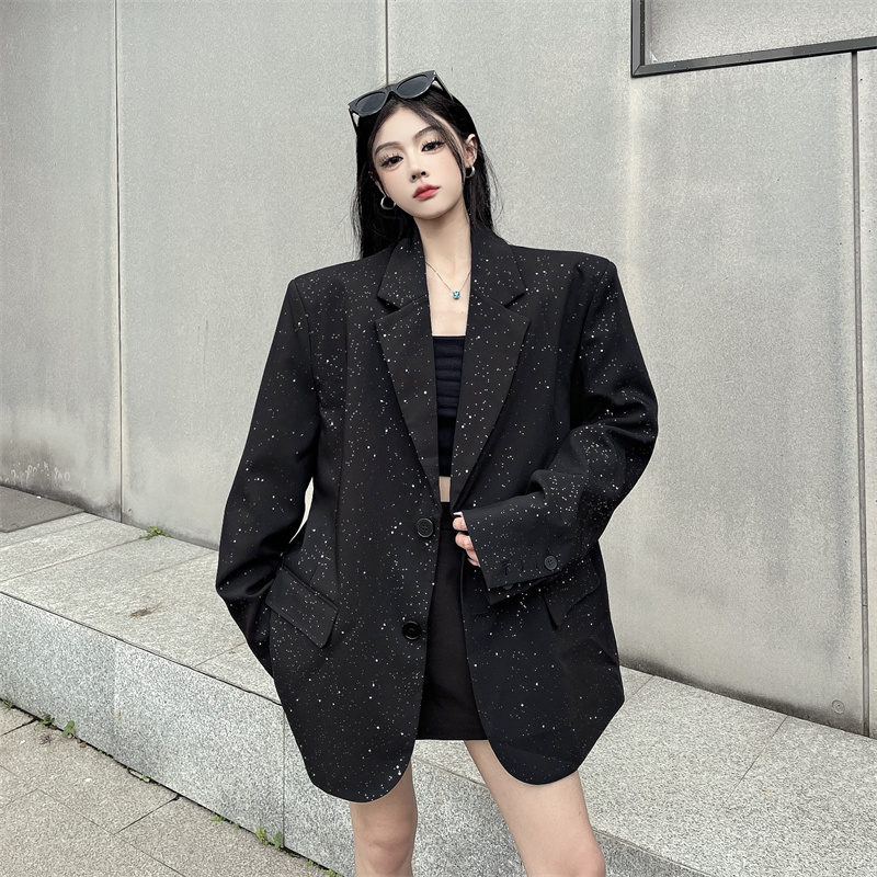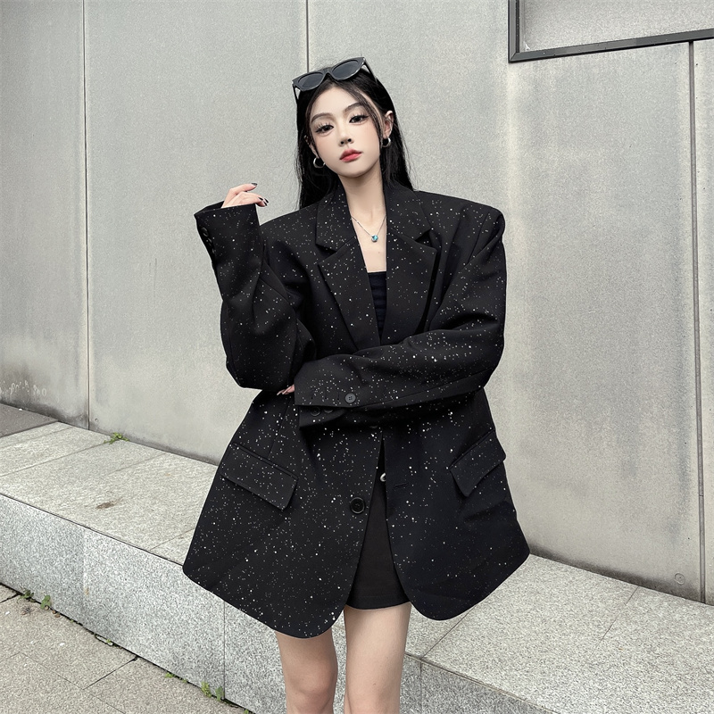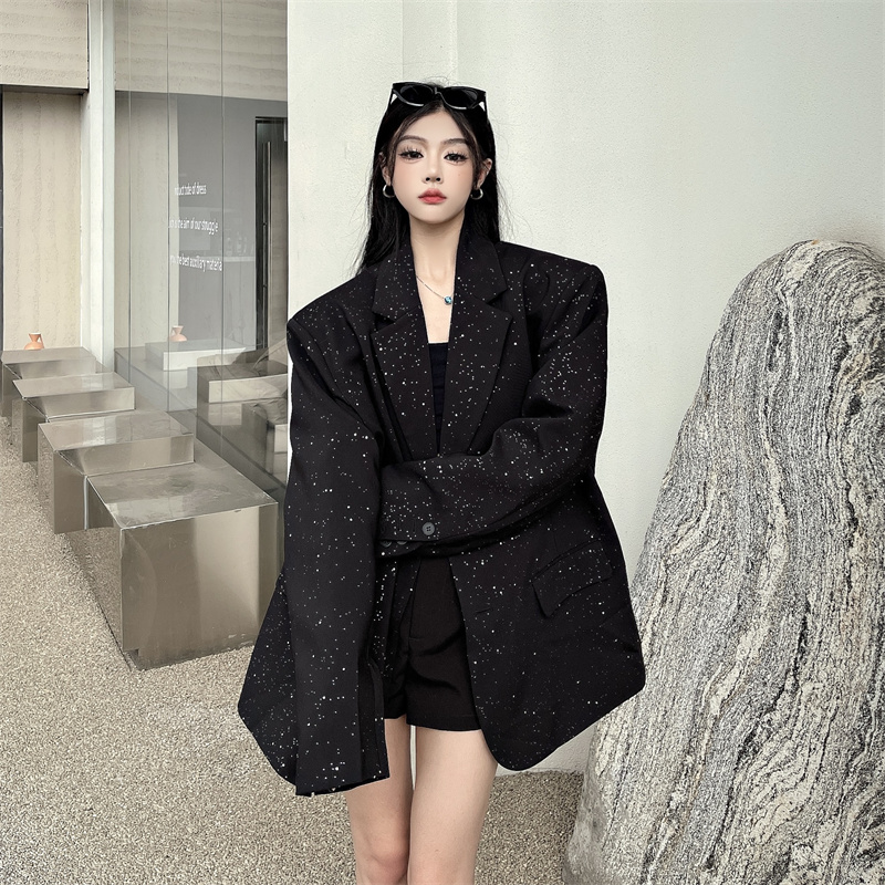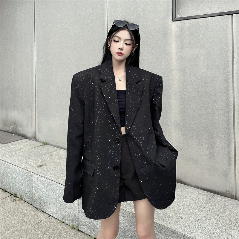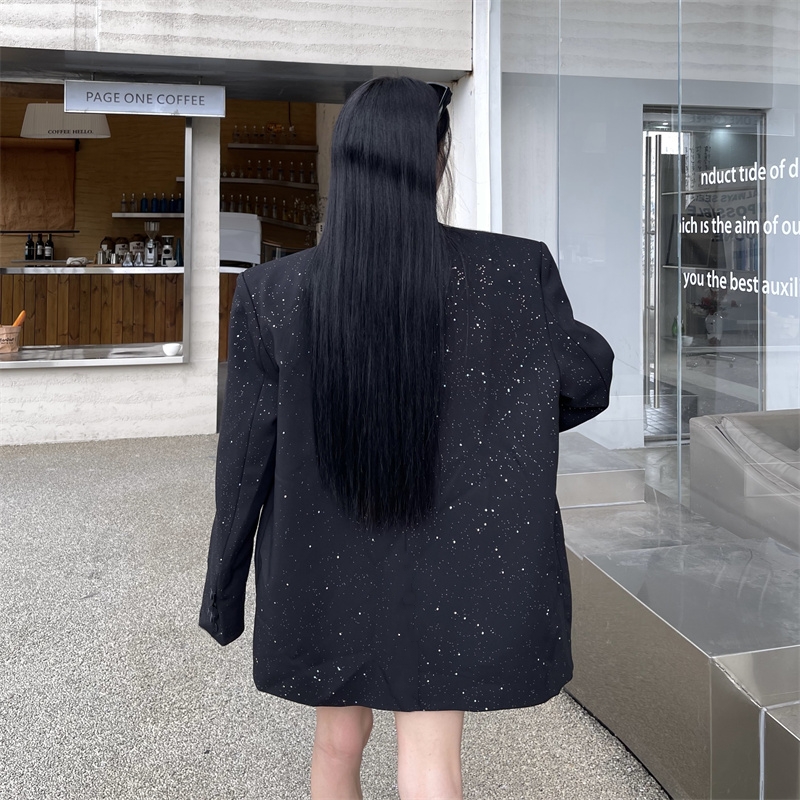 실사 Gypsophila 뿌리다 분말 디자인 센스 검정색 정장 여성 코트 다림질 금박 반짝임 고급 센스 정장 트렌디