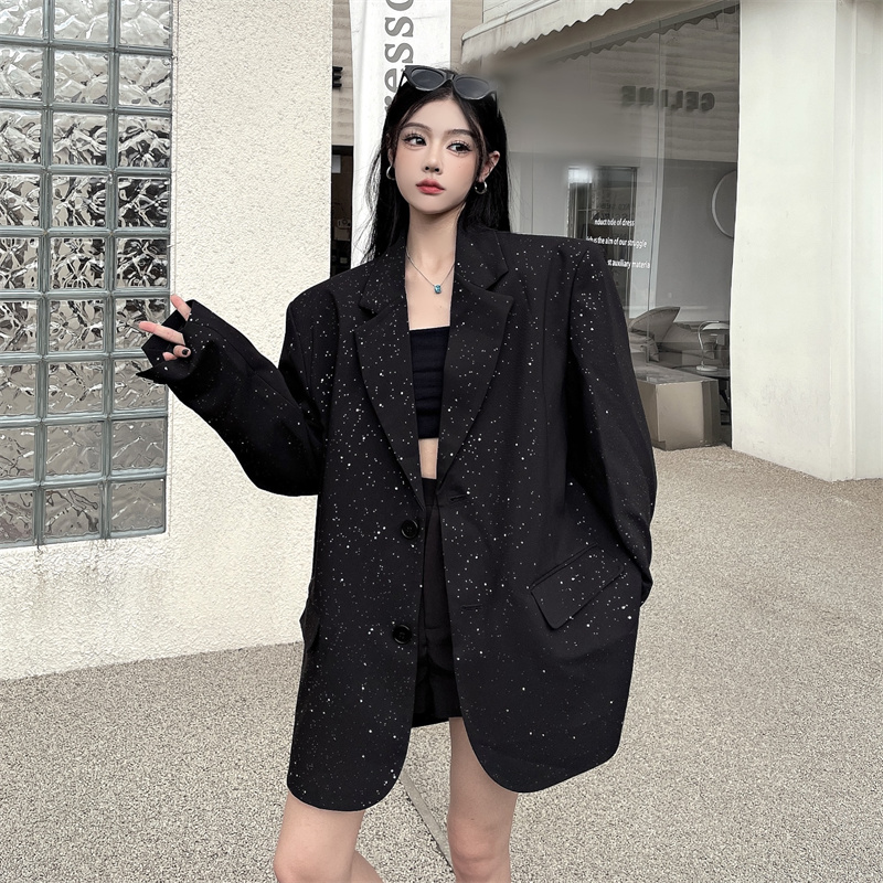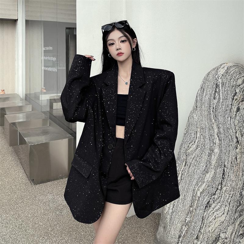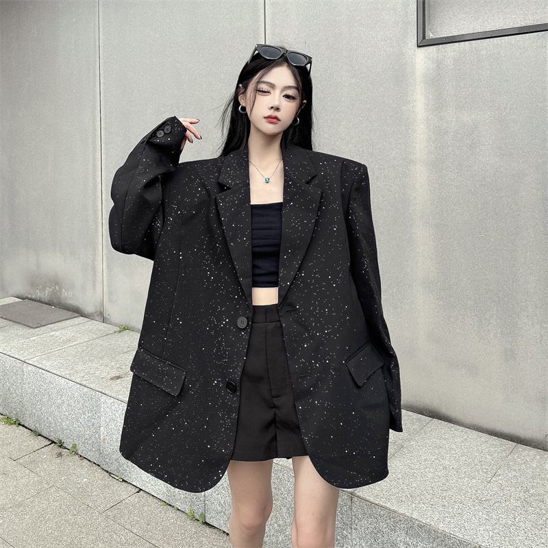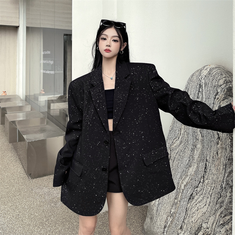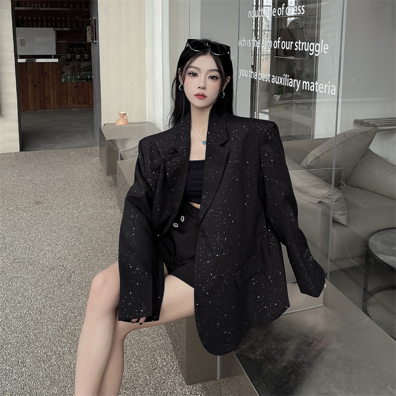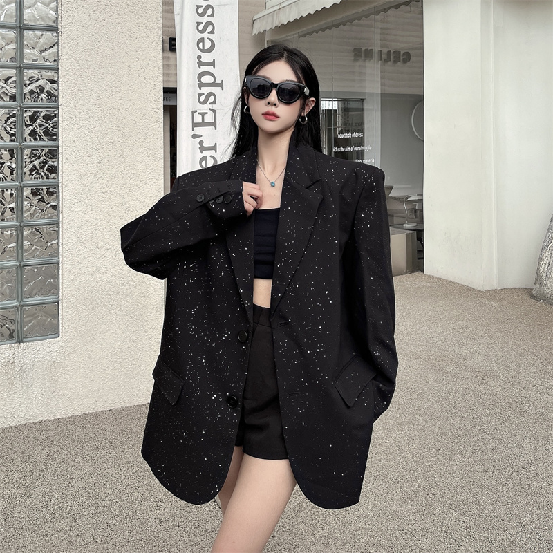실사 Gypsophila 뿌리다 분말 디자인 센스 검정색 정장 여성 코트 다림질 금박 반짝임 고급 센스 정장 트렌디