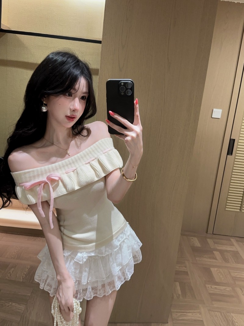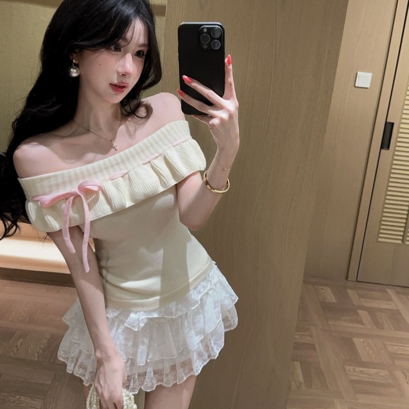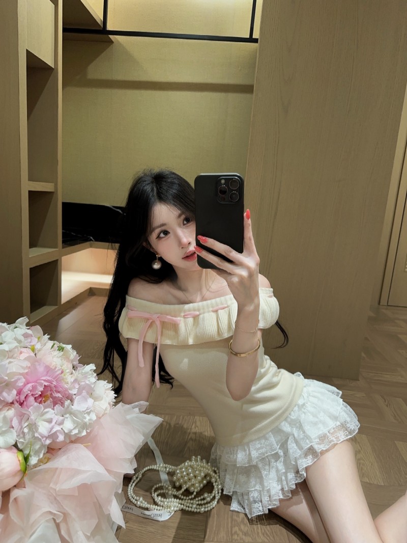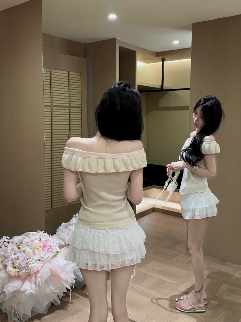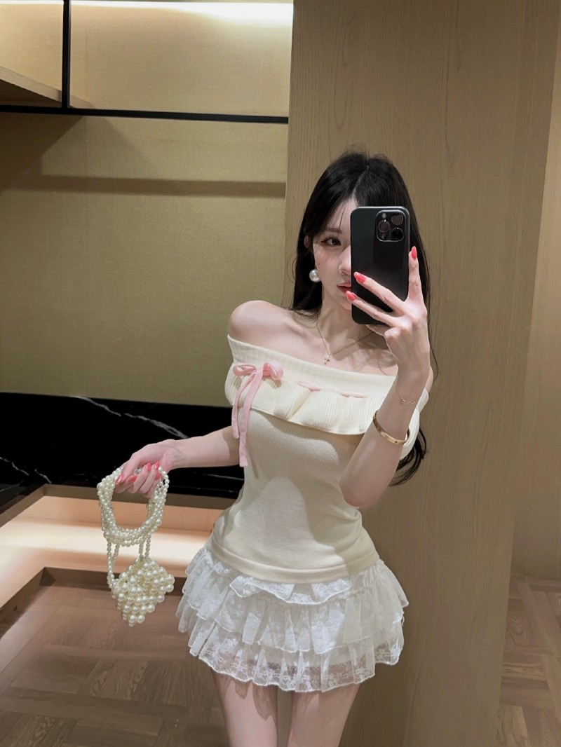 실사 정가 감소되지 않음 부드러운 찹쌀 오프숄더 둘 착용 프릴 맨위 레이 실크 허리 수축 미니 스커트